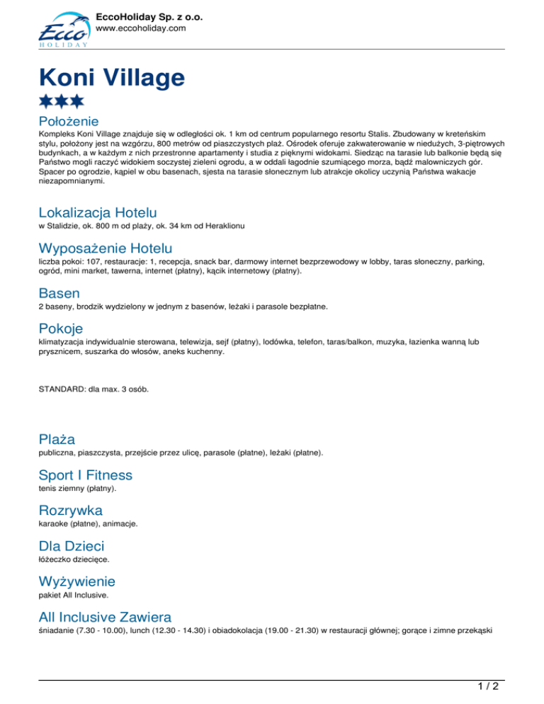 EccoHoliday Sp. z o.o. www.eccoholiday.com Koni Village Położenie Kompleks Koni Village znajduje się w odległości ok. 1 km od centrum popularnego resortu Stalis. Zbudowany w kreteńskim stylu, położony jest na wzgórzu, 800 metrów od piaszczystych plaż. Ośrodek oferuje zakwaterowanie w niedużych, 3-piętrowych budynkach, a w każdym z nich przestronne apartamenty i studia z pięknymi widokami. Siedząc na tarasie lub balkonie będą się Państwo mogli raczyć widokiem soczystej zieleni ogrodu, a w oddali łagodnie szumiącego morza, bądź malowniczych gór. Spacer po ogrodzie, kąpiel w obu basenach, sjesta na tarasie słonecznym lub atrakcje okolicy uczynią Państwa wakacje niezapomnianymi. Lokalizacja Hotelu w Stalidzie, ok. 800 m od plaży, ok. 34 km od Heraklionu Wyposażenie Hotelu liczba pokoi: 107, restauracje: 1, recepcja, snack bar, darmowy internet bezprzewodowy w lobby, taras słoneczny, parking, ogród, mini market, tawerna, internet (płatny), kącik internetowy (płatny). Basen 2 baseny, brodzik wydzielony w jednym z basenów, leżaki i parasole bezpłatne. Pokoje klimatyzacja indywidualnie sterowana, telewizja, sejf (płatny), lodówka, telefon, taras/balkon, muzyka, łazienka wanną lub prysznicem, suszarka do włosów, aneks kuchenny. STANDARD: dla max. 3 osób. Plaża publiczna, piaszczysta, przejście przez ulicę, parasole (płatne), leżaki (płatne). Sport I Fitness tenis ziemny (płatny). Rozrywka karaoke (płatne), animacje. Dla Dzieci łóżeczko dziecięce. Wyżywienie pakiet All Inclusive. All Inclusive Zawiera śniadanie (7.30 - 10.00), lunch (12.30 - 14.30) i obiadokolacja (19.00 - 21.30) w restauracji głównej; gorące i zimne przekąski 1/2 EccoHoliday Sp. z o.o. www.eccoholiday.com (11.00 - 12.00); podwieczorek, kawa, herbata (16.00 - 17.00); napoje bezalkoholowe oraz lokalne alkohole (10.00 - 23.00). Oferta: Wylot 01.01.1970 Powrót 01.01.1970 godz. godz. Zakwaterowanie -() Dni dni Cena os. dorosła 2/2 Powered by TCPDF (www.tcpdf.org)