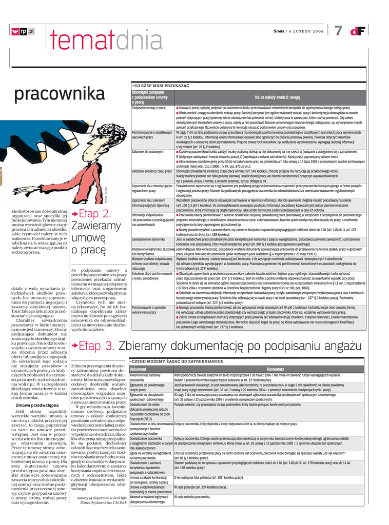 ◊ rp .pl tematdnia pracownika Środa | 6 lutego 2008 7 >CO SZEF MUSI PRZEKAZAĆ Obowiązki związane z podpisaniem umowy o pracę Na co należy zwrócić uwagę PAWEŁ GAŁKA Podpisanie umowy o pracę kle dostosowane do konkretnej organizacji oraz specyfiki jej funkcjonowania. Tym niemniej można wyróżnić główne etapy procesu zatrudnienia i określić, jakie czynności należy w nich realizować. Przedstawiamy je w tabeli na str. 6, wskazując, na co należy zwracać uwagę z punktu widzenia prawa. działa z wolą wywołania jakichkolwiek skutków prawnych. Jest on raczej zaproszeniem do podjęcia negocjacji i zawarcia określonej umowy. Treść takiego listu może przedstawiać się następująco. Charakter oświadczenia pracodawcy w liście intencyjnym nie jest stanowczy. Strony podpisujące dokument nie zmierzają do określonego skutku prawnego. Nie rodzi to obowiązku zawarcia umowy w razie złożenia przez adresata oferty lub podjęcia negocjacji. Do oświadczeń tego rodzaju nie stosujemy przepisów o czynnościach prawnych (dotyczących zdolności do czynności prawnych, wad oświadczenia woli itp.). W szczególności składający oświadczenie w takiej formie może je w każdej chwili odwołać. Umowa przedwstępna Jeśli strony uzgodniły wszystkie warunki umowy, a nie chcą z jakichś przyczyn jej zawrzeć, to mogą poprzestać na razie na umowie przedwstępnej. Jest ona w przeciwieństwie do listu intencyjnego zdarzeniem prawnym. Przez tę umowę strony zobowiązują się do zawarcia oznaczonej umowy ostatecznej, np. konkretnej umowy o pracę. Dla swej skuteczności umowa przedwstępna powinna określać stanowcze zobowiązanie zawarcia w przyszłości określonej umowy oraz istotne postanowienia przyrzeczonej umowy, czyli w przypadku umowy o pracę: strony, rodzaj pracy oraz wynagrodzenie. >Etap 2. Zawieramy umowę o pracę Po podpisaniu umowy a przed dopuszczeniem do pracy powinieneś przekazać zatrudnionemu wymagane przepisami informacje oraz zorganizować szkolenia, które pozwolą płynnie włączyć go wproces pracy. Czynności tych nie można lekceważyć, bo od ich formalnego dopełnienia zależy często możliwość pociągnięcia pracownika do odpowiedzialności za niewykonanie służbowych obowiązków. ∑ Umowę o pracę najlepiej podpisać po stwierdzeniu braku przeciwwskazań zdrowotnych kandydata do wykonywania danego rodzaju pracy. ∑ Warto zwrócić uwagę na określenie rodzaju pracy. Bardziej korzystne jest ogólne wskazanie rodzaju pracy i konkretyzacja obowiązków w ramach poleceń dotyczących pracy (pisemny zakres obowiązków lub polecenia ustne). Uelastycznia to zakres prac, które można powierzyć. Gdy zakres obowiązków jest elementem umowy o pracę, należy w nim pozostawić klauzule umożliwiające zlecanie innego rodzaju prac, np. wykonywanie innych poleceń przełożonego. Oczywiście polecenia te nie mogą naruszać postanowień umowy oraz przepisów. Poinformowanie o dodatkowych W ciągu 7 dni od dnia podpisania umowy pracodawca ma obowiązek poinformowania podwładnego o dodatkowych warunkach pracy wymienionych warunkach pracy w art. 29 § 3 kodeksu. Informację wolno sformułować opisowo albo ograniczyć do podania podstawy prawnej. Powinna dotyczyć warunków wynikających z umowy na dzień jej wystawienia. Przyszłe zmiany tych warunków, np. wydłużenie wypowiedzenia, wymagają osobnej informacji o tej zmianie (art. 29 § 32 kodeksu). Założenie akt osobowych ∑ Każdemu pracownikowi trzeba założyć teczkę osobową, dzieląc w niej dokumenty na trzy części: A (związane z ubieganiem się o zatrudnienie), B (dotyczące nawiązania i trwania stosunku pracy), C (wynikające z ustania zatrudnienia). Każdą część poprzedzamy spisem treści. ∑ Akta osobowe przechowujemy przez 50 lat od zakończenia prac, co potwierdza art. 51u ustawy z 14 lipca 1983 r. o narodowym zasobie archiwalnym i archiwach (tekst jedn. DzU z 2006 r. nr 97, poz. 673 ze zm.). Założenie ewidencji czasu pracy Obowiązek prowadzenia ewidencji czasu pracy wynika z art. 149 kodeksu, chociaż przepisy nie narzucają jej przykładowego wzoru. Należy ewidencjonować nie tylko godziny planowej i nadliczbowej pracy, ale również nieobecności z przyczyn usprawiedliwionych, np. z powodu urlopu, choroby, a ponadto przestoje, dyżury, delegacje itd. Zapoznanie się z obowiązującym Poświadczenie zapoznania się z regulaminem jest podstawą przyjęcia domniemania znajomości przez pracownika funkcjonującego w firmie porządku regulaminem pracy i organizacji procesu pracy. Stanowi też podstawę do pociągnięcia pracownika do odpowiedzialności za ewentualne naruszenie regulaminowych obowiązków. Zapoznanie się z zakresem Wszystkich pracowników dotyczy obowiązek zachowania w tajemnicy informacji, których ujawnienie mogłoby narazić pracodawcę na szkodę informacji objętych tajemnicą (art. 100 § 2 pkt 4 kodeksu). Do zintensyfikowania obowiązku poufności informacji pracodawcy konieczne jest jednak pisemne wskazanie pracownikowi, które informacje są objęte tajemnicą i jakie środki techniczne zostały przedsięwzięte w celu ich ochrony. Informacja indywidualna ∑ Pracownika należy poinformować o zakresie działalności socjalnej prowadzonej przez pracodawcę, o korzyściach z przystąpienia do pracowniczego dla pracownika o przysługujących programu emerytalnego, o dodatkowym ubezpieczeniu na życie, o dofinansowaniu kosztów opieki medycznej albo dojazdu do pracy, o możliwości mu uprawnieniach przystąpienia do kasy zapomogowo-pożyczkowej itp. ∑ Należy ponadto wyjaśnić z pracownikiem, czy zamierza korzystać z uprawnień przysługujących rodzicom dzieci do 4 lat (art. 148 pkt 3, art. 178 kodeksu) oraz do 14 lat (art. 188 kodeksu). Zawiadomienie komornika Jeśli w świadectwie pracy przedłożonym przez kandydata jest wzmianka o zajęciu wynagrodzenia, pracodawca powinien zawiadomić o zatrudnieniu komornika oraz pracodawcę, 