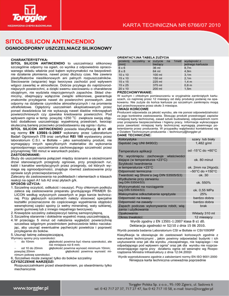 KARTA TECHNICZNA NR 6766/07 2010 SITOL SILICON ANTINCENDIO OGNIOODPORNY USZCZELNIACZ SILIKONOWY CHARAKTERYSTYKA: SITOL SILICON ANTINCENDIO to uszczelniacz silikonowy szczególnie odporny na ogień, co wynika z odpowiednio opracowanego składu właśnie pod kątem wytrzymałości na bezpośrednie działanie płomienia, nawet przez dłuższy czas. Nie zawiera plastyfikatorów niesilikonowych ani palnych rozpuszczalników. Sieciowanie (wiązanie) tego tworzywa zachodzi pod wpływem wilgoci zawartej w atmosferze. Dobrze przylega do najróżnorodniejszych powierzchni, a dzięki swemu sieciowaniu o charakterze obojętnym, nie wydziela nieprzyjemnych zapachów. Skład chemiczny, obejmujący wyłącznie związki silikonowe, gwarantuje znakomite przyleganie nawet do powierzchni porowatych. Jest odporny na działanie czynników atmosferycznych i na promienie ultrafioletowe. Oględziny uszczelnień eksploatowanych przez ponad dwadzieścia lat nie wykazują nawet śladów mikrospękań powierzchniowych czy zjawiska kredowania powierzchni. Pod wpływem ognia w temp. powyżej +250 oC zwiększa swoją objętość dodatkowo uszczelniając wypełnioną przestrzeń, tworząc skuteczną barierę przeciwko przedostawaniu się ognia i dymu. SITOL SILICON ANTINCENDIO posiada klasyfikację B s1 d0 wg normy EN 13501-1:2007 wykonany przez Laboratorium Badań Ogniowych ITB oraz certyfikat REI 180 wystawiony przez laboratorium C.S.I. w Bollate – jako samodzielny produkt, nie wymagający innych specyficznych materiałów do wykonania ognioodpornego uszczelniania zachowującego szczelność przez przynajmniej 180 minut w warunkach pożaru. ZASTOSOWANIE: Służy do uszczelniania połączeń między ścianami a ościeżnicami drzwi stanowiących przegrody ogniowe, przy przejściach rur, kabli i kanałów wentylacyjnych przez przegrody, od których wymaga się ognioodporności, znajduje również zastosowanie przy oprawie szyb przeciwpożarowych. Zalecany do zastosowania na podkładach i elementach o klasach reakcji na ogień A1 lub A2 oraz płytach g/k. SPOSÓB UŻYCIA: 1. Szczelinę oczyścić, odtłuścić i osuszyć. Przy chłonnym podłożu zaleca się zastosowanie preparatu gruntującego PRIMER SILICON według wytycznych zawartych w jego karcie technicznej. Przy głębszych szczelinach należy stosować specjalne kształtki przeznaczone do częściowego wypełnienia objętości wewnętrznej części spoiny (z wełny mineralnej, waty szklanej, pianki gumowej lub z innego niepalnego tworzywa). 2. Krawędzie szczeliny zabezpieczyć taśmą samoprzylepną. 3. Szczelinę starannie i dokładnie wypełnić masą uszczelniającą. 4. W przeciągu 5 minut od nałożenia wygładzić powierzchnię szczeliwa wilgotnym przedmiotem jednocześnie lekko naciskając, aby usunąć ewentualne pęcherzyki powietrza i poprawić przyleganie do boków. 5. Usunąć taśmę zabezpieczającą. Wymiary spoiny przy szerokości: − do 10mm głębokość powinna być równa szerokości, ale nie mniejsza niż 6 mm; − od 10 do 20mm głębokość powinna wynosić minimum 10mm; powyżej 20mm głębokość powinna wynosić minimum połowę szerokości. 6, Szczeliwo może związać tylko do boków szczeliny CZYSZCZENIE NARZĘDZI: Rozpuszczalnikami przed stwardnieniem, po stwardnieniu tylko mechanicznie ORIENTACYJNA TABELA ZUŻYCIA przekrój szczeliny w zużycie na [mm] bieżący 6x6 36 ml 8x8 64 ml 10 x 10 100 ml 15 x 10 150 ml 15 x 15 225 ml 15 x 25 375 ml 20 x 10 200 ml 1metr wydajność z jednego kartusza 8,7m 4,9m 3,1m 2,1m 1,4 m 0,8 m 1,5m PRZECHOWYWANIE: W suchym i chłodnym pomieszczeniu w oryginalnie zamkniętych kartuszach, co najmniej przez 12 miesięcy od daty produkcji podanej na opakowaniu. Nie zużyte do końca kartusze po szczelnym zamknięciu mogą być przechowywane przez około 3 miesiące. UWAGI KOŃCOWE Producent odpowiada za jakość wyrobu, ale nie ponosi odpowiedzialności za jego konkretne zastosowania. Stosując produkt przestrzegać zapisów niniejszej karty technicznej, zasad sztuki budowlanej, odpowiednich norm oraz przepisów bezpieczeństwa i higieny pracy. Informacje wykraczające poza zawartość niniejszej karty technicznej wymagają pisemnego potwierdzenia przez producenta. W przypadku wątpliwości kontaktować się z Działem Technicznym producenta -: [email protected] DANE TECHNICZNE: Kolorystyka Gęstość (wg UNI 8490/2) Temperatura aplikacji szary lub biały 1,482 g/ml od -15°C do +60°C Po wyciśnięciu zachowuje właściwości klejące (w temperaturze +23°C) ok. 80 minut Szybkość twardnienia w temperaturze +23°C ok. 2mm na 24godz. Odporność termiczna –50°C do +150°C Twardość wg Shore’a (wg DIN 53505/S3) ok. 30 Wydłużenie przy zerwaniu (wg DIN 53504/S3) ok. 550% Wytrzymałość na rozciąganie (wg DIN 53504/S3) ok. 0,55 MPa Maksymalne odkształcenie sprężyste 25% Odporność na kwasy bardzo dobra Odporność na zasady bardzo dobra Zapach podczas wykonywania robót, wiąbrak zania i użytkowania Opakowania Wkłady 310 ml Okres trwałości: 12 miesięcy Wyrób zgodny z EN 13501-1:2007 klasa B s1 d0. Deklaracja zgodności nr 52/10 z dnia 15 06 2010. Wyrób posiada badania Laboratorium CSI w Bollate nr CSI/1093RF Klasyfikacja ta obowiązuje do zastosowań końcowych zgodnie z warunkami technicznymi , jakim powinny odpowiadać budynki i ich usytuowanie oraz jak dla wyrobu „niezapalnego, nie kapiącego i nie odpadającego pod wpływem ognia” oraz jak dla wyrobu nie rozprzestrzeniającego ognia przy działaniu ognia od wewnątrz wg Rozporządzenia Ministra Infrastruktury z dnia 12.04.2002r Wyrób wyprodukowano zgodnie z założeniami normy EN ISO 9001:2000 Niniejsza karta techniczna unieważnia poprzednie