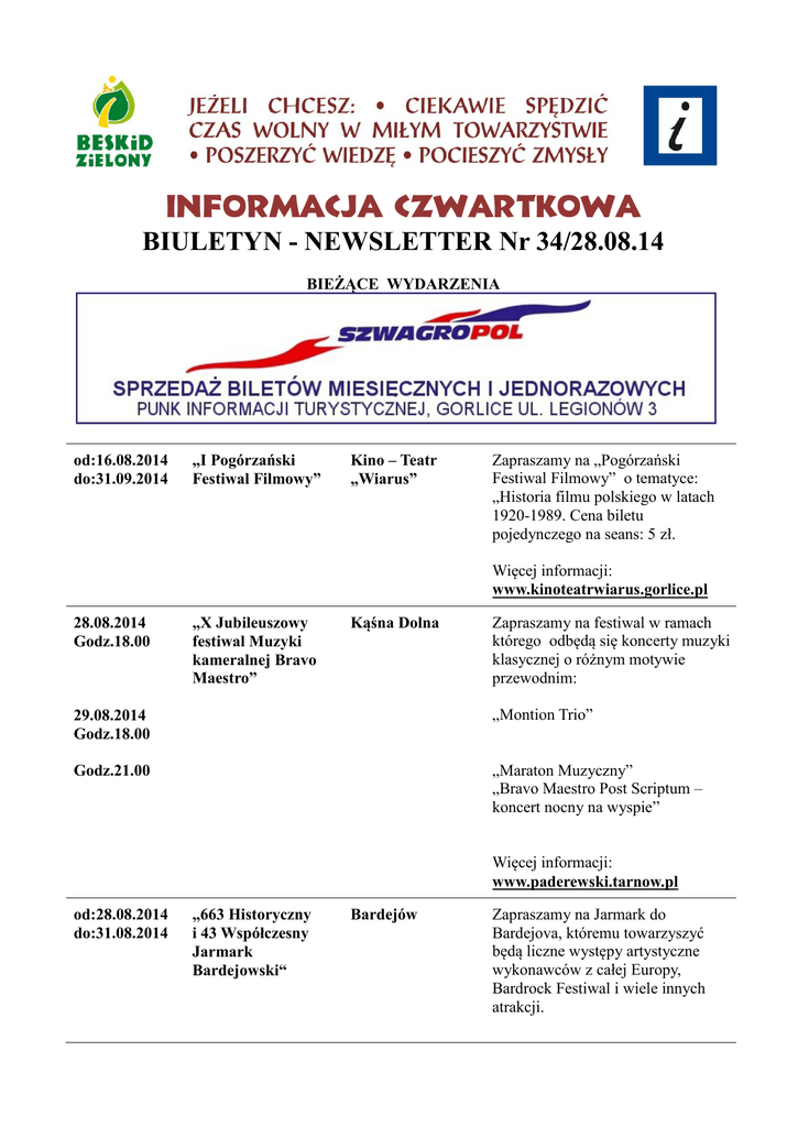 INFORMACJA CZWARTKOWA BIULETYN - NEWSLETTER Nr 34/28.08.14 BIEŻĄCE WYDARZENIA od:16.08.2014 do:31.09.2014 „I Pogórzański Festiwal Filmowy” Kino – Teatr „Wiarus” Zapraszamy na „Pogórzański Festiwal Filmowy” o tematyce: „Historia filmu polskiego w latach 1920-1989. Cena biletu pojedynczego na seans: 5 zł. Więcej informacji: www.kinoteatrwiarus.gorlice.pl 28.08.2014 Godz.18.00 „X Jubileuszowy festiwal Muzyki kameralnej Bravo Maestro” Kąśna Dolna Zapraszamy na festiwal w ramach którego odbędą się koncerty muzyki klasycznej o różnym motywie przewodnim: 29.08.2014 Godz.18.00 „Montion Trio” Godz.21.00 „Maraton Muzyczny” „Bravo Maestro Post Scriptum – koncert nocny na wyspie” Więcej informacji: www.paderewski.tarnow.pl od:28.08.2014 do:31.08.2014 „663 Historyczny i 43 Współczesny Jarmark Bardejowski“ Bardejów Zapraszamy na Jarmark do Bardejova, któremu towarzyszyć będą liczne występy artystyczne wykonawców z całej Europy, Bardrock Festiwal i wiele innych atrakcji. Więcej informacji: www.dompolskoslowacki.eu 29.08.2014 Godz.18.00 „Grand Canion Coloradofotografia“ Kasztel w Szymbarku Otwarcie wystawy oraz prelekcja połączona z pokazem slajdów i filmu z wyprawy. Więcej informacji: www.muzeum.gorlice.pl 30.08.2014 Godz.18.00 „Emanacje“ Galeria Sztuki „Dwór Karwacjanów” w Gorlicach Zapraszamy na koncert muzyki klasycznej, wystąpią: Maria Machowska – skrzypce, Bartłomiej Wezner -fortepian. Więcej informacji: www.gorlice.art.pl 30.08.2014 31.08.2014 „IX Miedzynarodowe Dni Wina“ Jasło W programie: degustacje wina, występy artystyczne, kiermasz rękodzieła artystycznego, prezentacja filmu. Więcej informacji: www.dniwina.pl 31.08.2014 Godz.11.00 „VI Kociołek Galicyjski“ Miasteczko Galicyjskie w Nowym Sączu W programie: występy regionalne, degustacje potraw tradycyjnych i regionalnych, animacje dla dzieci itp. Więcej informacji: www.muzeum.sacz.pl 31.08.2014 Godz.13.00 „Dożynki Powiatu Tarnowskiego“ Ciężkowice Gwiazdą wieczoru dożynkowego będzie zespół „Lachersi”. Więcej informacji: www.pogorze24.pl 31.08.2014 Godz.15.00 „Piknik Charytatywny“ Jarmark Pogórzański w Gorlicach Zapraszamy na piknik charytatywny na rzecz Stowarzyszenia „Sprawne Smoki”, w programie występ Teresy Mirga z zespołem „Kałe Bała”, mnóstwo atrakcji dla dzieci, zawody gorlickich strongmanów, wręczenie nagrody głównej w Plebiscycie „Gazety Krakowskiej” na Najlepszą Restaurację Powiatu Gorlickiego. Więcej informacji: www.gck.gorlice.pl 31.08.2014 Godz.10.00 31.08.2014 Godz.15.30 „XXXI Dożynki Archidiecezialne XiV Dożynki Województwa Podkarpackiego“ Sanktuarium św. Jana z Dukli, Plac klasztorny oo. Bernardynów „Dożynkowwy Festyn Franciszkański Zakończenie Wakacji“ Ogrody Klasztorne oo. Bernardynów w Dukli Dożynki odbywają się w 600-lecie urodzin patrona Polski i Archidiecezji Przemyskiej. Więcej informacji: www.dukla.pl Zapraszamy na przygotowany program artystyczny: m.in. koncert Antoniny Krzysztoń, zespołu Ahaju Fusion Boliwia oraz na zabawę taneczną. Więcej informacji: www.dukla.pl 31.08.2014 Godz.15.30 „Koncert Letniej Orkiestry Młodych“ Amfiteatr przy Zielonym Domku, Rymanów Koncert pod batutą Miłosza Markiewicza autora aranży do wszystkich wykonywanych utworów. Więcej informacji: www.rymanow.pl 01.09.2014 Godz. 18.00 „Talerhof 19141917“ Muzeum Regionalne PTTK w Gorlicach Zapraszamy na wernisaż wystawy „Talerhof 1914-1917“. Więcej informacji: www.gorlice.pttk.pl 02.09.2014 Godz.17.00 04.09.2014 Godz.18.00 “Cerkwie łemkowskie” „Ludzie“ Dom PolskoSłowacki im. Dušana Jurkoviča w Gorlicach Wernisaż wystawy malarstwa , której autorem jest Pavlo Lopata. Miejska Biblioteka Publiczna w Gorlicach Wernisaż fotografii ulicznej autorstwa Barbary Gabryel – Dorrell. Więcej informacji: www.dompolskoslowacki.eu Więcej informacji: www.mbp.gorlice.pl od:05.09.2014 do:07.09.2014 "Festiwal Żarnowiec" Żarnowiec Bogaty program artystyczny, znakomite spektakle, wspaniali artyści- takie atrakcje przygotowano dla wielbicieli muzyki operowej. Więcej informacji: www.terazkrosno.pl od:05.09.2014 do.07.08.2014 „Bałkany w Beskidzie Niskim” Bartne, Bacówka PTTK Podczas wydarzenia będziemy bawić się w rytmach bałkańskiej muzyki , kosztować tamtejszych przysmaków i trunków, poznawać okolicę. Więcej informacji: www.drumbun.pl 06.09.2014 Godz.10.00 „Narodowe Czytanie Skwer przy MiejHenryka skiej Bibliotece Sienkiewicza” Publicznej w Gorlicach W programie: czytanie wybranych fragmentów Trylogii, „Sienkiewiczowskie jadło”, konkursy plastyczne dla dzieci, kiermasz książek i inne atrakcje. Więcej informacji: www.mbp.gorlice.pl EKSPOZYCJE CZASOWE od 17.08. 2014 do 26.09.2014 od:15.07.2014 do:28.08.2014 od:18.08.2014 do:20.09.2014 "Łem - Ukryta Kraina" “Jozef Michna – wystawa rzeźby” Bogdan Gorczyca „Powstanie Naród” Ośrodek Edukacyjny wraz z Muzeum Magurskiego Parku Narodowego w Krempnej Zapraszamy na wystawę fotografii. Wstęp wolny. Dom PolskoSłowacki im. Dušana Jurkoviča w Gorlicach Zapraszamy na wystawę rzeźby. Pawilon Historii Miasta Gorlice Zapraszamy na wystawę rzeźby, malarstwa, fotografii w formie instalacji. Więcej informacji: www.magurskipn.pl Więcej informacji: www.dompolskoslowacki.eu Więcej informacji: www.gorlice.pl od:08.08.2014 do:03.09.2014 od:08.08.2014 do:03.09.2014 od:30.08.2014 do:30.09.2014 Stanisław Bryndal rzeźba Anna Tarnowska – Wojak - malarstwo „Kapadocja – kraina fallicznych form” Galeria Sztuki „Dwór Karwacjanów” w Gorlicach Zapraszamy na wystawę rzeźby. Galeria Sztuki „Dwór Karwacjanów” w Gorlicach Zapraszamy na wystawę malarstwa. Muzeum Narciarstwa w Cieklinie Zapraszamy na wernisaż wystawy Barbary Zasowskiej z podróży po Kapadocji. Więcej informacji: www.gorlice.art.pl Więcej informacji: www.gorlice.art.pl Więcej informacji: www.cieklin-s