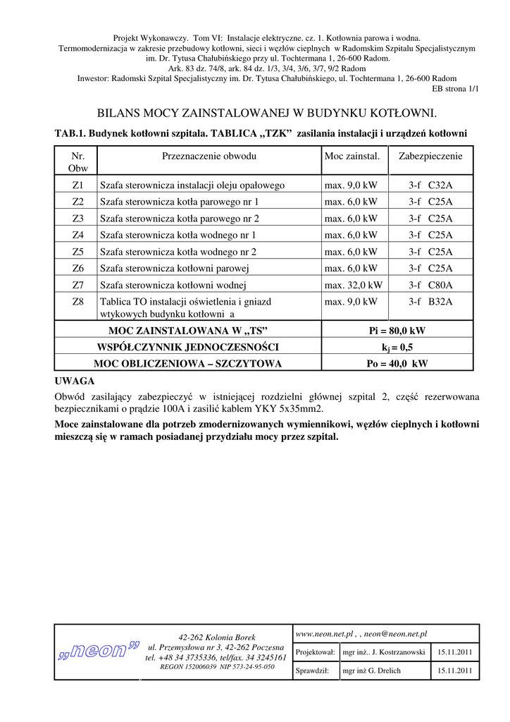 Projekt Wykonawczy. Tom VI: Instalacje elektryczne. cz. 1. Kotłownia parowa i wodna. Termomodernizacja w zakresie przebudowy kotłowni, sieci i węzłów cieplnych w Radomskim Szpitalu Specjalistycznym im. Dr. Tytusa Chałubińskiego przy ul. Tochtermana 1, 26-600 Radom. Ark. 83 dz. 74/8, ark. 84 dz. 1/3, 3/4, 3/6, 3/7, 9/2 Radom Inwestor: Radomski Szpital Specjalistyczny im. Dr. Tytusa Chałubińskiego, ul. Tochtermana 1, 26-600 Radom EB strona 1/1 BILANS MOCY ZAINSTALOWANEJ W BUDYNKU KOTŁOWNI. TAB.1. Budynek kotłowni szpitala. TABLICA „TZK” zasilania instalacji i urządzeń kotłowni Nr. Obw Przeznaczenie obwodu Moc zainstal. Zabezpieczenie Z1 Szafa sterownicza instalacji oleju opałowego max. 9,0 kW 3-f C32A Z2 Szafa sterownicza kotła parowego nr 1 max. 6,0 kW 3-f C25A Z3 Szafa sterownicza kotła parowego nr 2 max. 6,0 kW 3-f C25A Z4 Szafa sterownicza kotła wodnego nr 1 max. 6,0 kW 3-f C25A Z5 Szafa sterownicza kotła wodnego nr 2 max. 6,0 kW 3-f C25A Z6 Szafa sterownicza kotłowni parowej max. 6,0 kW 3-f C25A Z7 Szafa sterownicza kotłowni wodnej max. 32,0 kW 3-f C80A Z8 Tablica TO instalacji oświetlenia i gniazd wtykowych budynku kotłowni a max. 9,0 kW 3-f B32A MOC ZAINSTALOWANA W „TS” Pi = 80,0 kW WSPÓŁCZYNNIK JEDNOCZESNOŚCI kj = 0,5 MOC OBLICZENIOWA – SZCZYTOWA Po = 40,0 kW UWAGA Obwód zasilający zabezpieczyć w istniejącej rozdzielni głównej szpital 2, część rezerwowana bezpiecznikami o prądzie 100A i zasilić kablem YKY 5x35mm2. Moce zainstalowane dla potrzeb zmodernizowanych wymiennikowi, węzłów cieplnych i kotłowni mieszczą się w ramach posiadanej przydziału mocy przez szpital. „neon” 42-262 Kolonia Borek ul. Przemysłowa nr 3, 42-262 Poczesna tel. +48 34 3735336, tel/fax. 34 3245161 REGON 152006039 NIP 573-24-95-050 www.neon.net.pl , , [email protected] Projektował: mgr inż.. J. Kostrzanowski 15.11.2011 Sprawdził: 15.11.2011 mgr inż G. Drelich