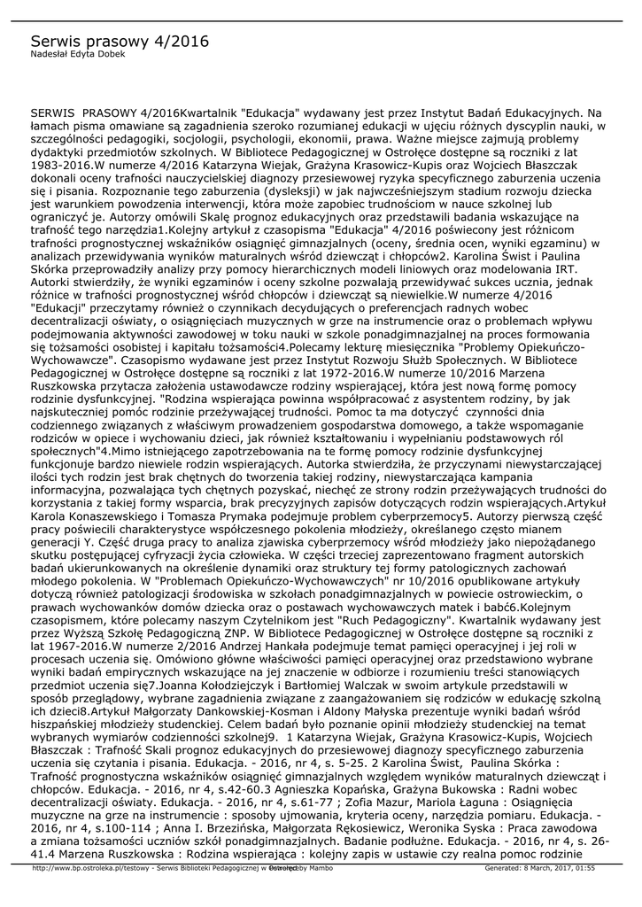 Serwis prasowy 4/2016 Nadesłał Edyta Dobek SERWIS PRASOWY 4/2016Kwartalnik "Edukacja" wydawany jest przez Instytut Badań Edukacyjnych. Na łamach pisma omawiane są zagadnienia szeroko rozumianej edukacji w ujęciu różnych dyscyplin nauki, w szczególności pedagogiki, socjologii, psychologii, ekonomii, prawa. Ważne miejsce zajmują problemy dydaktyki przedmiotów szkolnych. W Bibliotece Pedagogicznej w Ostrołęce dostępne są roczniki z lat 1983-2016.W numerze 4/2016 Katarzyna Wiejak, Grażyna Krasowicz-Kupis oraz Wojciech Błaszczak dokonali oceny trafności nauczycielskiej diagnozy przesiewowej ryzyka specyficznego zaburzenia uczenia się i pisania. Rozpoznanie tego zaburzenia (dysleksji) w jak najwcześniejszym stadium rozwoju dziecka jest warunkiem powodzenia interwencji, która może zapobiec trudnościom w nauce szkolnej lub ograniczyć je. Autorzy omówili Skalę prognoz edukacyjnych oraz przedstawili badania wskazujące na trafność tego narzędzia1.Kolejny artykuł z czasopisma "Edukacja" 4/2016 poświecony jest różnicom trafności prognostycznej wskaźników osiągnięć gimnazjalnych (oceny, średnia ocen, wyniki egzaminu) w analizach przewidywania wyników maturalnych wśród dziewcząt i chłopców2. Karolina Świst i Paulina Skórka przeprowadziły analizy przy pomocy hierarchicznych modeli liniowych oraz modelowania IRT. Autorki stwierdziły, że wyniki egzaminów i oceny szkolne pozwalają przewidywać sukces ucznia, jednak różnice w trafności prognostycznej wśród chłopców i dziewcząt są niewielkie.W numerze 4/2016 "Edukacji" przeczytamy również o czynnikach decydujących o preferencjach radnych wobec decentralizacji oświaty, o osiągnięciach muzycznych w grze na instrumencie oraz o problemach wpływu podejmowania aktywności zawodowej w toku nauki w szkole ponadgimnazjalnej na proces formowania się tożsamości osobistej i kapitału tożsamości4.Polecamy lekturę miesięcznika "Problemy OpiekuńczoWychowawcze". Czasopismo wydawane jest przez Instytut Rozwoju Służb Społecznych. W Bibliotece Pedagogicznej w Ostrołęce dostępne są roczniki z lat 1972-2016.W numerze 10/2016 Marzena Ruszkowska przytacza założenia ustawodawcze rodziny wspierającej, która jest nową formę pomocy rodzinie dysfunkcyjnej. "Rodzina wspierająca powinna współpracować z asystentem rodziny, by jak najskuteczniej pomóc rodzinie przeżywającej trudności. Pomoc ta ma dotyczyć czynności dnia codziennego związanych z właściwym prowadzeniem gospodarstwa domowego, a także wspomaganie rodziców w opiece i wychowaniu dzieci, jak również kształtowaniu i wypełnianiu podstawowych ról społecznych"4.Mimo istniejącego zapotrzebowania na te formę pomocy rodzinie dysfunkcyjnej funkcjonuje bardzo niewiele rodzin wspierających. Autorka stwierdziła, że przyczynami niewystarczającej ilości tych rodzin jest brak chętnych do tworzenia takiej rodziny, niewystarczająca kampania informacyjna, pozwalająca tych chętnych pozyskać, niechęć ze strony rodzin przeżywających trudności do korzystania z takiej formy wsparcia, brak precyzyjnych zapisów dotyczących rodzin wspierających.Artykuł Karola Konaszewskiego i Tomasza Prymaka podejmuje problem cyberprzemocy5. Autorzy pierwszą część pracy poświecili charakterystyce współczesnego pokolenia młodzieży, określanego często mianem generacji Y. Część druga pracy to analiza zjawiska cyberprzemocy wśród młodzieży jako niepożądanego skutku postępującej cyfryzacji życia człowieka. W części trzeciej zaprezentowano fragment autorskich badań ukierunkowanych na określenie dynamiki oraz struktury tej formy patologicznych zachowań młodego pokolenia. W "Problemach Opiekuńczo-Wychowawczych" nr 10/2016 opublikowane artykuły dotyczą również patologizacji środowiska w szkołach ponadgimnazjalnych w powiecie ostrowieckim, o prawach wychowanków domów dziecka oraz o postawach wychowawczych matek i babć6.Kolejnym czasopismem, które polecamy naszym Czytelnikom jest "Ruch Pedagogiczny". Kwartalnik wydawany jest przez Wyższą Szkołę Pedagogiczną ZNP. W Bibliotece Pedagogicznej w Ostrołęce dostępne są roczniki z lat 1967-2016.W numerze 2/2016 Andrzej Hankała podejmuje temat pamięci operacyjnej i jej roli w procesach uczenia się. Omówiono główne właściwości pamięci operacyjnej oraz przedstawiono wybrane wyniki badań empirycznych wskazujące na jej znaczenie w odbiorze i rozumieniu treści stanowiących przedmiot uczenia się7.Joanna Kołodziejczyk i Bartłomiej Walczak w swoim artykule przedstawili w sposób przeglądowy, wybrane zagadnienia związane z zaangażowaniem się rodziców w edukację szkolną ich dzieci8.Artykuł Małgorzaty Dankowskiej-Kosman i Aldony Małyska prezentuje wyniki badań wśród hiszpańskiej młodzieży studenckiej. Celem badań było poznanie opinii młodzieży studenckiej na temat wybranych wymiarów codzienności szkolnej9. 1 Katarzyna Wiejak, Grażyna Krasowicz-Kupis, Wojciech Błaszczak : Trafność Skali prognoz edukacyjnych do przesiewowej diagnozy specyficznego zaburzenia uczenia się czytania i pisania. Edukacja. - 2016, nr 4, s. 5-25. 2 Karolina Świst, Paulina Skórka : Trafność prognostyczna wskaźników osiągnięć gimnazjalnych względem wyników maturalnych dziewcząt i chłopców. Edukacja. - 2016, nr 4, s.42-60.3 Agnieszka Kopańska, Grażyna Bukowska : Radni wobec decentralizacji oświaty. Edukacja. - 2016, nr 4, s.61-77 ; Zofia Mazur, Mariola Łaguna : Osiągnięcia muzyczne na grze na instrumencie : sposoby ujmowania, kryteria oceny, narzędzia pomiaru. Edukacja. 2016, nr 4, s.100-114 ; Anna I. Brzezińska, Małgorzata Rękosiewicz, Weronika Syska : Praca zawodowa a zmiana tożsamości uczniów szkół ponadgimnazjalnych. Badanie podłużne. Edukacja. - 2016, nr 4, s. 2641.4 Marzena Ruszkowska : Rodzina wspierająca : kolejny zapis w ustawie czy realna pomoc rodzinie http://www.bp.ostroleka.pl/testowy - Serwis Biblioteki Pedagogi