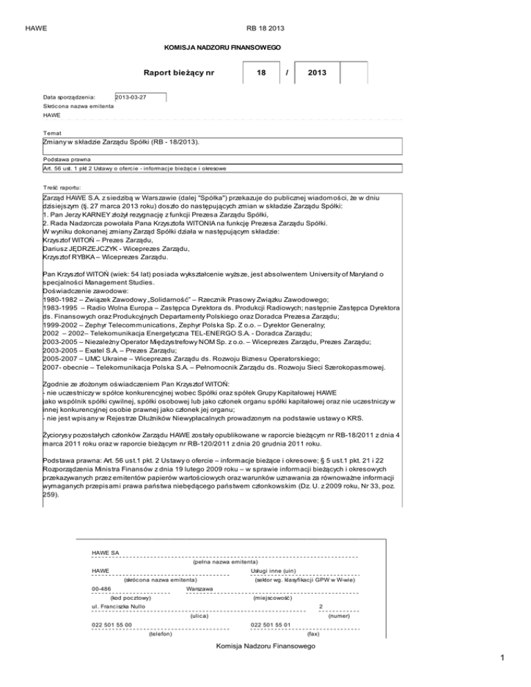 HAWE RB 18 2013 KOMISJA NADZORU FINANSOWEGO Raport bieżący nr 18 / 2013 2013-03-27 Data sporządzenia: Skróc ona nazwa emitenta HAWE Temat Zmiany w składzie Zarządu Spółki (RB - 18/2013). Podstawa prawna Art. 56 ust. 1 pkt 2 Ustawy o oferc ie - informac je bieżąc e i okresowe Treść raportu: Zarząd HAWE S.A. z siedzibą w Warszawie (dalej "Spółka") przekazuje do publicznej wiadomości, że w dniu dzisiejszym (tj. 27 marca 2013 roku) doszło do następujących zmian w składzie Zarządu Spółki: 1. Pan Jerzy KARNEY złożył rezygnację z funkcji Prezesa Zarządu Spółki, 2. Rada Nadzorcza powołała Pana Krzysztofa WITONIA na funkcję Prezesa Zarządu Spółki. W wyniku dokonanej zmiany Zarząd Spółki działa w następującym składzie: Krzysztof WITOŃ – Prezes Zarządu, Dariusz JĘDRZEJCZYK - Wiceprezes Zarządu, Krzysztof RYBKA – Wiceprezes Zarządu. Pan Krzysztof WITOŃ (wiek: 54 lat) posiada wykształcenie wyższe, jest absolwentem University of Maryland o specjalności Management Studies. Doświadczenie zawodowe: 1980-1982 – Związek Zawodowy „Solidarność” – Rzecznik Prasowy Związku Zawodowego; 1983-1995 – Radio Wolna Europa – Zastępca Dyrektora ds. Produkcji Radiowych; następnie Zastępca Dyrektora ds. Finansowych oraz Produkcyjnych Departamenty Polskiego oraz Doradca Prezesa Zarządu; 1999-2002 – Zephyr Telecommunications, Zephyr Polska Sp. Z o.o. – Dyrektor Generalny; 2002 – 2002– Telekomunikacja Energetyczna TEL-ENERGO S.A. - Doradca Zarządu; 2003-2005 – Niezależny Operator Międzystrefowy NOM Sp. z o.o. – Wiceprezes Zarządu, Prezes Zarządu; 2003-2005 – Exatel S.A. – Prezes Zarządu; 2005-2007 – UMC Ukraine – Wiceprezes Zarządu ds. Rozwoju Biznesu Operatorskiego; 2007- obecnie – Telekomunikacja Polska S.A. – Pełnomocnik Zarządu ds. Rozwoju Sieci Szerokopasmowej. Zgodnie ze złożonym oświadczeniem Pan Krzysztof WITOŃ: - nie uczestniczy w spółce konkurencyjnej wobec Spółki oraz spółek Grupy Kapitałowej HAWE jako wspólnik spółki cywilnej, spółki osobowej lub jako członek organu spółki kapitałowej oraz nie uczestniczy w innej konkurencyjnej osobie prawnej jako członek jej organu; - nie jest wpisany w Rejestrze Dłużników Niewypłacalnych prowadzonym na podstawie ustawy o KRS. Życiorysy pozostałych członków Zarządu HAWE zostały opublikowane w raporcie bieżącym nr RB-18/2011 z dnia 4 marca 2011 roku oraz w raporcie bieżącym nr RB-120/2011 z dnia 20 grudnia 2011 roku. Podstawa prawna: Art. 56 ust.1 pkt. 2 Ustawy o ofercie – informacje bieżące i okresowe; § 5 ust.1 pkt. 21 i 22 Rozporządzenia Ministra Finansów z dnia 19 lutego 2009 roku – w sprawie informacji bieżących i okresowych przekazywanych przez emitentów papierów wartościowych oraz warunków uznawania za równoważne informacji wymaganych przepisami prawa państwa niebędącego państwem członkowskim (Dz. U. z 2009 roku, Nr 33, poz. 259). HAWE SA (pełna nazwa emitenta) Usługi inne (uin) HAWE (skróc ona nazwa emitenta) 00-486 (sektor wg. klasyfikac ji GPW w W-wie) Warszawa (kod poc ztowy) (miejscowość) ul. Franc iszka Nullo 2 (ulica) 022 501 55 00 (numer) 022 501 55 01 (telefon) (fax) Komisja Nadzoru Finansowego 1 HAWE RB 18 2013 [email protected] www.hawesa.pl (e-mail) (www) 527-23-80-580 015197353 (NIP) (REGON) PODPISY OSÓB REPREZENTUJĄCYCH SPÓŁKĘ Data Imię i Nazwisko Stanowisko/Funkc ja 2013-03-27 Dariusz Jędrzejczyk Wic eprezes Zarządu 2013-03-27 Krzysztof Rybka Wic eprezes Zarządu Podpis Komisja Nadzoru Finansowego 2