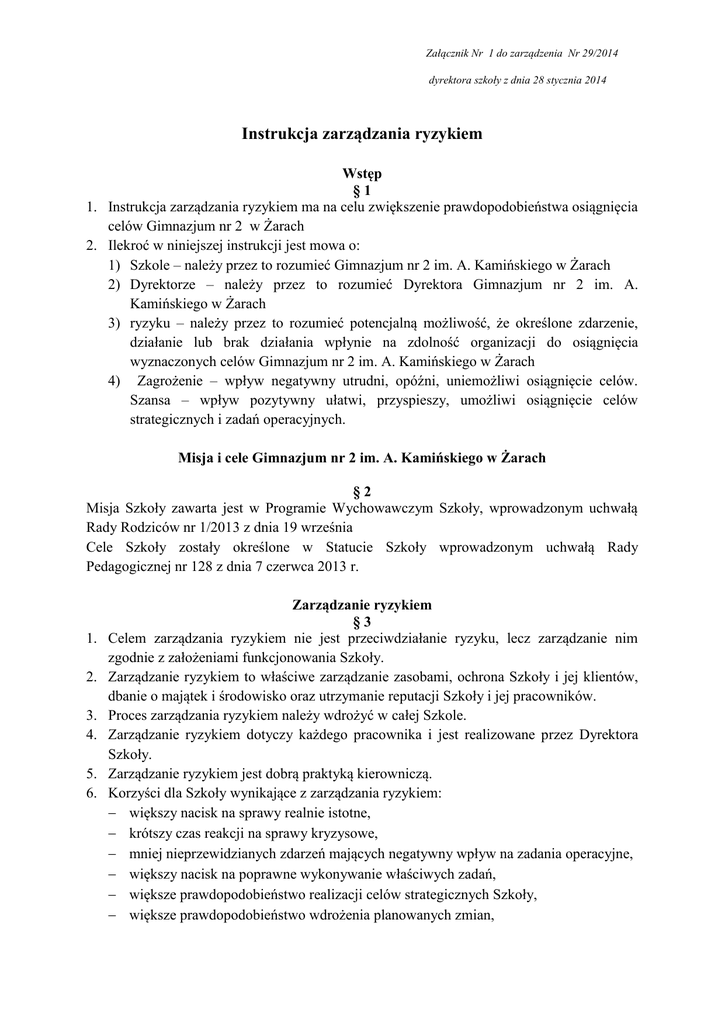 Załącznik Nr 1 do zarządzenia Nr 29/2014 dyrektora szkoły z dnia 28 stycznia 2014 Instrukcja zarządzania ryzykiem Wstęp §1 1. Instrukcja zarządzania ryzykiem ma na celu zwiększenie prawdopodobieństwa osiągnięcia celów Gimnazjum nr 2 w Żarach 2. Ilekroć w niniejszej instrukcji jest mowa o: 1) Szkole – należy przez to rozumieć Gimnazjum nr 2 im. A. Kamińskiego w Żarach 2) Dyrektorze – należy przez to rozumieć Dyrektora Gimnazjum nr 2 im. A. Kamińskiego w Żarach 3) ryzyku – należy przez to rozumieć potencjalną możliwość, że określone zdarzenie, działanie lub brak działania wpłynie na zdolność organizacji do osiągnięcia wyznaczonych celów Gimnazjum nr 2 im. A. Kamińskiego w Żarach 4) Zagrożenie – wpływ negatywny utrudni, opóźni, uniemożliwi osiągnięcie celów. Szansa – wpływ pozytywny ułatwi, przyspieszy, umożliwi osiągnięcie celów strategicznych i zadań operacyjnych. Misja i cele Gimnazjum nr 2 im. A. Kamińskiego w Żarach §2 Misja Szkoły zawarta jest w Programie Wychowawczym Szkoły, wprowadzonym uchwałą Rady Rodziców nr 1/2013 z dnia 19 września Cele Szkoły zostały określone w Statucie Szkoły wprowadzonym uchwałą Rady Pedagogicznej nr 128 z dnia 7 czerwca 2013 r. 1. 2. 3. 4. 5. 6. Zarządzanie ryzykiem §3 Celem zarządzania ryzykiem nie jest przeciwdziałanie ryzyku, lecz zarządzanie nim zgodnie z założeniami funkcjonowania Szkoły. Zarządzanie ryzykiem to właściwe zarządzanie zasobami, ochrona Szkoły i jej klientów, dbanie o majątek i środowisko oraz utrzymanie reputacji Szkoły i jej pracowników. Proces zarządzania ryzykiem należy wdrożyć w całej Szkole. Zarządzanie ryzykiem dotyczy każdego pracownika i jest realizowane przez Dyrektora Szkoły. Zarządzanie ryzykiem jest dobrą praktyką kierowniczą. Korzyści dla Szkoły wynikające z zarządzania ryzykiem: większy nacisk na sprawy realnie istotne, krótszy czas reakcji na sprawy kryzysowe, mniej nieprzewidzianych zdarzeń mających negatywny wpływ na zadania operacyjne, większy nacisk na poprawne wykonywanie właściwych zadań, większe prawdopodobieństwo realizacji celów strategicznych Szkoły, większe prawdopodobieństwo wdrożenia planowanych zmian, Załącznik Nr 1 do zarządzenia Nr 29/2014 dyrektora szkoły z dnia 28 stycznia 2014 lepsze wykorzystanie zasobów, w tym środków finansowych, bardziej świadome podejmowanie ryzyka oraz decyzji, poprawa jakości świadczonych usług, większe zaufanie osób korzystających z pomocy pracowników Szkoły 7. Etapy procesu zarządzania ryzykiem w Szkole: a) identyfikacja ryzyka, b) analiza ryzyka, c) ocena ryzyka, d) reakcja na ryzyko, e) monitoring ryzyka. Identyfikacja ryzyka §4 1. Ryzyka to wszystkie zdarzenia, które mogą zagrozić realizacji celów i zadań, które jednostka ma zrealizować w określonym harmonogramie czasowym. 2. Identyfikując ryzyko bierzemy pod uwagę: 1) cele i zadania Szkoły na dany rok szkolny 2) przepisy prawne dotyczące działania Szkoły (ewentualne zmiany w tych przepisach), 3) wyniki wcześniej przeprowadzonego audytu lub kontroli i certyfikacji, 4) wyniki wcześniej dokonywanych innych ocen adekwatności, efektywności i skuteczności procedur i mechanizmów w jednostce (systemów kontroli wewnętrznej), 5) sprawozdania finansowe oraz sprawozdania z wykonania budżetu, 6) wyniki rozmów, jakie przeprowadzimy z nauczycielami i pracownikami Szkoły 7) ankiety i kwestionariusze badające opinię pracowników Szkoły 8) informacje dotyczące Szkoły opublikowane w mediach. 3. Etapy identyfikacji ryzyka: a) zrozumieniu charakteru oraz celów świadczonych usług, b) określenie środków niezbędnych do świadczenia każdej usługi, c) określenie ryzyka występującego na każdym etapie działalności. 4. Ryzyko w Szkole identyfikowane jest poprzez doświadczenie zawodowe i prognozy strategiczne na przyszłość. 5. Ryzyko identyfikowane jest z wykorzystaniem formularza zarządzania ryzykiem. Formularz ten stanowi załącznik nr 1 do niniejszej instrukcji. Analiza ryzyka §5 1. Analiza ryzyka – metoda oceny podatności systemu lub grupy systemów na czynniki ryzyka. 2. Kroki w analizie ryzyka: 1) Określenie celów jednostki: misja → cele → zadania 2) Określenie ryzyk na jakie narażone są główne zadania 3) Zdefiniowanie ryzyk i nadanie symboli w ramach kategorii: Załącznik Nr 1 do zarządzenia Nr 29/2014 dyrektora szkoły z dnia 28 stycznia 2014 Zasoby ludzkie ( L) finanse (F) bezpieczeństwo ( B) czynniki zewnętrzne ( Z) przepisy, procedury ( P) działalność dydaktyczno –wychowawcza i promocja ( D) 4) Określenie poziomu ryzyka akceptowanego przez Dyrektora 5) Zapoznanie się z metodami oceny ryzyka- skutek wystąpienia, prawdopodobieństwo i istotność ryzyka 6) Wybór metody obliczania ryzyka 7) Przeprowadzenie analizy ryzyka i odpowiedzi na ryzyko 8) Dokonanie interpretacji uzyskanych wyników i opracowanie planu reakcji 3. Pracownicy uczestniczą w analizie ryzyka stanowiąc głos doradczy. Ocena ryzyka §6 1. Ocenę ryzyka przeprowadza się biorąc pod uwagę prawdopodobieństwo wystąpienia ryzyka, znaczenie ryzyka i mechanizmy kontrolne. 2. Ryzyko dzieli się biorąc pod uwagę: prawdopodobieństwo wystąpienia ryzyka, jego znaczenie dla Szkoły w razie wystąpienia (skutki wystąpienia ryzyka), istniejące mechanizmy kontrolne ryzyka. 3. Prawdopodobieństwo jest to szacowana możliwość wystąpienia zdarzenia. 4. Znaczenie są to możliwe wyniki, skutki lub konsekwencje dla Szkoły (np. starty, obrażenia, niekorzystne zdarzenia, koszty, opóźnienia). -Przy ocenie prawdopodobnych skutków wystąpienia ryzyka przyjmuje się skalę punktową od 1 do 4, gdzie; 1) 1 - oznacza skutek niski 2) 2 - oznacza skutek średni, 3) 3 – oznacza skutek wysoki, 4) 4-oznacza skutek bardzo wysoki -Przy ocenie prawdopodobieństwa wystąpienia ryzyka przyjmuje się skalę punktową od 1 do 4 , gdzie: 1) 1 - oznacza prawdopodobieństwo ni