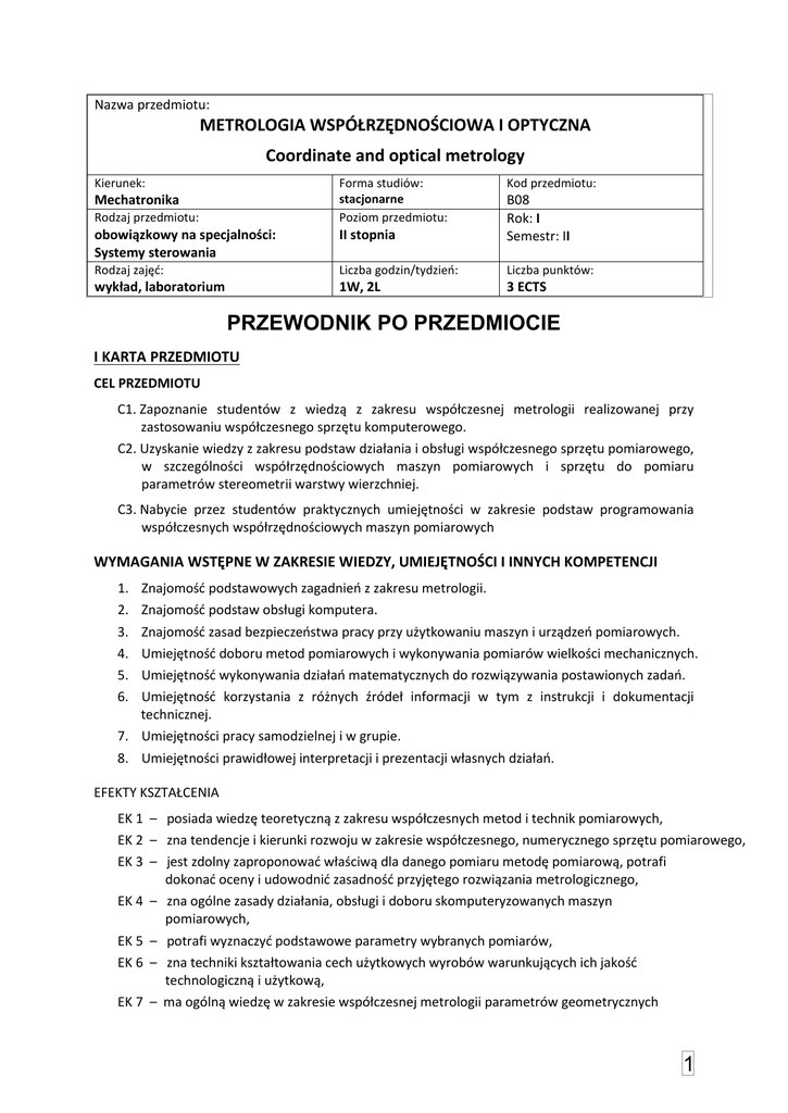 Nazwa przedmiotu: METROLOGIA WSPÓŁRZĘDNOŚCIOWA I OPTYCZNA Coordinate and optical metrology Kierunek: Forma studiów: stacjonarne Poziom przedmiotu: Mechatronika Kod przedmiotu: obowiązkowy na specjalności: Systemy sterowania II stopnia B08 Rok: I Semestr: II Rodzaj zajęd: Liczba godzin/tydzieo: Liczba punktów: wykład, laboratorium 1W, 2L 3 ECTS Rodzaj przedmiotu: PRZEWODNIK PO PRZEDMIOCIE I KARTA PRZEDMIOTU CEL PRZEDMIOTU C1. Zapoznanie studentów z wiedzą z zakresu współczesnej metrologii realizowanej przy zastosowaniu współczesnego sprzętu komputerowego. C2. Uzyskanie wiedzy z zakresu podstaw działania i obsługi współczesnego sprzętu pomiarowego, w szczególności współrzędnościowych maszyn pomiarowych i sprzętu do pomiaru parametrów stereometrii warstwy wierzchniej. C3. Nabycie przez studentów praktycznych umiejętności w zakresie podstaw programowania współczesnych współrzędnościowych maszyn pomiarowych WYMAGANIA WSTĘPNE W ZAKRESIE WIEDZY, UMIEJĘTNOŚCI I INNYCH KOMPETENCJI 1. 2. 3. 4. 5. 6. Znajomośd podstawowych zagadnieo z zakresu metrologii. Znajomośd podstaw obsługi komputera. Znajomośd zasad bezpieczeostwa pracy przy użytkowaniu maszyn i urządzeo pomiarowych. Umiejętnośd doboru metod pomiarowych i wykonywania pomiarów wielkości mechanicznych. Umiejętnośd wykonywania działao matematycznych do rozwiązywania postawionych zadao. Umiejętnośd korzystania z różnych źródeł informacji w tym z instrukcji i dokumentacji technicznej. 7. Umiejętności pracy samodzielnej i w grupie. 8. Umiejętności prawidłowej interpretacji i prezentacji własnych działao. EFEKTY KSZTAŁCENIA EK 1 – posiada wiedzę teoretyczną z zakresu współczesnych metod i technik pomiarowych, EK 2 – zna tendencje i kierunki rozwoju w zakresie współczesnego, numerycznego sprzętu pomiarowego, EK 3 – jest zdolny zaproponowad właściwą dla danego pomiaru metodę pomiarową, potrafi dokonad oceny i udowodnid zasadnośd przyjętego rozwiązania metrologicznego, EK 4 – zna ogólne zasady działania, obsługi i doboru skomputeryzowanych maszyn pomiarowych, EK 5 – potrafi wyznaczyd podstawowe parametry wybranych pomiarów, EK 6 – zna techniki kształtowania cech użytkowych wyrobów warunkujących ich jakośd technologiczną i użytkową, EK 7 – ma ogólną wiedzę w zakresie współczesnej metrologii parametrów geometrycznych 1 wyrobów i metrologii warstwy wierzchniej, EK 8 – potrafi przygotowad sprawozdanie z przebiegu realizacji dwiczeo. TREŚCI PROGRAMOWE Forma zajęd – WYKŁADY W1 - Współczesna metrologia i jej podział. Błędy pomiarów. Klasyfikacja współczesnych przyrządów pomiarowych. W2 - Współrzędnościowa technika pomiarowa. W3,W4 - Współrzędnościowe maszyny pomiarowe, podział, budowa i zasady działania. W5 - Podstawowe procedury pomiarowe. Metrologia długości i kąta. W6 - Przegląd typowych pakietów oprogramowania pomiarowego. W7 - Opis matematyczny procedur pomiarowych. Elementy skojarzone. W8 - Komputeryzacja pomiarów długości i kątów, wymiarów przestrzennie złożonych, wymiarów pośrednich. W9 - Metody analityczne i kompleksowe. Ustalanie baz pomiarowych. Konfiguracje modelowe. W10 - Pomiary błędów kształtu realizowane przy wykorzystaniu współrzędnościowej techniki pomiarowej. W11 - Typowe błędy komputerowych technik pomiarowych, wyznaczanie błędów działania WMP. W12 - Rodzaje jakości wyrobów, pojęcie jakości technologicznej i użytkowej wyrobów. W13 - Inżynieria jakości - błędy wykonania wyrobów: błędy kształtu, położenia i wykonania powierzchni i ich pomiary. W14,15- Inżynieria warstwy wierzchniej – komputerowo wspomagane pomiary chropowatości, stereometrii i właściwości fizycznych warstwy wierzchniej. Forma zajęd – LABORATORIUM L1 - Współrzędnościowa maszyna pomiarowa, zasada działania, budowa, podstawy jej obsługi i programowania. L2 - Wprowadzenie do współrzędnościowej techniki pomiarowej. Demonstracja typowych pakietów oprogramowania pomiarowego. L3 - Programowanie współrzędnościowej maszyny pomiarowej – praca na komputerowym symulatorze przebiegu pomiaru. L4,L5 - Opracowanie, przygotowanie i praktyczne przeniesienie na maszynę pomiarową planu pomiaru wybranego detalu. L6,L7 - Pomiary wielkości geometrycznych na WMP. L8 - Pomiary błędów kształtu realizowane przy wykorzystaniu współrzędnościowej maszyny pomiarowej. L9,L10 - Zastosowanie oprogramowania CAD/CAM/CAQ do komputerowej obróbki wyników pomiarów. Zastosowanie metod numerycznych do analizy wyników pomiarów otrzymanych z wykorzystaniem współrzędnościowej techniki pomiarowej. L11 - Komputerowo wspomagana kontrola jakości realizacji procesu technologicznego. Komputeryzacja laboratoryjnych technik pomiarowych. L12,L13 - System pomiarowy umożliwiający kompleksowy pomiar chropowatości stereometrii warstwy wierzchniej w układzie 2D i 3D oraz kompleksowy pomiar kształtu i parametrów konturu analizowanych przedmiotów. Liczba godzin 1 1 2 1 1 1 1 1 1 1 1 1 2 Liczba godzin 2 2 2 4 2 2 4 2 4 2 L14,L15 - System pomiarowy umożliwiający kompleksowy pomiar kształtu powierzchni walcowych wraz z możliwością wyznaczenia trójwymiarowych wykresów odchyłek kształtu zmieniających się na długości przedmiotów walcowych. 4 NARZĘDZIA DYDAKTYCZNE 1. – 2. – 3. – 4. – 5. – 6. – 7. – 8. – wykład z wykorzystaniem prezentacji multimedialnych dwiczenia laboratoryjne, opracowanie sprawozdao z realizacji przebiegu dwiczeo pokaz procesów pomiarowych instrukcje do wykonania dwiczeo laboratoryjnych pracownia komputerowa ze specjalistycznym oprogramowaniem dydaktycznym przyrządy pomiarowe klasyczne i cyfrowe stanowiska do dwiczeo wyposażone w maszyny i narzędzia pomiarowe współrzędnościowa maszyna pomiarowa za sterowaniem CNC, profilografometr, okrągłościomierz ze sterowaniem CNC, mikrotwardościomierz z odczytem optycznym. SPOSOBY OCENY ( F – FORMU