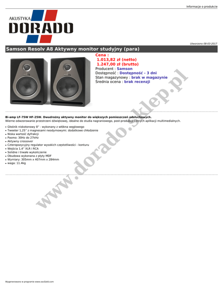 Informacje o produkcie Utworzono 08-03-2017 Samson Resolv A8 Aktywny monitor studyjny (para) Cena : 1.013,82 zł (netto) 1.247,00 zł (brutto) sk le p. p l Producent : Samson Dostępność : Dostępność - 3 dni Stan magazynowy : brak w magazynie Średnia ocena : brak recenzji ● ● ● ● ● ● ● ● ● w w w ● Głośnik niskotonowy 8” - wykonany z włókna węglowego Tweeter 1,25” z magnesami neodymowymi. dodatkowe chłodzenie Niska wartość dyfrakcji Pasmo: 30Hz do 27kHz Aktywny crossover Czteropozycyjny regulator wysokich częstotliwości - konturu Wejścia 1,4” XLR i RCA Solidne i trwałe wykończenie Obudowa wykonana z płyty MDF Wymiary: 305mm x 407mm x 284mm waga: 11.4kg .d or ad ● o. Bi-amp LF-75W HF-25W. Dwudrożny aktywny monitor do większych pomieszczeń odsłuchowych. Wierne odwzorowanie przestrzeni dźwiękowej, idealne do studia nagraniowego, post-produkcji i innych aplikacji multimedialnych. Wygenerowano w programie www.oscGold.com