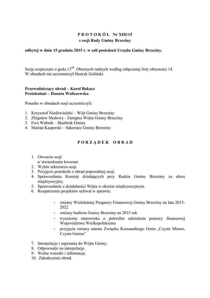 P R O T O K Ó Ł Nr XIII/15 z sesji Rady Gminy Brzeziny odbytej w dniu 15 grudnia 2015 r. w sali posiedzeń Urzędu Gminy Brzeziny. Sesję rozpoczęto o godz.1300. Obecnych radnych według załączonej listy obecności 14. W obradach nie uczestniczył Henryk Goliński. Przewodniczący obrad – Karol Bakacz Protokolant – Danuta Waliszewska Ponadto w obradach sesji uczestniczyli: 1. 2. 3. 4. Krzysztof Niedźwiedzki – Wójt Gminy Brzeziny Zbigniew Słodowy - Zastępca Wójta Gminy Brzeziny Ewa Wabnik – Skarbnik Gminy Marian Kasperski – Sekretarz Gminy Brzeziny PORZĄDEK OBRAD 1. Otwarcie sesji a/ stwierdzenie kworum 2. Wybór sekretarza sesji. 3. Przyjęcie protokołu z obrad poprzedniej sesji. 4. Sprawozdania Komisji działających przy Radzie Gminy Brzeziny za okres międzysesyjny. 5. Sprawozdanie z działalności Wójta w okresie międzysesyjnym. 6. Rozpatrzenie projektów uchwał w sprawie: - zmiany Wieloletniej Prognozy Finansowej Gminy Brzeziny na lata 2015- 2022 zmiany budżetu Gminy Brzeziny na 2015 rok wyrażenia stanowiska o potrzebie udzielenia pomocy finansowej Województwu Wielkopolskiemu przyjęcia zmiany statutu Związku Komunalnego Gmin „Czyste Miasto, Czysta Gmina” 7. Interpelacje i zapytania do Wójta Gminy. 8. Odpowiedzi na interpelacje. 9. Wolne wnioski i informacje. 10. Zakończenie obrad. Ad.1. Otwarcia XIII sesji dokonał Przewodniczący Rady Gminy – Karol Bakacz. Powitał przybyłych na sesję Rady Gminy – radnych Gminy Brzeziny, wójta gminy, skarbnika. Przewodniczący przedstawił porządek obrad. Do porządku obrad nie wniesiono uwag, porządek obrad został przyjęty 13 głosami za. Przewodniczący Rady Karol Bakacz zaproponował wprowadzenie zmiany do w/w porządku, polegającej na dodaniu w pkt.6 projektów uchwał w sprawach: - Ustalenia trybu udzielania i rozliczania dotacji udzielanych publicznym szkołom prowadzonym przez podmioty inne niż Gmina Brzeziny, oraz trybu i zakresu kontroli prawidłowości ich pobrania i wykorzystania, Zmieniająca uchwałę w sprawie określenia wysokości stawek podatku od środków transportowych, Zmiany uchwały Nr XII/94/2015 Rady Gminy Brzeziny dnia 30 listopada 2015 roku w sprawie: określenia wzorów formularzy do wymiaru i poboru podatku od nieruchomości, podatku rolnego, podatku leśnego, Oraz proponuję wprowadzenie zmiany w porządku obrad polegającej na wycofaniu w pkt.6 projektu uchwały w sprawie: - zmiany Wieloletniej Prognozy Finansowej Gminy Brzeziny na lata 2015 -2022 Do w/w propozycji zmiany w porządku obrad nie wniesiono uwag. Przewodniczący obrad Karol Bakacz poddał pod głosowanie przyjęcie porządku obrad z proponowaną zmianą w porządku. Przewodniczący Rady Karol Bakacz - stwierdził, że na ustawowy stan Rady Gminy – 15, w obradach sesji uczestniczy 14 radnych, co stanowi kworum do podejmowania prawomocnych uchwał. Radna Sylwia Lazarek przybyła na obrady sesji o godz. 1315. Ad.2 Na sekretarza sesji zaproponowano radnego Józefa Skoczylasa. Zaproponowany radny został wybrany sekretarzem sesji 13 głosami za. Ad.3 Przewodniczący obrad poinformował, że protokół nr XII/15 został wyłożony do wglądu w sekretariacie gminy. Przypomniał, że każdy radny ma obowiązek zapoznać się z protokołem, w związku z tym, Przewodniczący obrad zaproponował przyjęcie protokołu bez czytania na sesji. Nie było uwag do w/w protokołu. Protokół nr XII/15 z sesji Rady Gminy Brzeziny z dnia 28.10.2015 r. został przyjęty 13 głosami za. Ad.4 Sprawozdanie z działalności Komisji Oświaty, Kultury, Zdrowia i Spraw Socjalnych przeczytała Przewodnicząca Komisji Anna Mituła. Sprawozdanie stanowi załącznik nr 1 do niniejszego protokołu. Sprawozdanie z działalności Komisji Bezpieczeństwa Publicznego i Gospodarki Komunalnej przeczytał Przewodniczący Komisji Roman Witoński. Sprawozdanie stanowi załącznik nr 2 do niniejszego protokołu. Sprawozdanie z działalności Komisji Rewizyjnej przeczytała Anna Mituła. Sprawozdanie stanowi załącznik nr 3 do niniejszego protokołu Sprawozdanie z działalności Komisji Rolnictwa, Budżetu i Finansów przeczytał Jan Niedźwiedź. Sprawozdanie stanowi załącznik nr 4 do niniejszego protokołu. Przewodniczący obrad Karol Bakacz poddał pod głosowanie sprawozdania z działalności międzysesyjnej poszczególnych Komisji działających przy Radzie Gminy. Sprawozdania Komisji działających przy Radzie Gminy Brzeziny zostały przyjęte 14 głosami za. Ad.5 Wójt Krzysztof Niedźwiedzki poinformował: 1. Trwają prace porządkowe przy drogach gminnych. Prace zostały zakończone w Świerczynie, Koloni Przystajnia, Pieczyska, 2. Planowane inwestycje ze środków europejskich w 2015 r są wykonane i zakończone. Priorytetem była inwestycja stacji uzdatniania wody oraz sieci kanalizacji w Brzezinach. Dokumentacja jest zakończona i sfinalizowana. W przyszłości czeka nas przejęcie infrastruktury kanalizacyjnej, deszczowej i drogowej na ulicy Lawendowej w Brzezinach. Obecnie przedsiębiorca, który jest właścicielem terenu na własny koszt przygotowuje dokumentację w celu przekazania infrastruktury na własność Gminie Brzeziny 3. Została zakończona i rozliczona z powiatem droga powiatowa Kalisz – Chudoba, 4. Planowane odcinki dróg gminnych – Jagodziniec i Jamnice zostały zakończone i rozliczone. Dodał, że kolejne inwestycje zakończone ze środków europejskich to chodniki na Osiedlu Generała Zajączka Brzezinach 5. Rozliczony i sfinalizowany został zakup ciężkiego sprzętu dla OSP Brzeziny pn. „Wsparcie systemu ratowniczo – gaśniczego poprzez zakup ciężkiego pojazdu strażackiego dla OSP Brzeziny” realizowanego w ramach programu „WRPO 2007 2013”, 6. Trwa opracowanie realizacji planu niskoemisyjnej w partnerstwie z powiatem kaliskim i Gminą Sieroszewice, została wpłacona należna kwota 4360 zł, 7. Została zakończona modernizacja oświetlenia ulicznego w Sobiesękach, 8. W przygotowaniu jest dokum