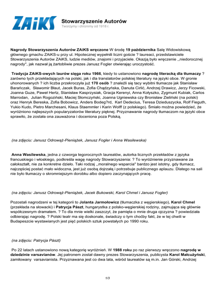 Nagrody Stowarzyszenia Autorów ZAiKS wręczone W środę 19 października Salę Widowiskową głównego gmachu ZAiKS-u przy ul. Hipotecznej wypełnili liczni goście ? laureaci, przedstawiciele Stowarzyszenia Autorów ZAiKS, ludzie mediów, znajomi i przyjaciele. Okazją było wręczenie ,,niedorocznej nagrody'', jak nazwał ją żartobliwie prezes Janusz Fogler otwierając uroczystość. Tradycja ZAiKS-owych laurów sięga roku 1966, kiedy to ustanowiono nagrodę literacką dla tłumaczy ? zarówno tych przekładających na polski, jak i dla translatorów polskiej literatury na języki obce. W gronie uhonorowanych ? ich liczba przekroczyła już 170 osób ? znaleźli się tacy wybitni tłumacze jak Stanisław Barańczak, Sławomir Błaut, Jacek Buras, Zofia Chądzyńska, Danuta Cirlić, Andrzej Drawicz, Jerzy Ficowski, Joanna Guze, Paweł Hertz, Stanisław Kasprzysiak, Gracja Kerenyi, Anna Kołyszko, Zygmunt Kubiak, Carlos Marrodan, Julian Rogoziński, Maciej Słomczyński, Joanna Ugniewska czy Bronisław Zieliński (na polski) oraz Henryk Bereska, Zofia Bobowicz, Anders Bodeg?rd, Karl Dedecius, Teresa Dzieduszycka, Rolf Fieguth, Yukio Kudo, Pietro Marchesani, Klaus Staemmler i Karin Wolff (z polskiego). Śmiało można powiedzieć, że wyróżniono najlepszych popularyzatorów literatury pięknej. Przyznawanie nagrody tłumaczom na języki obce sprawiło, że została ona zauważona i doceniona poza Polską. (na zdjęciu: Janusz Odrowąż-Pieniążek, Janusz Fogler i Anna Wasilewska) Anna Wasilewska, jedna z czworga tegorocznych laureatów, autorka licznych przekładów z języka francuskiego i włoskiego, podkreśla wagę nagrody Stowarzyszenia: ? To wyróżnienie przyznawane za całokształt, nie za konkretne dzieło. Taki rodzaj ,,moralnego wsparcia'' bardzo jest istotny, gdy tłumacz, najczęściej postać mało widoczna, jest już osobą dojrzałą i potrzebuje publicznego aplauzu. Dlatego na sali nie było tłumaczy o skromniejszym dorobku albo dopiero zaczynających pracę. (na zdjęciu: Janusz Odrowąż-Pieniążek, Jacek Bukowski, Karol Chmel i Janusz Fogler) Pozostali nagrodzeni w tej kategorii to Jolanta Jarmołowicz (tłumaczka z węgierskiego), Karol Chmel (przekłada na słowacki) i Patrycja Pászt, hungarystka z polsko-węgierskiej rodziny, zajmująca się głównie współczesnym dramatem. ? To dla mnie wielki zaszczyt, że pamięta o mnie druga ojczyzna ? powiedziała odbierając nagrodę. ? Polski teatr ma się doskonale, świadczy o tym choćby fakt, że w tej chwili w Budapeszcie wystawianych jest pięć polskich sztuk powstałych po 1990 roku. (na zdjęciu: Patrycja Pászt) Po 22 latach ustanowiono nową kategorię wyróżnień. W 1988 roku po raz pierwszy wręczono nagrodę w dziedzinie varsavianów. Jej patronem został dawny prezes Stowarzyszenia, publicysta Karol Małcużyński, zamiłowany varsavianista. Przyznawana jest co dwa lata, wśród laureatów są m.in. Jan Górski, Andrzej 1/3 Kunert, Krystyna Kolińska, Juliusz Wiktor Gomulicki, Olgierd Budrewicz, Jarosław Abramow-Newerly, Jerzy S. Majewski. W tym roku nagrodzono dwie osoby: Barbarę Mączeńską i Krystynę Drzewiecką, polonistkę i historyka, autorki książek dla dzieci, twórczynie oficyny Veda specjalizującej się w tematyce warszawskiej. Barbara Saidler, krytyk filmowy, uczestniczka powstania warszawskiego, mówiła o ich pracy: ? Kiedyś varsavianów nie brakowało, potem nastąpił okres posuchy, aż wreszcie pojawiła się Veda. Jej autorki piszą znakomicie, a co ważniejsze, zwracają się do nowego pokolenia, do młodzieży, która nie zawsze jest w stanie zrozumieć styl pisarzy przed- i powojennych. (na zdjęciu: Barbara Seidler, Krystyna Drzewiecka, Barbara Mączeńska i Janusz Fogler) Barbara Saidler przypomniała pierwszą książkę obu autorek: ? Był to zbiór pocztówek pokazujących starą Warszawę. Gdy przyniosłam ją na posiedzenie Zarządu, nie można było prowadzić zebrania, bo wszyscy wyrywali sobie książkę z rąk. Kolejną kategorię powołano w 1990 roku ? nagroda za popularyzację polskiej twórczości rozrywkowej jest wyróżnieniem wręczanym rokrocznie, otrzymali ją m.in. Nina Terentiew, Zbigniew Adrjański, Stanisław Hadyna, Witold Pograniczny, Stefan Rachoń, telewizyjny duet Maria Szabłowska-Krzysztof Szewczyk. Józef Węgrzyn, tegoroczny laureat, od lat związany jest z muzyką. We wszystkich stworzonych przez niego programach ? ,,Teleexpressie'', ,,Europa da się lubić'' czy ,,Jaka to melodia'' (ten ostatni miał już ponad 5000 odsłon, które wedle podawanych z uśmiechem szacunków oglądało półtora miliarda ludzi) zawsze znajdowało się miejsce dla muzyki. W latach 1990-1991, kiedy był szefem radiowej Dwójki, udział programów muzycznych był najwyższy na świecie i wynosił 15 procent czasu antenowego. Mało kto wie, że Józef Węgrzyn był pomysłodawcą i współtwórcą organizowanego od 1979 roku Maratonu Warszawskiego, w którym bierze udział do dziś. (na zdjęciu: Janusz Fogler, Józef Węgrzyn i Marek Hojda) Następne nagrody powstawały w mniejszych odstępach czasu: od 2001 roku ZAiKS przyznaje co dwa lata laur za wybitne osiągnięcia w dziedzinie choreografii (wyróżnieni m.in. Ewa Wycichowska, Emil Wesołowski, Teresa Kujawa-Knapik). Nagroda dla Henryka Rutkowskiego, choreografa i artysty baletu, przypadła mu w roku podwójnego jubileuszu: 55-lecia pracy artystycznej i 35-lecia członkostwa Stowarzyszenia. (na zdjęciu: Zofia Rudnicka i Henryk Rutkowski) W 2006 roku ustanowiono nagrodę za propagowanie polskiej muzyki współczesnej. Uhonorowani nią zostali m.in. Władysław Słowiński, Marian Borkowski. W tym roku nagrody nie przyznano. Od 2010 roku wręczana jest nagroda za wybitne osiągnięcia w dziedzinie sztuk wizualnych. Jej pierwszą laureatką została Magdalena Abakanowicz, w tym roku zdobył ją Tomasz Gudzowaty, fotografik, który może pochwalić się największą liczbą światowych wyróżnień i dypl