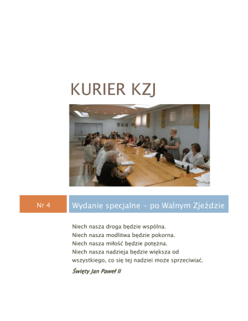 KURIER KZJ Nr 4 Wydanie specjalne - po Walnym Zjeździe Niech nasza droga będzie wspólna. Niech nasza modlitwa będzie pokorna. Niech nasza miłość będzie potężna. Niech nasza nadzieja będzie większa od wszystkiego, co się tej nadziei może sprzeciwiać. Święty Jan Paweł II KURIER KZJ, nr 4 ODBYŁO SIĘ WALNE ZEBRANIE KZJ 29.06.2014 Kochane Koleżanki! Miło nam poinformować, że dnia 29.06.2014 r. na Kabatach w Warszawie, w przedszkolu Sióstr Niepokalanek o godz. 11.00 rozpoczęło się najważniejsze wydarzenie ostatnich trzech lat: Walny Zjazd Krajowy Koleżeńskiego Zjednoczenia Jazłowieckiego. W spotkaniu, poprzedzonym Mszą Św. uczestniczyły 44 członkinie Stowarzyszenia z całej Polski. Z radością gościłyśmy również na naszym spotkaniu Czcigodną Matkę Wawrzynę, Przełożoną Generalną Sióstr Niepokalanek oraz s. Janinę i s. Benedyktę. Obecność Sióstr była dla nas zaskoczeniem, tym bardziej, że Siostry przygotowują się do ważnego dla nich wydarzenia, jakim jest Kapituła. A jednak, mimo tak wielu, ważnych spraw i nam poświęciły swój cenny czas. Matka Wawrzyna z uwagą przysłuchiwała się naszym obradom i zabierała głos w istotnych sprawach, dotyczących przyszłości KZJ. Na początku wysłuchałyśmy sprawozdań z działalności poszczególnych kół Stowarzyszenia oraz sprawozdania Zarządu pod przewodnictwem Marii Wiercińskiej i sprawozdania Komisji Rewizyjnej. Następnie udzielono absolutorium odchodzącemu Zarządowi. Strona 1 Koleżeńskie Zjednoczenie Jazłowieckie Kochany były Zarządzie! Kochana Maluki, Grażynko, Basiu, Marysiu, Marto, Marysiu, Marleno, Teresko, Krysiu! Pragniemy z całego serca podziękować Wam, drogie koleżanki, za wieloletnią pracę i zaangażowanie w działalność Stowarzyszenia, szerzenie niepokalańskich wartości i idei, które są bliskie nam wszystkich. Dziękujemy za wszelki trud i każde staranie, aby Stowarzyszenie mogło istnieć i rozwijać się, dziękujemy za poświęcony czas i troskę, aby było nas jak najwięcej i by każda wychowanka czuła się dobrze w naszym gronie. Dziękujemy! W dalszej części spotkania przedstawiono kandydatów do nowego Zarządu. Spośród 12 zgłoszonych osób do Zarządu wybrano: Ewę Dubacką, Martę Mieszkowską, Beatę Śmigierę, Marlenę Złoch, Izę Gomzę, Małgorzatę Witkowską, Marię Harasymowicz. Annę Majdę-Baranowską, Anię Olsztyńską, Następnie odbyły się wybory do Komisji Rewizyjnej, która ostatecznie ukonstytuowała się w składzie: Przewodnicząca Katarzyna Krystkiewicz; Członkinie - Anna Skrzyńska i Anna Jaworska-Jasiewicz Strona 2 KURIER KZJ, nr 4 Kolejnym punktem było omówienie projektu nowego statutu. Ponieważ projekt ten wzbudzał wiele pytań i kontrowersji, zatrzymywano się na fragmentach wymagających szczegółowego omówienia. Dyskusja była burzliwa, ale owocna. Fakt ten świadczy, że każdej z obecnych tam osób zależało, aby nowy statut otwierał Stowarzyszeniu nową drogę i lepszą przyszłość, a jednocześnie chronił wartości i założenia przekazywane z pokolenia na pokolenie od prawie 100 lat. Po wprowadzeniu zgłoszonych zmian nowy statut zostanie jeszcze raz rozesłany wszystkim kołom, a jego zatwierdzenie (wymagane 2/3 głosów) nastąpi we wrześniu podczas pielgrzymki do Pani Jazłowieckiej w Szymanowie. Po zakończonych obradach o godz. 16.30 nowy Zarząd ukonstytuował się. Prezes Stowarzyszenia – Marta Mieszkowska Członek – Marlena Złoch Wiceprezes – Beata Śmigiera Członek – Anna Majda-Baranowska Wiceprezes – Izabela Gomza Członek – Małgorzata Witkowska Skarbnik – Ewa Dubacka Członek – Maria Harasymowicz Sekretarz – Anna Olsztyńska Strona 3 Koleżeńskie Zjednoczenie Jazłowieckie PONIŻEJ PRZEDSTAWIAMY SYLWETKI OSÓB NOWEGO ZARZĄDU: Prezes Stowarzyszenia – Marta Mieszkowska W Szymanowie Przegalińska. Matura 1960. Całe 4 klasy w Szymanowie. Studia na Uniwersytecie Warszawskim na wydz. Mat-Fiz., kierunek fizyka. Po dyplomie praca początkowo w PIHM (obecnie IMiGW), Później - przekwalifikowuję się na informatykę i w tej dziedzinie pracuję do emerytury. W okresie "Solidarności" byłam przewodniczącą Komisji Zakładowej i delegatem na zjazd "Mazowsza". Prywatnie jestem od 49 lat mężatką, dwoje dzieci i troje wnucząt (12, 8 i 6 lat) to mój dorobek rodzinny. Z KZJ jestem związana od początku jego istnienia. Kilkakrotnie byłam członkiem zarządu (m.inn. jako v-prezeska, a ostatnio przez niemal 3 kadencje jako skarbnik). Wiążę duże nadzieje z odmłodzeniem składu Zarządu i z nowym spojrzeniem z tym związanym. Wiceprezes – Beata Śmigiera (Dzikowska) Od listopada 2013 r. dzięki wytrwałości i uporowi Krysi Pietrzyk zaangażowałam się w aktywizację środowiska KZJ i wychowanek niepokalańskich, współredagując Kurier KZJ, stronę internetową i rozmawiając przez telefon z osobami, które wypełniły internetowo ankietę „Konkurs na nazwę stowarzyszenia”. A może rozmawiałam z Tobą? Prywatnie jestem maturzystką wałbrzyską (1995), jako pedagog specjalny i logopeda pracuję z dziećmi i młodzieżą. A przez 24h na dobę próbuję z mężem wychować dwójkę małych, niesfornych dzieci. Wiceprezes – Izabela Gomza Jestem wychowanką szymanowską. Matura 1987 rok ( klasa siostry Rut, s. Imeldy i s. Róży). Mam doświadczenie w pracy i współpracy z organizacjami pozarządowymi. Chciałabym aby w tej kadencji Zarządu praca poszła 3 torami: integracji pomiędzy wychowankami (międzypokoleniowej, wewnątrz kół i między kołami), z tego powodu podjęłam się dla koła warszawskiego tak zwanych "wyjść z KZJ-em", których dotychczas odbyło się 5 i planowane są następne ( wyjścia do kina, na koncerty, do muzeów itp.); upowszechniania myśli błogosławionej Matki Marceliny Darowskiej, wśród wychowanek i Strona 4 KURIER KZJ, nr 4 "na zewnątrz" środowiska oraz wsparcie moralne i materialne a także pozyskiwanie 