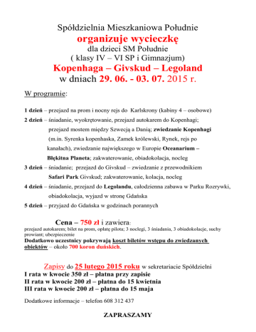 Spółdzielnia Mieszkaniowa Południe organizuje wycieczkę dla dzieci SM Południe ( klasy IV – VI SP i Gimnazjum) Kopenhaga – Givskud – Legoland w dniach 29. 06. - 03. 07. 2015 r. W programie: 1 dzień – przejazd na prom i nocny rejs do Karlskrony (kabiny 4 – osobowe) 2 dzień – śniadanie, wyokrętowanie, przejazd autokarem do Kopenhagi; przejazd mostem między Szwecją a Danią; zwiedzanie Kopenhagi (m.in. Syrenka kopenhaska, Zamek królewski, Rynek, rejs po kanałach), zwiedzanie największego w Europie Oceanarium – Błękitna Planeta; zakwaterowanie, obiadokolacja, nocleg 3 dzień – śniadanie; przejazd do Givskud – zwiedzanie z przewodnikiem Safari Park Givskud; zakwaterowanie, kolacja, nocleg 4 dzień – śniadanie, przejazd do Legolandu, całodzienna zabawa w Parku Rozrywki, obiadokolacja, wyjazd w stronę Gdańska 5 dzień – przyjazd do Gdańska w godzinach porannych Cena – 750 zł i zawiera: przejazd autokarem; bilet na prom, opłatę pilota; 3 noclegi, 3 śniadania, 3 obiadokolacje, suchy prowiant; ubezpieczenie Dodatkowo uczestnicy pokrywają koszt biletów wstępu do zwiedzanych obiektów – około 700 koron duńskich. Zapisy do 25 lutego 2015 roku w sekretariacie Spółdzielni I rata w kwocie 350 zł – płatna przy zapisie II rata w kwocie 200 zł – płatna do 15 kwietnia III rata w kwocie 200 zł – płatna do 15 maja Dodatkowe informacje – telefon 608 312 437 ZAPRASZAMY