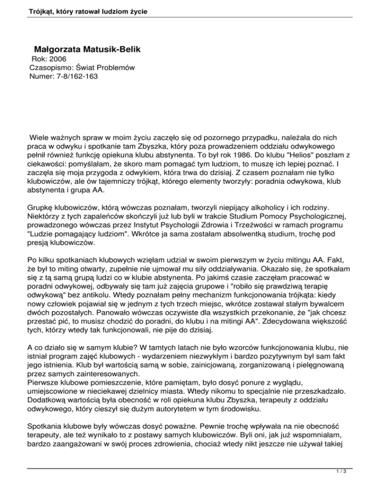 Trójkąt, który ratował ludziom życie Małgorzata Matusik-Belik Rok: 2006 Czasopismo: Świat Problemów Numer: 7-8/162-163 Wiele ważnych spraw w moim życiu zaczęło się od pozornego przypadku, należała do nich praca w odwyku i spotkanie tam Zbyszka, który poza prowadzeniem oddziału odwykowego pełnił również funkcję opiekuna klubu abstynenta. To był rok 1986. Do klubu "Helios" poszłam z ciekawości: pomyślałam, że skoro mam pomagać tym ludziom, to muszę ich lepiej poznać. I zaczęła się moja przygoda z odwykiem, która trwa do dzisiaj. Z czasem poznałam nie tylko klubowiczów, ale ów tajemniczy trójkąt, którego elementy tworzyły: poradnia odwykowa, klub abstynenta i grupa AA. Grupkę klubowiczów, którą wówczas poznałam, tworzyli niepijący alkoholicy i ich rodziny. Niektórzy z tych zapaleńców skończyli już lub byli w trakcie Studium Pomocy Psychologicznej, prowadzonego wówczas przez Instytut Psychologii Zdrowia i Trzeźwości w ramach programu "Ludzie pomagający ludziom". Wkrótce ja sama zostałam absolwentką studium, trochę pod presją klubowiczów. Po kilku spotkaniach klubowych wzięłam udział w swoim pierwszym w życiu mitingu AA. Fakt, że był to miting otwarty, zupełnie nie ujmował mu siły oddziaływania. Okazało się, że spotkałam się z tą samą grupą ludzi co w klubie abstynenta. Po jakimś czasie zaczęłam pracować w poradni odwykowej, odbywały się tam już zajęcia grupowe i "robiło się prawdziwą terapię odwykową" bez antikolu. Wtedy poznałam pełny mechanizm funkcjonowania trójkąta: kiedy nowy człowiek pojawiał się w jednym z tych trzech miejsc, wkrótce zostawał stałym bywalcem dwóch pozostałych. Panowało wówczas oczywiste dla wszystkich przekonanie, że "jak chcesz przestać pić, to musisz chodzić do poradni, do klubu i na mitingi AA". Zdecydowana większość tych, którzy wtedy tak funkcjonowali, nie pije do dzisiaj. A co działo się w samym klubie? W tamtych latach nie było wzorców funkcjonowania klubu, nie istniał program zajęć klubowych - wydarzeniem niezwykłym i bardzo pozytywnym był sam fakt jego istnienia. Klub był wartością samą w sobie, zainicjowaną, zorganizowaną i pielęgnowaną przez samych zainteresowanych. Pierwsze klubowe pomieszczenie, które pamiętam, było dosyć ponure z wyglądu, umiejscowione w nieciekawej dzielnicy miasta. Wtedy nikomu to specjalnie nie przeszkadzało. Dodatkową wartością była obecność w roli opiekuna klubu Zbyszka, terapeuty z oddziału odwykowego, który cieszył się dużym autorytetem w tym środowisku. Spotkania klubowe były wówczas dosyć poważne. Pewnie trochę wpływała na nie obecność terapeuty, ale też wynikało to z postawy samych klubowiczów. Byli oni, jak już wspomniałam, bardzo zaangażowani w swój proces zdrowienia, chociaż wtedy nikt jeszcze nie używał takiej 1/3 Trójkąt, który ratował ludziom życie terminologii. Dyskusje klubowe były przesiąknięte psychologią - nie zawsze dla mnie, psychologa, zrozumiałą. Rozmawiało się też o nawrotach picia, sama prowadziłam ciekawe zajęcia w klubie na ten temat, nie mając jeszcze żadnego zaplecza teoretycznego ani "metodycznego". Tak więc sporo wtedy było wątków terapeutycznych i było to dla wszystkich oczywiste, że rozmowy o tym, jak nie pić, są konieczne. Mówiło się: "Człowieku, jak nie chcesz wrócić do picia, to rób coś ze sobą". A robienie czegoś ze sobą oznaczało aktywność, otwartość i uczciwość. Aktywność polegała na obecności wszędzie tam, gdzie byli niepijący alkoholicy, a takich spotkań było coraz więcej. W samym klubie odbywały się nie tylko rozmowy i nieraz gorliwe dyskusje o trzeźwieniu, organizowano też sporo imprez z byle jakiego powodu. Były zwykłe spotkania przy muzyce bez specjalnej okazji, ale też wszystkie okolicznościowe daty z kalendarza stawały się powodem do wspólnych, nieraz długo pamiętanych imprez. Wyliczenie można zacząć od wspólnego Sylwestra z polonezem odtańczonym na dworze przy dźwiękach akordeonu. Zaraz potem bale przebierańców, Dzień Kobiet, Dzień Dziecka, Andrzejki i tak do kolejnego Sylwestra. A w czasie wakacji były obozy terapeutyczne, nie wybierane z oferty krajowej, bo takiej nie było, lecz organizowane od początku do końca przez klubowiczów z ich opiekunem na czele. Klub Abstynenta był wtedy dla wielu osób drugim domem. Dla niektórych czasami był nawet tym lepszym domem, gdzie można było ogrzać się wzajemną życzliwością. Do dziś pamiętam klimat tamtych spotkań: ludziom chciało się po prostu ze sobą być. Nie trzeba było pracować nad integracją grupy, ponieważ wszyscy nawzajem dbali o siebie. W jaki sposób? Byli na siebie uważni, nie było grupek, no i nie pamiętam żadnych poważnych konfliktów. A już zupełnym przebojem sezonu była przyśpiewka przywieziona z Warszawy: "Dobrze, że jesteś (trzy razy), co by to było, gdyby cię nie było, co by to było". Myślę, że siła jej oddziaływania była taka, jak po zakończeniu profesjonalnego warsztatu pracy nad poczuciem własnej wartości. Jak dalej potoczyła się historia trójkąta: poradnia - klub - AA? Z czasem figura ta zaczęła zmieniać kształt z powodu kolejno pojawiających się instytucji, odgrywających pozytywną rolę w kształtowaniu raciborskiego środowiska odwykowego. Należały do nich miedzy innymi Gminna Komisja ds. Rozwiązywania Problemów Alkoholowych, Miejski Ośrodek Pomocy Społecznej, utworzone stanowisko pełnomocnika prezydenta ds. problemów społecznych czy wreszcie kolejne powstające w mieście grupy AA. Pojawiły się też nowe uregulowania prawne dotyczące problemów alkoholowych. Co w tym czasie działo się z klubem abstynenta? Powoli zaczął tracić swoją siłę oddziaływania. Zanim do tego doszło, klubowicze podjęli jeszcze parę bardzo pożytecznych inicjatyw, między innymi zorganizowali w mieście forum abstynenckie dla 