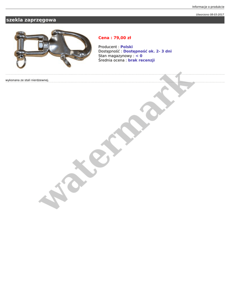 Informacje o produkcie Utworzono 08-03-2017 szekla zaprzęgowa Cena : 79,00 zł Producent : Polski Dostępność : Dostępność ok. 2- 3 dni Stan magazynowy : < 0 Średnia ocena : brak recenzji w at er m ar k wykonana ze stali nierdzewnej.