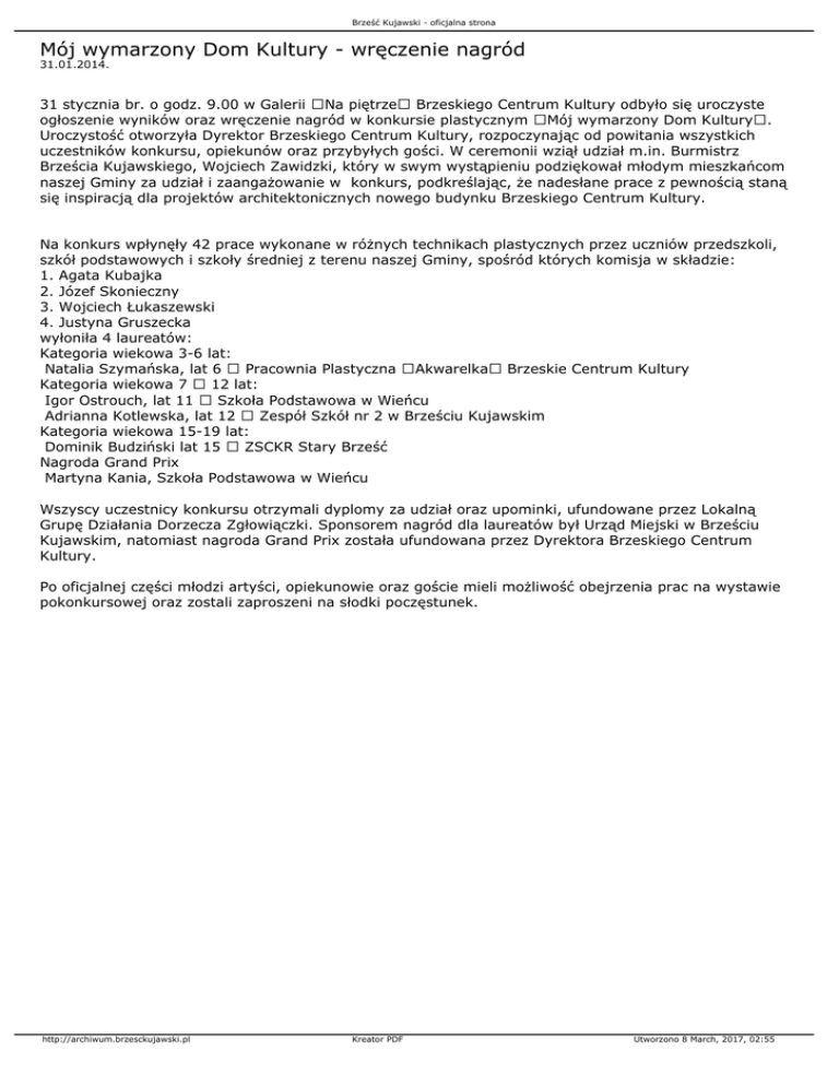 Brześć Kujawski - oficjalna strona Mój wymarzony Dom Kultury - wręczenie nagród 31.01.2014. 31 stycznia br. o godz. 9.00 w Galerii Na piętrze Brzeskiego Centrum Kultury odbyło się uroczyste ogłoszenie wyników oraz wręczenie nagród w konkursie plastycznym Mój wymarzony Dom Kultury. Uroczystość otworzyła Dyrektor Brzeskiego Centrum Kultury, rozpoczynając od powitania wszystkich uczestników konkursu, opiekunów oraz przybyłych gości. W ceremonii wziął udział m.in. Burmistrz Brześcia Kujawskiego, Wojciech Zawidzki, który w swym wystąpieniu podziękował młodym mieszkańcom naszej Gminy za udział i zaangażowanie w konkurs, podkreślając, że nadesłane prace z pewnością staną się inspiracją dla projektów architektonicznych nowego budynku Brzeskiego Centrum Kultury. Na konkurs wpłynęły 42 prace wykonane w różnych technikach plastycznych przez uczniów przedszkoli, szkół podstawowych i szkoły średniej z terenu naszej Gminy, spośród których komisja w składzie: 1. Agata Kubajka 2. Józef Skonieczny 3. Wojciech Łukaszewski 4. Justyna Gruszecka wyłoniła 4 laureatów: Kategoria wiekowa 3-6 lat: Natalia Szymańska, lat 6 Pracownia Plastyczna Akwarelka Brzeskie Centrum Kultury Kategoria wiekowa 7 12 lat: Igor Ostrouch, lat 11 Szkoła Podstawowa w Wieńcu Adrianna Kotlewska, lat 12 Zespół Szkół nr 2 w Brześciu Kujawskim Kategoria wiekowa 15-19 lat: Dominik Budziński lat 15 ZSCKR Stary Brześć Nagroda Grand Prix Martyna Kania, Szkoła Podstawowa w Wieńcu Wszyscy uczestnicy konkursu otrzymali dyplomy za udział oraz upominki, ufundowane przez Lokalną Grupę Działania Dorzecza Zgłowiączki. Sponsorem nagród dla laureatów był Urząd Miejski w Brześciu Kujawskim, natomiast nagroda Grand Prix została ufundowana przez Dyrektora Brzeskiego Centrum Kultury. Po oficjalnej części młodzi artyści, opiekunowie oraz goście mieli możliwość obejrzenia prac na wystawie pokonkursowej oraz zostali zaproszeni na słodki poczęstunek. http://archiwum.brzesckujawski.pl Kreator PDF Utworzono 8 March, 2017, 02:55