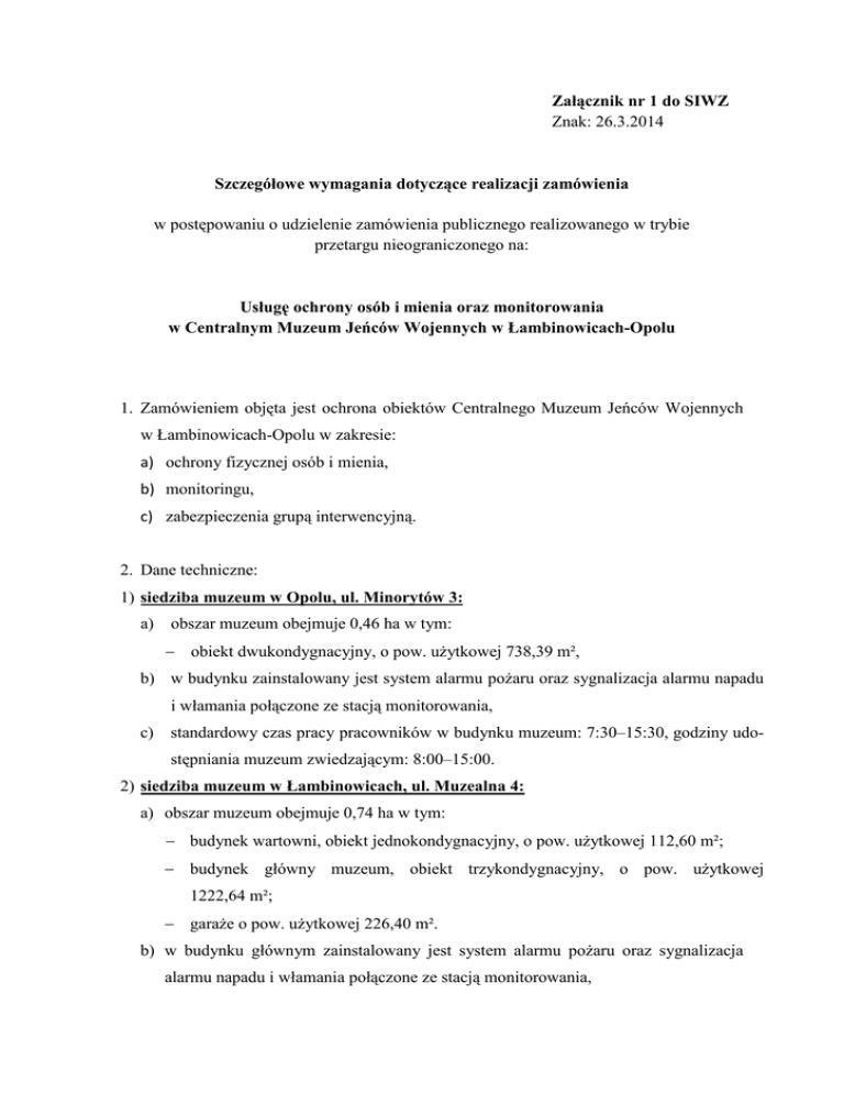 Załącznik nr 1 do SIWZ Znak: 26.3.2014 Szczegółowe wymagania dotyczące realizacji zamówienia w postępowaniu o udzielenie zamówienia publicznego realizowanego w trybie przetargu nieograniczonego na: Usługę ochrony osób i mienia oraz monitorowania w Centralnym Muzeum Jeńców Wojennych w Łambinowicach-Opolu 1. Zamówieniem objęta jest ochrona obiektów Centralnego Muzeum Jeńców Wojennych w Łambinowicach-Opolu w zakresie: a) ochrony fizycznej osób i mienia, b) monitoringu, c) zabezpieczenia grupą interwencyjną. 2. Dane techniczne: 1) siedziba muzeum w Opolu, ul. Minorytów 3: a) obszar muzeum obejmuje 0,46 ha w tym: − obiekt dwukondygnacyjny, o pow. uŜytkowej 738,39 m², b) w budynku zainstalowany jest system alarmu poŜaru oraz sygnalizacja alarmu napadu i włamania połączone ze stacją monitorowania, c) standardowy czas pracy pracowników w budynku muzeum: 7:30–15:30, godziny udostępniania muzeum zwiedzającym: 8:00–15:00. 2) siedziba muzeum w Łambinowicach, ul. Muzealna 4: a) obszar muzeum obejmuje 0,74 ha w tym: − budynek wartowni, obiekt jednokondygnacyjny, o pow. uŜytkowej 112,60 m²; − budynek główny muzeum, obiekt trzykondygnacyjny, o pow. uŜytkowej 1222,64 m²; − garaŜe o pow. uŜytkowej 226,40 m². b) w budynku głównym zainstalowany jest system alarmu poŜaru oraz sygnalizacja alarmu napadu i włamania połączone ze stacją monitorowania, c) standardowy czas pracy pracowników w budynku muzeum: 7:00–17:00, godziny udostępniania muzeum zwiedzającym (Zamawiający zastrzega moŜliwość zmiany poniŜszych godzin, o czym poinformuje Wykonawcę): od 1 października do 30 kwietnia: wtorek - piątek: 9.00 - 16.00, w soboty, niedziele i święta państwowe 10.00 - 17.00, od 1 maja do 30 września: wtorek - piątek 9.00 - 17.00, w soboty, niedziele i święta państwowe 10.00 - 17.00 Centralne Muzeum Jeńców Wojennych w Łambinowicach-Opolu zostało umieszczone przez Wojewodę Opolskiego w wykazie obszarów, obiektów i urządzeń waŜnych dla obronności interesu gospodarczego, bezpieczeństwa publicznego i innych waŜnych interesów państwa. 3. Obowiązki Wykonawcy wynikające z realizacji przedmiotu zamówienia: 1) w siedzibie muzeum w Opolu, ul. Minorytów 3: a) całodobowa ochrona obiektu i terenu w formie monitoringu systemu antywłamaniowego oraz przeciwpoŜarowego, a takŜe zabezpieczenia technicznego z przywołaniem grupy interwencyjnej, po otrzymaniu sygnału ze stacji monitorowania alarmów oraz na wezwanie Zleceniodawcy; b) zatrudnienie pracownika w charakterze portiera w godzinach 7.30 - 17.00; Zakres obowiązków portiera będzie obejmował w szczególności: − otwieranie przed rozpoczęciem pracy oraz zamykanie po jej zakończeniu drzwi wejściowych do budynku muzeum oraz bramy wejściowej, − wydawanie i odbiór kluczy do pomieszczeń pracownikom muzeum, − kierowanie interesantów do odpowiednich działów i prowadzenie ich ewidencji, − udzielanie informacji dot. urzędowania muzeum, − przeprowadzenie kontroli pomieszczeń i terenu muzeum poza godzinami pracy jednostki, w tym: wyłączanie zbędnego oświetlenia, sprawdzanie właściwego zamknięcia okien i drzwi w poszczególnych pomieszczeniach po godzinach pracy pracowników muzeum, przed uzbrojeniem urządzeń antywłamaniowych, − uzbrajanie i rozbrajanie urządzeń antywłamaniowych, po uprzednim upewnieniu się, Ŝe nikt nie przebywa w strefie objętej systemem, − reagowanie na zagroŜenia zaistniałe na terenie obiektu poprzez natychmiastowe zawiadamianie Zamawiającego, stacji monitorowania, a w razie potrzeby wezwanie policji, straŜy poŜarnej, pogotowia ratunkowego, − przywołanie grupy interwencyjnej na polecenie Zamawiającego lub w razie stwierdzenia istotnego zagroŜenia, w szczególności w sytuacji zagroŜenia bezpieczeństwa osób i mienia lub naruszenia porządku publicznego. 2) w siedzibie muzeum w Łambinowicach, ul. Muzealna 4: a) całodobowa ochrona obiektu oraz terenu w formie monitoringu systemu antywłamaniowego oraz przeciwpoŜarowego, a takŜe zabezpieczenia technicznego z przywołaniem grupy interwencyjnej, po otrzymaniu sygnału ze stacji monitorowania alarmów oraz na wezwanie Zleceniodawcy; b) ochrona fizyczna osób, obiektów, mienia oraz terenu posesji wykonywana przez jednego licencjonowanego pracownika ochrony na zmianie: w okresie sezonu tj. od 01.05.2014 r. do 30.09.2014 r., od 01.05.2015 r. do 30.09.2015 r. oraz od 01.05.2016 r. do 30.09.2016 r. − poniedziałek w godz. 16.00 – 7.00 − wtorek/piątek w godz. 17.00 – 7.00 − piątek/sobota w godz. 17.00 – 7.00 − sobota/niedziela w godz. 7.00 – 7.00 − niedziela/poniedziałek w godz. 7.00 – 7.00, w okresie poza sezonem od 01.10.2014 r. do 30.04.2015 r., od 01.10.2015 r. do 30.04.2016 r. oraz od 01.10.2016 r. do 31.12.2016 r. − poniedziałek/piątek w godz. 16.00 – 7.00 − piątek/sobota w godz. 17.00 – 7.00 − sobota/niedziela w godz. 7.00 – 7.00 − niedziela/poniedziałek w godz. 7.00 – 7.00 c) ochrona mienia i kontrola jego zabezpieczenia przed kradzieŜą, zniszczeniem, poŜarem i innymi zdarzeniami losowymi, d) fizyczne zabezpieczenie ochranianych osób, mienia oraz obiektów, w szczególności przed przedostaniem się do nich osób nieupowaŜnionych; e) zapewnienie niezbędnych środków łączności radiowej działających na wydzielonym dopuszczonym do uŜycia przez właściwą instytucję paśmie, f) przeprowadzenie kontroli pomieszczeń i terenu muzeum poza godzinami pracy jednostki, w tym: wyłączanie zbędnego oświetlenia, sprawdzanie właściwego zamknięcia okien i drzwi w poszczególnych pomieszczeniach po godzinach pracy pracowników muzeum, przed uzbrojeniem urządzeń antywłamaniowych, g) uzbrajanie i rozbrajanie urządzeń antywłamaniowych, po uprzednim upewnieniu się, Ŝe nikt nie przebywa w strefie objętej systemem, h) identyfikowanie zagroŜeń i reagowanie na zagroŜenia zaistniałe na terenie obiektu poprzez natychmi