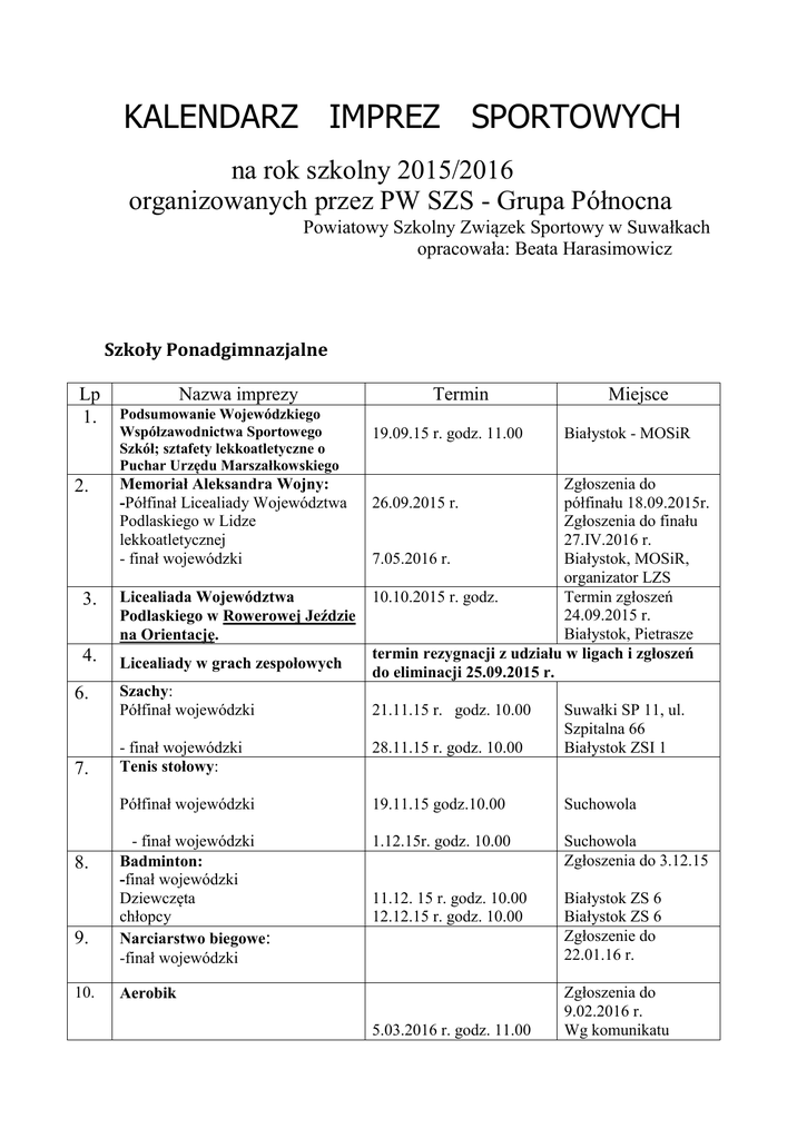 kalendarz imprez sportowych