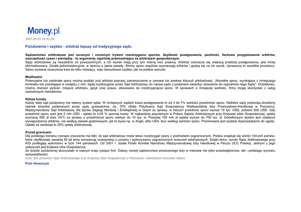2007-04-03 14:42:29 Polubownie i szybko - arbitraż lepszy od tradycyjnego sądu Sądownictwo arbitrażowe jest uznanym i cenionym trybem rozstrzygania sporów. Szybkość postępowania, poufność, fachowe przygotowanie arbitrów, oszczędność czasu i pieniędzy - to argumenty najsilniej przemawiające za arbitrażem gospodarczym. Sądy arbitrażowe są niezależne od powszechnych, a ich wyroki mają przy tym równą moc prawną. Arbitraż odznacza się większą prostotą postępowania, jest mniej sformalizowany. Działa jednoinstancyjnie, w oparciu o jasne zasady. Strony sporu wspólnie wyznaczają arbitrów i godzą się na ich wyrok. Upraszcza to wszelkie procedury. Samo wydanie orzeczenia trwa do kilku miesięcy, więc stosunkowo szybko, jak na polskie warunki. Możliwości Potencjalne lub zaistniałe spory można poddać pod arbitraż poprzez zamieszczenie w umowie lub aneksie klauzuli arbitrażowej: „Wszelkie spory, wynikające z niniejszego kontraktu lub powstające w związku z nim, będą rozstrzygane przez Sąd Arbitrażowy (tu nazwa sądu z podaniem siedziby) stosownie do regulaminu tego Sądu". Dodatkowo, można również wybrać: miejsce arbitrażu, język oraz prawo, stosowane do rozstrzygnięcia sporu. W sprawach o mniejszej wartości, firmy mogą skorzystać z usług zawodowych mediatorów. Niższe koszty Każdy stały sąd polubowny ma własny system opłat. W mniejszych sądach koszt postępowania to od 3 do 7% wartości przedmiotu sporu. Niektóre sądy pobierają określony ułamek kosztów pobieranych przez sądy powszechne, np. 70% (Stały Polubowny Sąd Gospodarczy Wielkopolskiej Izby Przemysłowo-Handlowej w Poznaniu). Międzynarodowy Sąd Arbitrażowy dla Spraw Żeglugi Morskiej i Śródlądowej w Gdyni za sprawy, w których przedmiot sporu wynosi 10 tys. USD, pobiera 500 USD. Gdy przedmiot sporu wart jest 5 mln USD - opłata to 0,05 % spornej kwoty. W najbardziej popularnym w Polsce Sądzie Arbitrażowym przy Krajowej Izbie Gospodarczej, opłaty wynoszą 500 zł (bez VAT) za sprawy o przedmiocie sporu wartym do 10 tys. zł. Powyżej 100 mln zł opłata wynosi do 700 tys. zł. Dodatkowym atutem jest ustalanie wynagrodzenia arbitrów, nie według stawek godzinowych, jak to bywa np. w Anglii, albo USA, lecz według wartości sporu. Premiowane jest szybkie doprowadzenie do ugody. Opłata za mediacje to 20% opłaty arbitrażowej. Ponad granicami Dla polskiego biznesu rosnące znaczenie ma fakt, że sąd arbitrażowy może łatwo rozstrzygać spory z podmiotami zagranicznymi. Polska znajduje się wśród 144-ech państw, które ratyfikowały zawartą 50 lat temu konwencję nowojorską o uznaniu i wykonywaniu zagranicznych orzeczeń arbitrażowych. Dzięki temu, wyroki Sądu Arbitrażowego przy KIG podlegają wykonaniu w tych 144 państwach. Od 2001 r. działa Polski Komitet Narodowy Międzynarodowej Izby Handlowej w Paryżu (ICC Polska). Jednym z jego założycieli jest Krajowa Izba Gospodarcza. Ze ścieżki polubownej skorzystało w naszym kraju tysiące firm. Dalszy rozwój sądownictwa polubownego leży w interesie nie tylko przedsiębiorców, ale i polskiego wymiaru sprawiedliwości. Autor jest prezesem Sądu Arbitrażowego przy Krajowej Izbie Gospodarczej w Warszawie i adwokatem kancelarii Salans Piotr Nowaczyk