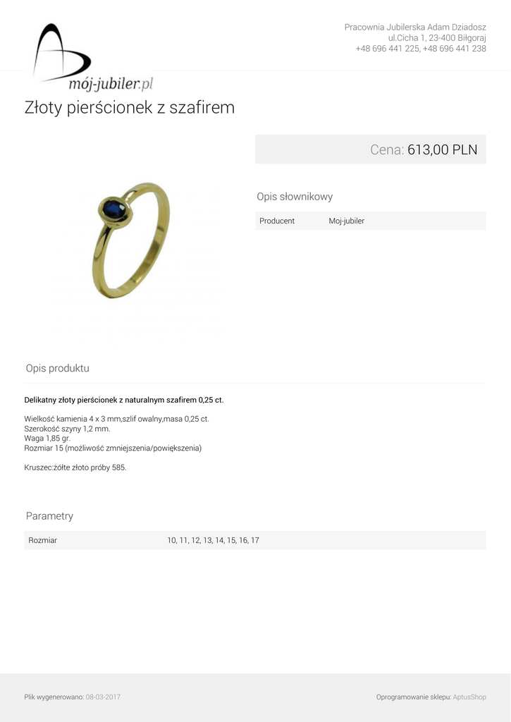 Pracownia Jubilerska Adam Dziadosz ul.Cicha 1, 23-400 Biłgoraj +48 696 441 225, +48 696 441 238 Złoty pierścionek z szafirem Cena: 613,00 PLN Opis słownikowy Producent Moj-jubiler Opis produktu Delikatny złoty pierścionek z naturalnym szafirem 0,25 ct. Wielkość kamienia 4 x 3 mm,szlif owalny,masa 0,25 ct. Szerokość szyny 1,2 mm. Waga 1,85 gr. Rozmiar 15 (możliwość zmniejszenia/powiększenia) Kruszec:żółte złoto próby 585. Parametry Rozmiar Plik wygenerowano: 08-03-2017 10, 11, 12, 13, 14, 15, 16, 17 Oprogramowanie sklepu: AptusShop Pracownia Jubilerska Adam Dziadosz ul.Cicha 1, 23-400 Biłgoraj +48 696 441 225, +48 696 441 238 Galeria Plik wygenerowano: 08-03-2017 Powered by TCPDF (www.tcpdf.org) Oprogramowanie sklepu: AptusShop