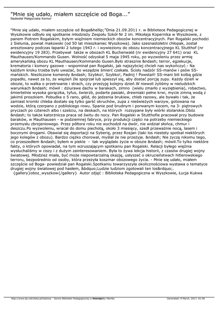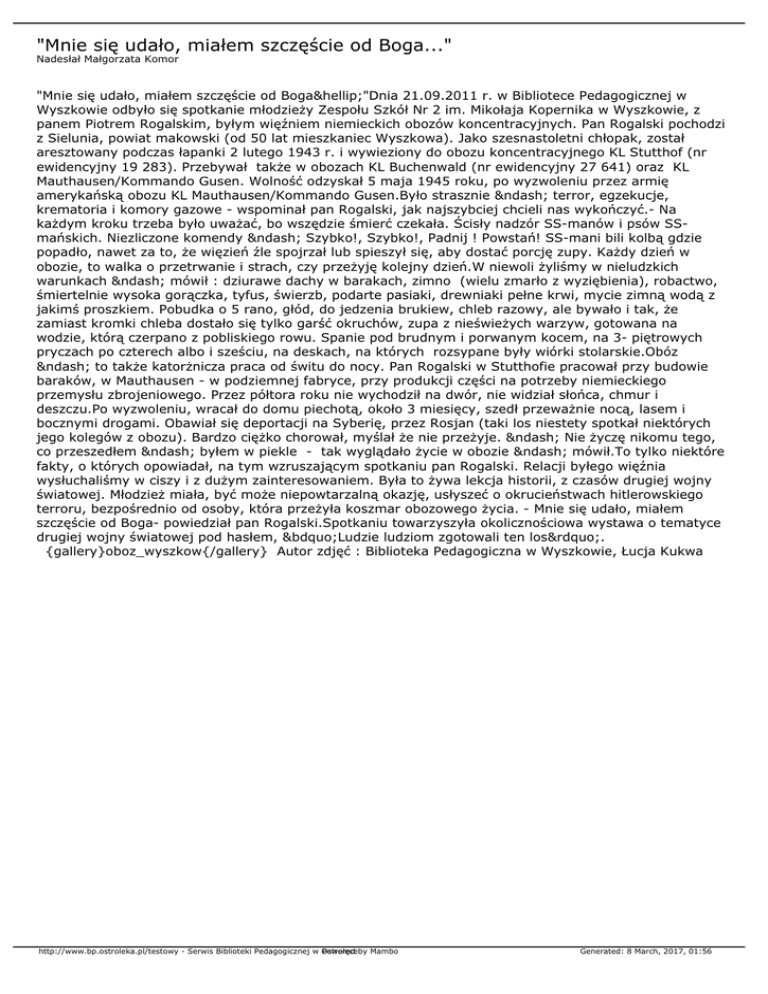 panem Piotrem Rogalskim, byłym więźniem niemieckich obozów koncentracyjnych. Pan Rogalski pochodzi