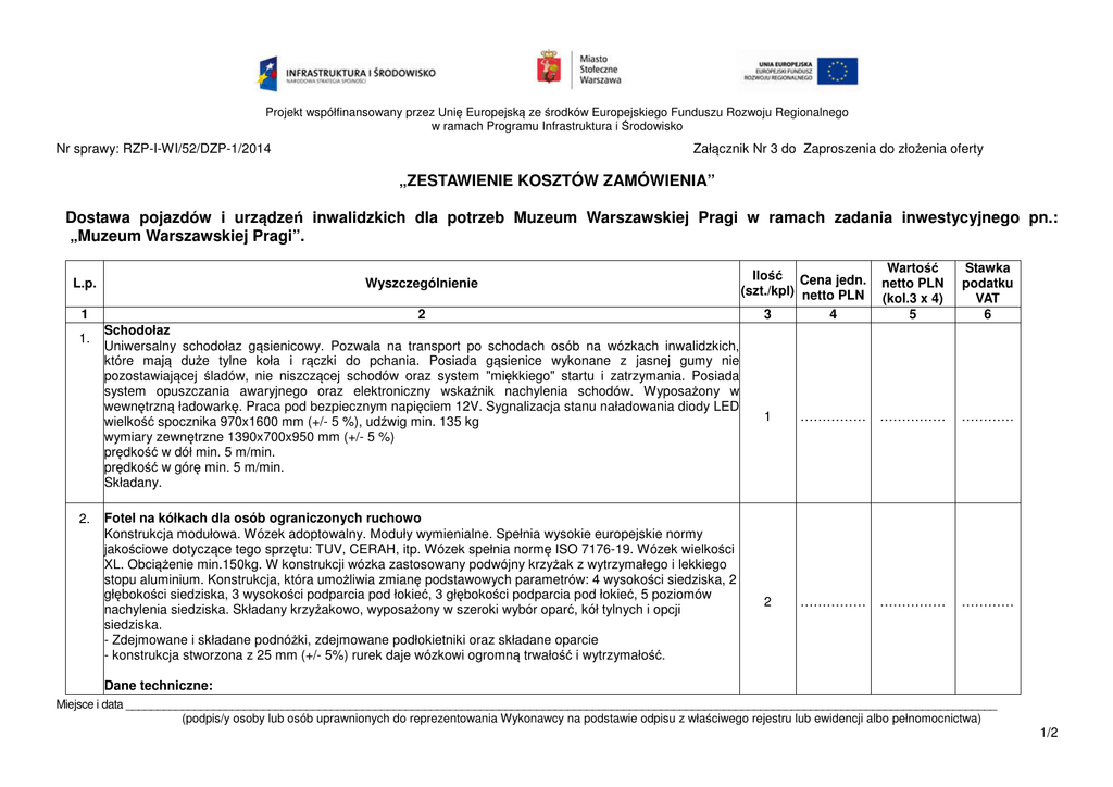 Projekt współfinansowany przez Unię Europejską ze środków Europejskiego Funduszu Rozwoju Regionalnego w ramach Programu Infrastruktura i Środowisko Nr sprawy: RZP-I-WI/52/DZP-1/2014 Załącznik Nr 3 do Zaproszenia do złożenia oferty „ZESTAWIENIE KOSZTÓW ZAMÓWIENIA” Dostawa pojazdów i urządzeń inwalidzkich dla potrzeb Muzeum Warszawskiej Pragi w ramach zadania inwestycyjnego pn.: „Muzeum Warszawskiej Pragi”. L.p. Wyszczególnienie 1 2 Schodołaz Uniwersalny schodołaz gąsienicowy. Pozwala na transport po schodach osób na wózkach inwalidzkich, które mają duże tylne koła i rączki do pchania. Posiada gąsienice wykonane z jasnej gumy nie pozostawiającej śladów, nie niszczącej schodów oraz system "miękkiego" startu i zatrzymania. Posiada system opuszczania awaryjnego oraz elektroniczny wskaźnik nachylenia schodów. Wyposażony w wewnętrzną ładowarkę. Praca pod bezpiecznym napięciem 12V. Sygnalizacja stanu naładowania diody LED wielkość spocznika 970x1600 mm (+/- 5 %), udźwig min. 135 kg wymiary zewnętrzne 1390x700x950 mm (+/- 5 %) prędkość w dół min. 5 m/min. prędkość w górę min. 5 m/min. Składany. 1. 2. Fotel na kółkach dla osób ograniczonych ruchowo Konstrukcja modułowa. Wózek adoptowalny. Moduły wymienialne. Spełnia wysokie europejskie normy jakościowe dotyczące tego sprzętu: TUV, CERAH, itp. Wózek spełnia normę ISO 7176-19. Wózek wielkości XL. Obciążenie min.150kg. W konstrukcji wózka zastosowany podwójny krzyżak z wytrzymałego i lekkiego stopu aluminium. Konstrukcja, która umożliwia zmianę podstawowych parametrów: 4 wysokości siedziska, 2 głębokości siedziska, 3 wysokości podparcia pod łokieć, 3 głębokości podparcia pod łokieć, 5 poziomów nachylenia siedziska. Składany krzyżakowo, wyposażony w szeroki wybór oparć, kół tylnych i opcji siedziska. - Zdejmowane i składane podnóżki, zdejmowane podłokietniki oraz składane oparcie - konstrukcja stworzona z 25 mm (+/- 5%) rurek daje wózkowi ogromną trwałość i wytrzymałość. Ilość Cena jedn. (szt./kpl) netto PLN 3 4 Wartość netto PLN (kol.3 x 4) 5 Stawka podatku VAT 6 1 …………… …………… ………… 2 …………… …………… ………… Dane techniczne: Miejsce i data ____________________________________________________________________________________________________________________________________________ (podpis/y osoby lub osób uprawnionych do reprezentowania Wykonawcy na podstawie odpisu z właściwego rejestru lub ewidencji albo pełnomocnictwa) 1/2 Nr sprawy: RZP-I-WI/52/DZP-1/2014 Załącznik Nr 3 do Zaproszenia do złożenia oferty - Wózek ze sztywnym oparciem - Nylonowa tapicerka - Zdejmowane i uchylne podłokietniki - Standardowy podnóżek, zdejmowany i składany - Regulacja środka ciężkości - Regulowana wysokość siedziska - Dostępna szerokość siedziska 50cm (+/- 5%) - Głębokość siedziska 42cm (+/- 5%) - Wysokość siedziska 50,5cm (+/- 5%) - Wysokość oparcia 42cm (+/- 5%) - Wysokość całkowita 94cm (+/- 5%) - Dł. całkowita 103cm (76,50cm bez podnóżków) (+/- 5%) - Szerokość po złożeniu 31 cm (+/- 5%) - Waga wózka 16,5 kg (+/- 5%) - Przednie koła 8'' pełne - Tylne koła 24'' pneumatyczne Razem netto Kwota podatku VAT Razem brutto Miejsce i data ____________________________________________________________________________________________________________________________________________ (podpis/y osoby lub osób uprawnionych do reprezentowania Wykonawcy na podstawie odpisu z właściwego rejestru lub ewidencji albo pełnomocnictwa) 2/2