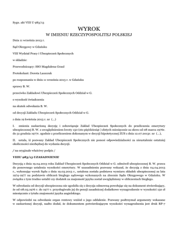 Sygn. akt VIII U 983/13 WYROK W IMIENIU RZECZYPOSPOLITEJ POLSKIEJ Dnia 11 września 2013 r. Sąd Okręgowy w Gdańsku VIII Wydział Pracy i Ubezpieczeń Społecznych w składzie: Przewodniczący: SSO Magdalena Graul Protokolant: Dorota Laszczuk po rozpoznaniu w dniu 11 września 2013 r. w Gdańsku sprawy B. W. przeciwko Zakładowi Ubezpieczeń Społecznych Oddział w G. o wysokość świadczenia na skutek odwołania B. W. od decyzji Zakładu Ubezpieczeń Społecznych Oddział w G. z dnia 19 kwietnia 2013 r. nr (...) I. zmienia zaskarżoną decyzję i zobowiązuje Zakład Ubezpieczeń Społecznych do przeliczenia emerytury ubezpieczonej B. W. z uwzględnieniem kwoty 150 (sto pięćdziesiąt ) złotych miesięcznie za okres od 08 marca 1976r. do 31 grudnia 1977r. zgodnie z przeliczeniem dokonanym w decyzji hipotetycznej ZUS z dnia 12.07.2013r. nr (...), II. ustala, iż pozwany Zakład Ubezpieczeń Społecznych nie ponosi odpowiedzialności za nieustalenie ostatniej okoliczności niezbędnej do wydania decyzji. / na oryginale właściwy podpis / VIIIU 983/13 UZASADNIENIE Decyzją z dnia 19.04.2013 roku Zakład Ubezpieczeń Społecznych Oddział w G. odmówił ubezpieczonej B. W. prawa do ponownego ustalenia wysokości emerytury. W uzasadnieniu pozwany wskazał, że decyzją z dnia 04.04.2013 r., wykonując wyrok Sądu z dnia 19.03.2013 r., ustalona została podstawa wymiaru składek ubezpieczonej za lata 1974-1977 na podstawie obliczeń biegłego sądowego wykonanych na zlecenie Sądu Okręgowego w Gdańsku. W związku z tym trudno ustalić czy dodatek za znajomość języka został uwzględniony w obliczeniach biegłego. W odwołaniu od decyzji ubezpieczona nie zgodziła się z decyzja odmowną powołując się na dokument stwierdzający, że od 08.03.1976 r. do 1977 r. przysługiwało jej do pensji zasadniczej dodatkowe wynagrodzenie w wysokości 150 zł miesięcznie z tytułu znajomości języka angielskiego. W odpowiedzi na odwołanie organ rentowy wniósł o jego oddalenie. Pozwany podtrzymał argumenty wskazane w zaskarżonej decyzji, nadto dodał, że dokumentem potwierdzającym wysokości wynagrodzenia jest druk RP-7 lub legitymacja ubezpieczeniowa, ewentualnie uwierzytelniona dokumentacja płacowa pracodawcy, których to ubezpieczona nie przedłożyła. Sąd ustalił i zważył, co następuje: B. W. ma ustalone prawo do emerytury od 04 kwietnia 2005 r. Do ustalenia podstawy wymiaru emerytury przyjęto przeciętną podstawę wymiaru składek na ubezpieczenie społeczne z 20 lat kalendarzowych wybranych z całego okresu ubezpieczenia. Wskaźnik wysokości podstawy wymiaru wyniósł 120,02%. /okoliczności bezsporne/ B. W. w okresie od 08 stycznia 1973 roku do 21 września 1995 roku zatrudniona była w (...) L. O. w pełnym wymiarze czasu pracy na stanowiskach pomocnik stewarda, młodszy steward, steward, starszy steward, ochmistrz. /dowody: świadectwo pracy k. 7 akt ubezpieczeniowych/ Kwestia przeliczenia podstawy wymiaru za lata 1974-1977 była przedmiotem postępowania przed Sądem Okręgowym w Gdańsku VIII Wydziałem Pracy i Ubezpieczeń Społecznych w sprawie o sygn. akt VIII U 655/12. Podstawa wymiaru świadczenia wnioskodawczyni została wówczas ustalona na podstawie obliczeń dokonanych przez biegłą sądową. Jak wynika z w/w opinii wyliczenie dokonane przez biegłą sądową zostało sporządzone w oparciu o Umowę Zbiorową w (...) z 01.11.1948r., Układ Zbiorowy Pracy z dnia 08.08.1966r. i z 01.01.1975r. oraz Protokół Dodatkowy Nr 15 z 15.06.1973r. W oparciu o powyższe akty prawne wyliczono stałe składniki przysługujące do wynagrodzenia zasadniczego, które były wypłacone i podlegały składkom na ubezpieczenie społeczne, a tym samym stanowiły podstawę do naliczenia świadczenia emerytalnego. Były to : dodatek eksploatacyjny /okrętowy , dodatek funkcyjny, dodatek specjalistyczny oraz wynagrodzenie za urlop i wolne dni. Dodatek dewizowy, chociaż nie stanowił składnika osobowego funduszu płac i był wolny od składki na ubezpieczenia społeczne, to od 1972 r. jego wartość stanowiła podstawę wymiaru świadczenia emerytalnego. Wartość dodatku dewizowego wliczanego do podstawy jaru emerytury i renty ustalało się w złotych polskich wg kursu podstawowego i specjalnego dolara . Dzienny dodatek dewizowy ustalony w dolarach USA w zależności od stanowiska i strefy pływania określają załącznik do uchwały nr 60 Rady Ministrów z 1972, załącznik nr 14 do UZP z 1975 r., Protokół Dodatkowy nr 2 z 21 października 1975 r. do UZP z 1975 r. Co do dodatku za wysługę lat ubezpieczona nabyła prawo do tego dodatku w wysokości 5% płacy zasadniczej od 08.01.1978 r. Z uwagi na brak danych o ilości nadgodzin , nie było możliwym wyliczenie wynagrodzenia z tego tytułu. Wynagrodzenie ubezpieczonej stanowiące podstawę świadczenia emerytalnego wyniosło: w 1973 r. – 21.121 zł, w 1974 r. 22.425 zł, w 1975 r. 38.273 zł, w 1976r. 81 928zł, w 1977r. 109713zł. Sąd Okręgowy wyrokiem z dnia 06.02.2013 r. zobowiązał pozwanego do przeliczenia świadczenia wnioskodawczyni, co też zostało wykonane decyzją z dnia 04.04.2013r.. Wskaźnik wysokości podstawy wymiaru wyniósł 146,65%. /Dowód: opinia biegłej i prawomocny wyrok w aktach sprawy VIII U 655/12 SO w Gdańsku- k. 26-27, 29-33, decyzja z dnia 04.04.2013 r. –k.78 akt ubezp./ W dniu 12.04.2013 r. ubezpieczona wniosła o ponowne przeliczenie świadczenia emerytalnego poprzez uwzględnienie dodatku za znajomość języka angielskiego. Do wynagrodzenia zasadniczego za lata 1976-1977 . Zaskarżoną decyzją pozwany odmówił ubezpieczonej B. W. prawa do ponownego ustalenia wysokości emerytury. /dowód: wniosek-k. 82 akt ubezp., decyzja odmowna –k. 85 akt ubezpieczeniowych / Ubezpieczona w okresie od 08 marca 1976r. – 31 grudnia 1977r. otrzymywała kwotę 150 zł miesięcznie z tytułu dodatkowego wynagrodzenia za znajomość j. angielskiego, która stanowiła podstawę wymiaru składek na