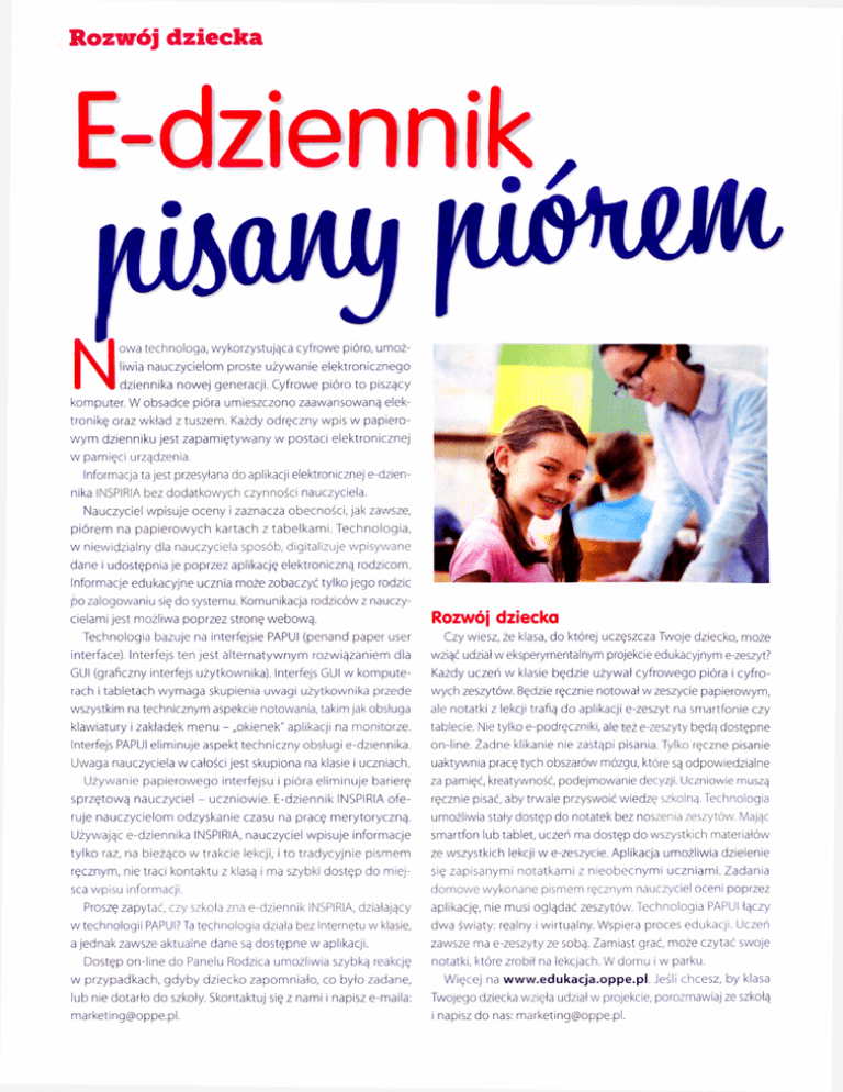 R ozw ój d zie c k a E-dziennik, joAoiUjfimm owa technologa, wykorzystująca cyfrowe pióro, umożumoż N ■■ liwia nauczycielom proste używanie elektronicznego dziennika nowej generacji. Cyfrowe pióro to piszący komputer. W obsadce pióra umieszczono zaawansowaną elek tronikę oraz wkład z tuszem. Każdy odręczny wpis w papiero wym dzienniku jest zapamiętywany w postaci elektronicznej w pamięci urządzenia. Informacja ta jest przesyłana do aplikacji elektronicznej e-dziennika INSPIRIA bez dodatkowych czynności nauczyciela. Nauczyciel wpisuje oceny i zaznacza obecności, jak zawsze, piórem na papierowych kartach z tabelkami. Technologia, w niewidzialny dla nauczyciela sposób, digitalizuje wpisywane dane i udostępnia je poprzez aplikację elektroniczną rodzicom. Informacje edukacyjne ucznia może zobaczyć tylko jego rodzic po zalogowaniu się do systemu. Komunikacja rodziców z nauczy cielami jest możliwa poprzez stronę webową. Rozwój dziecka Technologia bazuje na interfejsie PAPUI (penand paper user Czy wiesz, że klasa, do której uczęszcza Twoje dziecko, może interface). Interfejs ten jest alternatywnym rozwiązaniem dla wziąć udział w eksperymentalnym projekcie edukacyjnym e-zeszyt? GUI (graficzny interfejs użytkownika). Interfejs GUI w kompute Każdy uczeń w klasie będzie używał cyfrowego pióra i cyfro rach i tabletach wymaga skupienia uwagi użytkownika przede wych zeszytów. Będzie ręcznie notował w zeszycie papierowym, wszystkim na technicznym aspekcie notowania, takim jak obsługa ale notatki z lekcji trafią do aplikacji e-zeszyt na smartfonie czy klawiatury i zakładek menu - „okienek" aplikacji na monitorze. tablecie. Nie tylko e-podręczniki, ale też e-zeszyty będą dostępne Interfejs PAPUI eliminuje aspekt techniczny obsługi e-dziennika. on-line. Żadne klikanie nie zastąpi pisania. Tylko ręczne pisanie Uwaga nauczyciela w całości jest skupiona na klasie i uczniach. uaktywnia pracę tych obszarów mózgu, które są odpowiedzialne Używanie papierowego interfejsu i pióra eliminuje barierę za pamięć, kreatywność, podejmowanie decyzji. Uczniowie muszą sprzętową nauczyciel - uczniowie. E-dziennik INSPIRIA ofe ręcznie pisać, aby trwale przyswoić wiedzę szkolną. Technologia ruje nauczycielom odzyskanie czasu na pracę merytoryczną. umożliwia stały dostęp do notatek bez noszenia zeszytów. Mając Używając e-dziennika INSPIRIA, nauczyciel wpisuje informacje smartfon lub tablet, uczeń ma dostęp do wszystkich materiałów tylko raz, na bieżąco w trakcie lekcji, i to tradycyjnie pismem ze wszystkich lekcji w e-zeszycie. Aplikacja umożliwia dzielenie ręcznym, nie traci kontaktu z klasą i ma szybki dostęp do miej się zapisanymi notatkami z nieobecnymi uczniami. Zadania sca wpisu informacji. domowe wykonane pismem ręcznym nauczyciel oceni poprzez Proszę zapytać, czy szkoła zna e-dziennik INSPIRIA, działający aplikację, nie musi oglądać zeszytów. Technologia PAPUI łączy w technologii PAPUI? Ta technologia działa bez Internetu w klasie, dwa światy: realny i wirtualny. Wspiera proces edukacji. Uczeń a jednak zawsze aktualne dane są dostępne w aplikacji. zawsze ma e-zeszyty ze sobą. Zamiast grać, może czytać swoje Dostęp on-line do Panelu Rodzica umożliwia szybką reakcję notatki, które zrobił na lekcjach. W domu i w parku. w przypadkach, gdyby dziecko zapomniało, co było zadane, Więcej na ww w.edukacja.oppe.pl Jeśli chcesz, by klasa lub nie dotarło do szkoły. Skontaktuj się z nami i napisz e-maila: Twojego dziecka wzięła udział w projekcie, porozmawiaj ze szkołą [email protected]. i napisz do nas: [email protected].