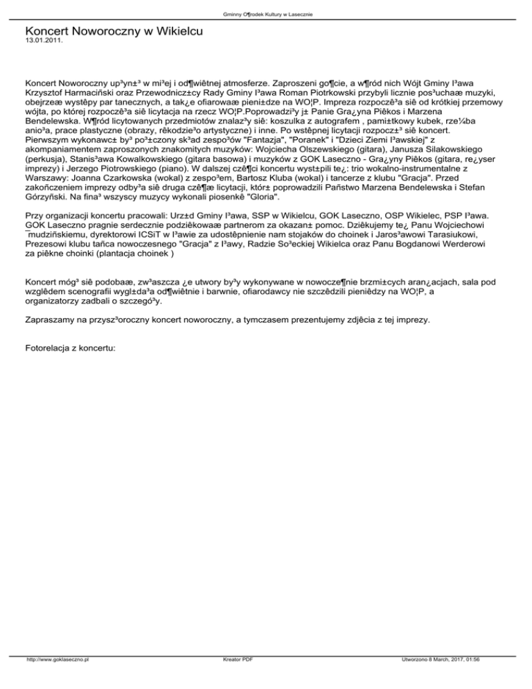 Gminny O¶rodek Kultury w Lasecznie Koncert Noworoczny w Wikielcu 13.01.2011. Koncert Noworoczny up³yn±³ w mi³ej i od¶wiêtnej atmosferze. Zaproszeni go¶cie, a w¶ród nich Wójt Gminy I³awa Krzysztof Harmaciñski oraz Przewodnicz±cy Rady Gminy I³awa Roman Piotrkowski przybyli licznie pos³uchaæ muzyki, obejrzeæ wystêpy par tanecznych, a tak¿e ofiarowaæ pieni±dze na WO¦P. Impreza rozpoczê³a siê od krótkiej przemowy wójta, po której rozpoczê³a siê licytacja na rzecz WO¦P.Poprowadzi³y j± Panie Gra¿yna Piêkos i Marzena Bendelewska. W¶ród licytowanych przedmiotów znalaz³y siê: koszulka z autografem , pami±tkowy kubek, rze¼ba anio³a, prace plastyczne (obrazy, rêkodzie³o artystyczne) i inne. Po wstêpnej licytacji rozpocz±³ siê koncert. Pierwszym wykonawc± by³ po³±czony sk³ad zespo³ów "Fantazja", "Poranek" i "Dzieci Ziemi I³awskiej" z akompaniamentem zaproszonych znakomitych muzyków: Wojciecha Olszewskiego (gitara), Janusza Silakowskiego (perkusja), Stanis³awa Kowalkowskiego (gitara basowa) i muzyków z GOK Laseczno - Gra¿yny Piêkos (gitara, re¿yser imprezy) i Jerzego Piotrowskiego (piano). W dalszej czê¶ci koncertu wyst±pili te¿: trio wokalno-instrumentalne z Warszawy: Joanna Czarkowska (wokal) z zespo³em, Bartosz Kluba (wokal) i tancerze z klubu "Gracja". Przed zakoñczeniem imprezy odby³a siê druga czê¶æ licytacji, któr± poprowadzili Pañstwo Marzena Bendelewska i Stefan Górzyñski. Na fina³ wszyscy muzycy wykonali piosenkê "Gloria". Przy organizacji koncertu pracowali: Urz±d Gminy I³awa, SSP w Wikielcu, GOK Laseczno, OSP Wikielec, PSP I³awa. GOK Laseczno pragnie serdecznie podziêkowaæ partnerom za okazan± pomoc. Dziêkujemy te¿ Panu Wojciechowi ¯mudziñskiemu, dyrektorowi ICSiT w I³awie za udostêpnienie nam stojaków do choinek i Jaros³awowi Tarasiukowi, Prezesowi klubu tañca nowoczesnego "Gracja" z I³awy, Radzie So³eckiej Wikielca oraz Panu Bogdanowi Werderowi za piêkne choinki (plantacja choinek ) Koncert móg³ siê podobaæ, zw³aszcza ¿e utwory by³y wykonywane w nowocze¶nie brzmi±cych aran¿acjach, sala pod wzglêdem scenografii wygl±da³a od¶wiêtnie i barwnie, ofiarodawcy nie szczêdzili pieniêdzy na WO¦P, a organizatorzy zadbali o szczegó³y. Zapraszamy na przysz³oroczny koncert noworoczny, a tymczasem prezentujemy zdjêcia z tej imprezy. Fotorelacja z koncertu: http://www.goklaseczno.pl Kreator PDF Utworzono 8 March, 2017, 01:56