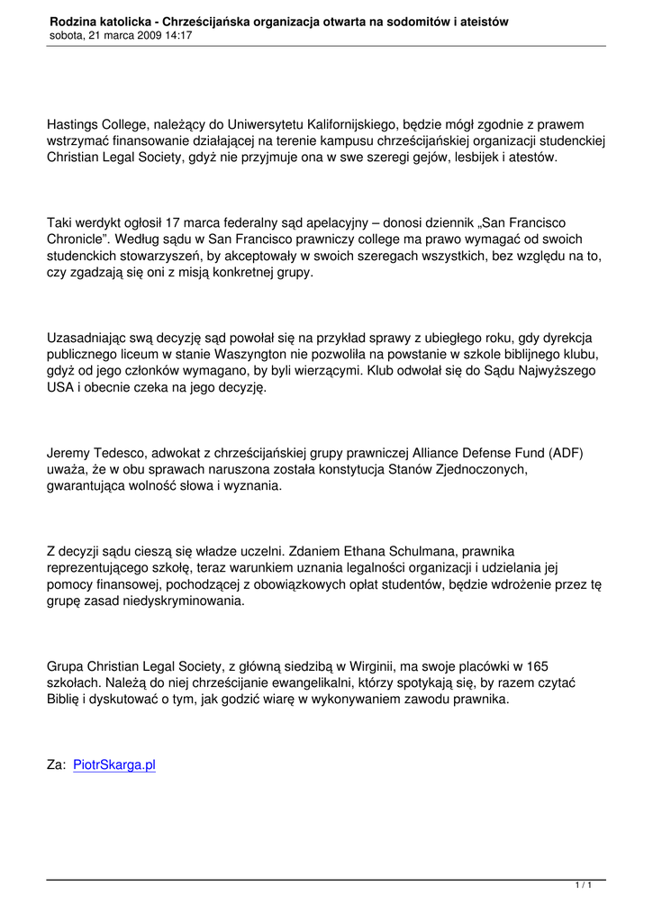 Rodzina katolicka - Chrześcijańska organizacja otwarta na sodomitów i ateistów sobota, 21 marca 2009 14:17 Hastings College, należący do Uniwersytetu Kalifornijskiego, będzie mógł zgodnie z prawem wstrzymać finansowanie działającej na terenie kampusu chrześcijańskiej organizacji studenckiej Christian Legal Society, gdyż nie przyjmuje ona w swe szeregi gejów, lesbijek i atestów. Taki werdykt ogłosił 17 marca federalny sąd apelacyjny – donosi dziennik „San Francisco Chronicle”. Według sądu w San Francisco prawniczy college ma prawo wymagać od swoich studenckich stowarzyszeń, by akceptowały w swoich szeregach wszystkich, bez względu na to, czy zgadzają się oni z misją konkretnej grupy. Uzasadniając swą decyzję sąd powołał się na przykład sprawy z ubiegłego roku, gdy dyrekcja publicznego liceum w stanie Waszyngton nie pozwoliła na powstanie w szkole biblijnego klubu, gdyż od jego członków wymagano, by byli wierzącymi. Klub odwołał się do Sądu Najwyższego USA i obecnie czeka na jego decyzję. Jeremy Tedesco, adwokat z chrześcijańskiej grupy prawniczej Alliance Defense Fund (ADF) uważa, że w obu sprawach naruszona została konstytucja Stanów Zjednoczonych, gwarantująca wolność słowa i wyznania. Z decyzji sądu cieszą się władze uczelni. Zdaniem Ethana Schulmana, prawnika reprezentującego szkołę, teraz warunkiem uznania legalności organizacji i udzielania jej pomocy finansowej, pochodzącej z obowiązkowych opłat studentów, będzie wdrożenie przez tę grupę zasad niedyskryminowania. Grupa Christian Legal Society, z główną siedzibą w Wirginii, ma swoje placówki w 165 szkołach. Należą do niej chrześcijanie ewangelikalni, którzy spotykają się, by razem czytać Biblię i dyskutować o tym, jak godzić wiarę w wykonywaniem zawodu prawnika. Za: PiotrSkarga.pl 1/1