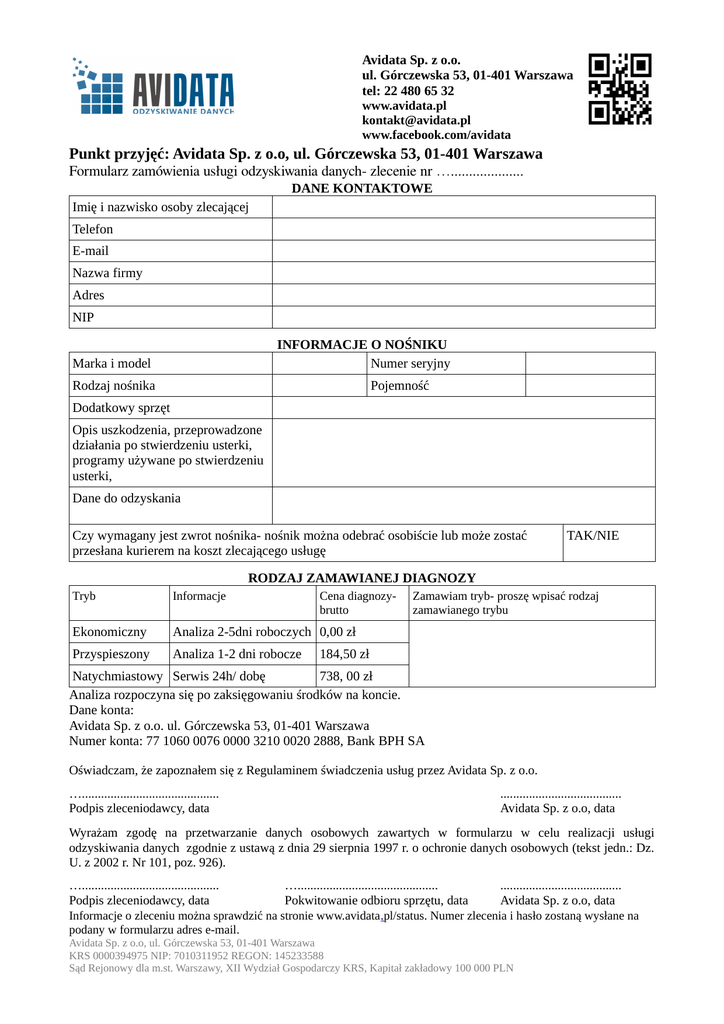 Avidata Sp. z o.o. ul. Górczewska 53, 01-401 Warszawa tel: 22 480 65 32 www.avidata.pl [email protected] www.facebook.com/avidata Punkt przyjęć: Avidata Sp. z o.o, ul. Górczewska 53, 01-401 Warszawa Formularz zamówienia usługi odzyskiwania danych- zlecenie nr ….................... DANE KONTAKTOWE Imię i nazwisko osoby zlecającej Telefon E-mail Nazwa firmy Adres NIP INFORMACJE O NOŚNIKU Numer seryjny Marka i model Rodzaj nośnika Pojemność Dodatkowy sprzęt Opis uszkodzenia, przeprowadzone działania po stwierdzeniu usterki, programy używane po stwierdzeniu usterki, Dane do odzyskania Czy wymagany jest zwrot nośnika- nośnik można odebrać osobiście lub może zostać przesłana kurierem na koszt zlecającego usługę TAK/NIE RODZAJ ZAMAWIANEJ DIAGNOZY Tryb Informacje Cena diagnozybrutto Ekonomiczny Analiza 2-5dni roboczych 0,00 zł Przyspieszony Analiza 1-2 dni robocze Zamawiam tryb- proszę wpisać rodzaj zamawianego trybu 184,50 zł Natychmiastowy Serwis 24h/ dobę 738, 00 zł Analiza rozpoczyna się po zaksięgowaniu środków na koncie. Dane konta: Avidata Sp. z o.o. ul. Górczewska 53, 01-401 Warszawa Numer konta: 77 1060 0076 0000 3210 0020 2888, Bank BPH SA Oświadczam, że zapoznałem się z Regulaminem świadczenia usług przez Avidata Sp. z o.o. …........................................... Podpis zleceniodawcy, data ...................................... Avidata Sp. z o.o, data Wyrażam zgodę na przetwarzanie danych osobowych zawartych w formularzu w celu realizacji usługi odzyskiwania danych zgodnie z ustawą z dnia 29 sierpnia 1997 r. o ochronie danych osobowych (tekst jedn.: Dz. U. z 2002 r. Nr 101, poz. 926). …........................................... …............................................ ...................................... Podpis zleceniodawcy, data Pokwitowanie odbioru sprzętu, data Avidata Sp. z o.o, data Informacje o zleceniu można sprawdzić na stronie www.avidata.pl/status. Numer zlecenia i hasło zostaną wysłane na podany w formularzu adres e-mail. Avidata Sp. z o.o, ul. Górczewska 53, 01-401 Warszawa KRS 0000394975 NIP: 7010311952 REGON: 145233588 Sąd Rejonowy dla m.st. Warszawy, XII Wydział Gospodarczy KRS, Kapitał zakładowy 100 000 PLN