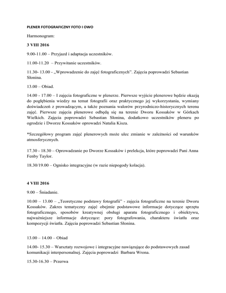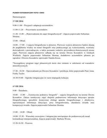 PLENER FOTOGRAFICZNY FOTO I OWO Harmonogram: 3 VIII 2016 9.00-11.00 – Przyjazd i adaptacja uczestników. 11.00-11.20 – Przywitanie uczestników. 11.30- 13.00 - „Wprowadzenie do zajęć fotograficznych”. Zajęcia poprowadzi Sebastian Słonina. 13.00 – Obiad. 14.00 - 17.00 – I zajęcia fotograficzne w plenerze. Pierwsze wyjście plenerowe będzie okazją do pogłębienia wiedzy na temat fotografii oraz praktycznego jej wykorzystania, wymiany doświadczeń z prowadzącym, a także poznania walorów przyrodniczo-historycznych terenu zajęć. Pierwsze zajęcia plenerowe odbędą się na terenie Dworu Kossaków w Górkach Wielkich. Zajęcia poprowadzi Sebastian Słonina, dodatkowo uczestników pleneru po ogrodzie i Dworze Kossaków oprowadzi Natalia Kisza. *Szczegółowy program zajęć plenerowych może ulec zmianie w zależności od warunków atmosferycznych. 17.30 - 18.30 – Oprowadzanie po Dworze Kossaków i prelekcja, które poprowadzi Pani Anna Fenby Taylor. 18.30/19.00 – Ognisko integracyjne (w razie niepogody kolacja). 4 VIII 2016 9.00 – Śniadanie. 10.00 – 13.00 – „Teoretyczne podstawy fotografii” - zajęcia fotograficzne na terenie Dworu Kossaków. Zakres tematyczny zajęć obejmie podstawowe informacje dotyczące sprzętu fotograficznego, sposobów kreatywnej obsługi aparatu fotograficznego i obiektywu, najważniejsze informacje dotyczące: pory fotografowania, charakteru światła oraz kompozycji światła. Zajęcia poprowadzi Sebastian Słonina. 13.00 – 14.00 – Obiad 14.00- 15.30 – Warsztaty rozwojowe i integracyjne nawiązujące do podstawowych zasad komunikacji interpersonalnej. Zajęcia poprowadzi Barbara Wrona. 15.30-16.30 – Przerwa 16.30 – 18.30 – Zajęcia fotograficzne połączone z wyjściem w teren do Stanicy Kamińskiego oraz na Wzgórze Bucze. W trakcie spaceru „Szlakiem Kamyka” uczestnicy będą prowadzeni przez historyka sztuki – Przemysława Czernka, przewodniczkę Natalię Kiszę oraz fotografa – Sebastiana Słoninę. Przy Muzeum Zofii Kossak-Szatkowskiej i Centrum Kultury i Sztuki „Dwór Kossaków” rozpoczyna się wyznaczony w 2014 roku „Szlak KAMYKA” umożliwiający turystom odwiedzenie w czasie jednego spaceru trzech obiektów o dużych walorach przyrodniczych. Są to: zabytkowy Park Kossaków, park otaczający dawną stanicę harcerską, której kierownikiem w latach przedwojennych był druh „Kamyk” – Aleksander Kamiński, autor „Kamieni na Szaniec” oraz zespół przyrodniczo-krajobrazowy „Góra Bucze”. „Szlak KAMYKA” przebiega przez teren ścisłej ochrony wód ujęcia Wodociągów Ziemi Cieszyńskiej w Pogórzu. *Szczegółowy program zajęć plenerowych może ulec zmianie w zależności od warunków atmosferycznych. 19. 00 – Kolacja. 20.00 – Projekcja filmu. Po filmie dyskusja na temat filmu dla osób zainteresowanych. 5 VIII 2016 9.00 – Śniadanie. 10.00 – 13.30 – Warsztaty fotograficzne. Tematyka warsztatów dotyczyć będzie: edycji zdjęć oraz przygotowania fotografii do różnych form prezentacji. Uczestnicy zajęć zapoznają sie z podstawowym zakresem obróbki cyfrowej plików graficznych (zdjęć) w oparciu o programy na licencji freeware, oraz program graficzny Photoshop. Pod koniec zajęć zaplanowano „Slajd show” wykonanych w trakcie pleneru zdjęć. 14.00 – Pożegnanie uczestników i wyjazd.