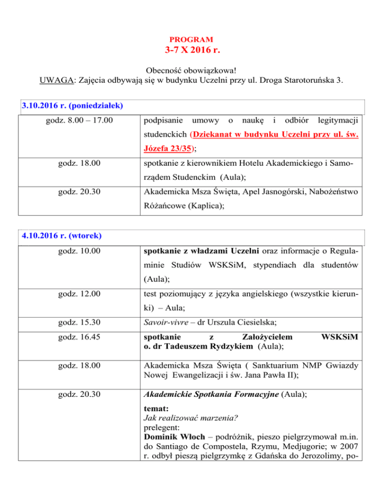 PROGRAM 3-7 X 2016 r. Obecność obowiązkowa! UWAGA: Zajęcia odbywają się w budynku Uczelni przy ul. Droga Starotoruńska 3. 3.10.2016 r. (poniedziałek) godz. 8.00 – 17.00 podpisanie umowy o naukę i odbiór legitymacji studenckich (Dziekanat w budynku Uczelni przy ul. św. Józefa 23/35); godz. 18.00 spotkanie z kierownikiem Hotelu Akademickiego i Samorządem Studenckim (Aula); godz. 20.30 Akademicka Msza Święta, Apel Jasnogórski, Nabożeństwo Różańcowe (Kaplica); 4.10.2016 r. (wtorek) godz. 10.00 spotkanie z władzami Uczelni oraz informacje o Regulaminie Studiów WSKSiM, stypendiach dla studentów (Aula); godz. 12.00 test poziomujący z języka angielskiego (wszystkie kierunki) – Aula; godz. 15.30 Savoir-vivre – dr Urszula Ciesielska; godz. 16.45 spotkanie z Założycielem o. dr Tadeuszem Rydzykiem (Aula); godz. 18.00 Akademicka Msza Święta ( Sanktuarium NMP Gwiazdy Nowej Ewangelizacji i św. Jana Pawła II); godz. 20.30 Akademickie Spotkania Formacyjne (Aula); WSKSiM temat: Jak realizować marzenia? prelegent: Dominik Włoch – podróżnik, pieszo pielgrzymował m.in. do Santiago de Compostela, Rzymu, Medjugorie; w 2007 r. odbył pieszą pielgrzymkę z Gdańska do Jerozolimy, po- konując 4500 km w 125 dni; pracował w misji salezjańskiej na Madagaskarze. 4.10.2016 r. (środa) godz. 9.00-10.30 egzamin z języka polskiego dla studentów obcokrajowców (poziomujący do grup zaawansowania); godz. 10.30 prezentacja sekcji Samorządu Studenckiego oraz działalności Akademickiego Związku Sportowego (Aula); godz. 11.00 prezentacja kół zainteresowań działających w WSKSiM i studenckiego Radia SIM (Aula); godz. 11.30 Teatr Studencki „Dobry Wieczór” – spotkanie z aktorami (Aula); godz. 12.00 godz. 14.00-18.00 spotkanie z opiekunem roku (Aula); szkolenie biblioteczne ( Biblioteka ; według podziału na grupy); zapoznanie z programem Fronter ( s. 127; według podziału na grupy); godz. 19.00 Akademickie Spotkania Formacyjne (Aula); temat: Językowe obrazy świata. wykładowca: prof. dr hab. Viara Maldijeva – Profesor w Katedrze Bałkanistyki Uniwersytetu Mikołaja Kopernika w Toruniu, ekspert Komisji Budowy Gramatycznej Języków Słowiańskich przy Międzynarodowym Komitecie Slawistów, członek Komisji Języka Religijnego przy Międzynarodowym Komitecie Slawistów. godz. 20.30 Akademicka Msza Święta, Apel Jasnogórski, Nabożeństwo Różańcowe (Kaplica); 6.10.2016 r. (czwartek) godz. 8.00 wyjazd na Pielgrzymkę WSKSiM do Sanktuarium św. Józefa w Kaliszu (powrót ok. godz. 24.00), szczegółowy plan na plakacie; 7.10.2016 r. (piątek) godz. 9.00 emisja głosu (według osobnego harmonogramu; s. 11, s. 12; godz. 16.00 godz. 19.00 szkolenie BHP (Aula); Akademickie Spotkania Formacyjne (Aula); temat: Jak mądrze rozpocząć studia? prelegent: mgr Anna Wiśniewska – psycholog; godz. 20.30 Akademicka Msza Święta, Apel Jasnogórski, Nabożeństwo Różańcowe (Kaplica);