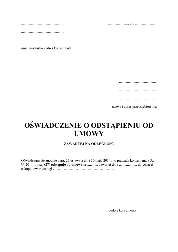 ................................................ ......................, dn. ...................... ................................................ ................................................ imię, nazwisko i adres konsumenta .......................................... .......................................... .......................................... .......................................... nazwa i adres przedsiębiorstwa OŚWIADCZENIE O ODSTĄPIENIU OD UMOWY ZAWARTEJ NA ODLEGŁOŚĆ Oświadczam, że zgodnie z art. 27 ustawy z dnia 30 maja 2014 r. o prawach konsumenta (Dz. U. 2014 r. poz. 827) odstępuję od umowy nr ............ zawartej dnia .................... dotyczącej zakupu towaru/usługi …………………………………………… .............................. podpis konsumenta