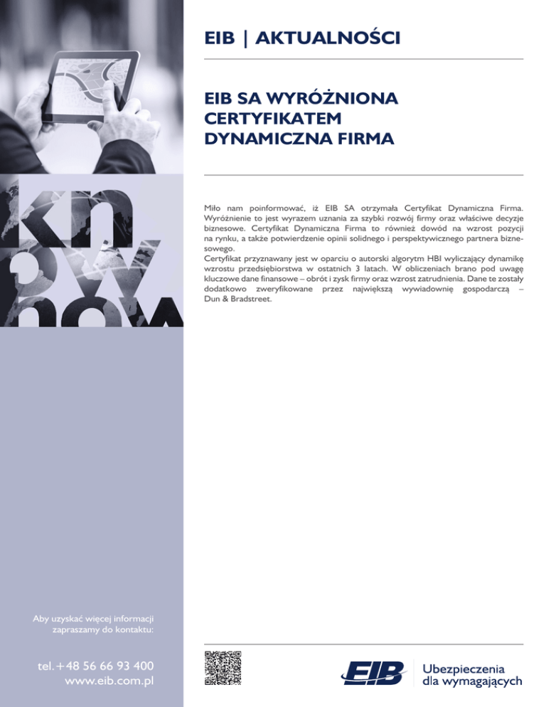 EIB | AKTUALNOŚCI EIB SA WYRÓŻNIONA CERTYFIKATEM DYNAMICZNA FIRMA Miło nam poinformować, iż EIB SA otrzymała Certyfikat Dynamiczna Firma. Wyróżnienie to jest wyrazem uznania za szybki rozwój firmy oraz właściwe decyzje biznesowe. Certyfikat Dynamiczna Firma to również dowód na wzrost pozycji na rynku, a także potwierdzenie opinii solidnego i perspektywicznego partnera biznesowego. Certyfikat przyznawany jest w oparciu o autorski algorytm HBI wyliczający dynamikę wzrostu przedsiębiorstwa w ostatnich 3 latach. W obliczeniach brano pod uwagę kluczowe dane finansowe – obrót i zysk firmy oraz wzrost zatrudnienia. Dane te zostały dodatkowo zweryfikowane przez największą wywiadownię gospodarczą – Dun & Bradstreet. Aby uzyskać więcej informacji zapraszamy do kontaktu: tel.+48 56 66 93 400 www.eib.com.pl