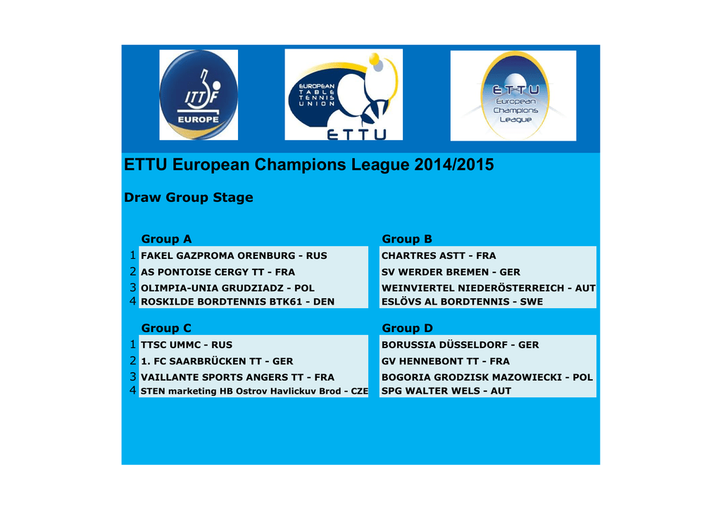 ETTU European Champions League 2014/2015 Draw Group Stage 1 2 3 4 Group A Group B FAKEL GAZPROMA ORENBURG - RUS CHARTRES ASTT - FRA AS PONTOISE CERGY TT - FRA SV WERDER BREMEN - GER OLIMPIA-UNIA GRUDZIADZ - POL ROSKILDE BORDTENNIS BTK61 - DEN WEINVIERTEL NIEDERÖSTERREICH - AUT ESLÖVS AL BORDTENNIS - SWE Group C Group D 1 TTSC UMMC - RUS 2 1. FC SAARBRÜCKEN TT - GER 3 VAILLANTE SPORTS ANGERS TT - FRA 4 STEN marketing HB Ostrov Havlickuv Brod - CZE BORUSSIA DÜSSELDORF - GER GV HENNEBONT TT - FRA BOGORIA GRODZISK MAZOWIECKI - POL SPG WALTER WELS - AUT