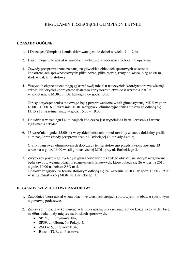 REGULAMIN I DZIECIĘCEJ OLIMPIADY LETNIEJ I. ZASADY OGÓLNE: 1. I Dziecięca Olimpiada Letnia skierowana jest do dzieci w wieku 7 – 12 lat. 2. Dzieci mogą brać udział w zawodach wyłącznie w obecności rodzica lub opiekuna. 3. Zawody przeprowadzone zostaną na gliwickich obiektach sportowych w sześciu konkurencjach sprawnościowych: piłka nożna, piłka ręczna, rzuty do kosza, bieg na 60 m., skok w dal, tenis stołowy. 4. Wszystkie chętne dzieci mogą zgłaszać swój udział u nauczyciela koordynatora we własnej szkole. Nauczyciel koordynator dostarcza karty uczestnictwa do 8 września 2010 r. w sekretariacie MDK, ul. Barlickiego 3 do godz. 13.00. Zapisy dotyczące tenisa stołowego będą przeprowadzone w sali gimnastycznej MDK w godz. 16.00 – 18.00 6 i 8 września 2010r. Rozgrywki eliminacyjne tenisa stołowego odbędą się 13,15 i 17 września tamże w godz. 15.00 – 19.00. 5. Do udziału w treningu i eliminacjach konieczna jest wypełniona karta uczestnika i ważna legitymacja szkolna. 6. 13 września o godz. 15.00 na wszystkich boiskach, przedstawiony zostanie dokładny grafik eliminacji oraz zasady przeprowadzenia I Dziecięcej Olimpiady Letniej. Grafik rozgrywek eliminacyjnych dotyczący tenisa stołowego przedstawiony zostanie 13 września o godz. 16.00 w sali gimnastycznej MDK przy ul. Barlickiego 3. 7. Zwycięzcy poszczególnych dyscyplin sportowych z każdego obiektu, na którym rozgrywane będą zawody, wezmą udział w rozgrywkach finałowych, które odbędą się 26 września 2010r. o godz. 10.00 na boisku ZSO nr 5. Finałowe rozgrywki w tenisie stołowym odbędą się 24 września 2010 r. w godz. 16.00 - 19.00 w sali gimnastycznej MDK, ul. Barlickiego 3. II. ZASADY SZCZEGÓŁOWE ZAWODÓW: 1. Zawodnicy biorą udział w zawodach we własnych strojach sportowych i w obuwiu sportowym o gumowej podeszwie. 2. Zapisy i eliminacje w konkurencjach: piłka nożna, piłka ręczna, rzut do kosza, skok w dal, bieg na 60m. będą miały miejsce na boiskach sportowych: SP 21, ul. Reymonta 18a, SP39, ul. Obrońców Pokoju 4, ZSO nr 5, ul. Sikornik 34, Boisko TUR, ul. Piaskowa, Boisko TUR, ul. Jasna, Zapisy i eliminacje w tenisie stołowym odbędą się na sali gimnastycznej MDK, ul. Barlickiego 3 3. Zawody zostaną przeprowadzone w następujących dyscyplinach sportowych i kategoriach wiekowych: piłka nożna 5 osobowa, drużyny mieszane 7-12 lat piłka ręczna 7 osobowa, drużyny mieszane 7-12 lat rzut do kosza, kat. wiekowe: chłopcy 7-8, 9-10, 11-12 lat i dziewczyny: 7-8, 9-10, 11-12 lat bieg na 60m, kat. wiekowe: chłopcy: 7-8, 9-10, 11-12 lat, dziewczyny: 7-8, 9-10, 11-12 lat skok w dal, kat. wiekowe: chłopcy: 7-8, 9-10, 11-12 lat, dziewczyny: 7-8, 9-10, 11-12 lat tenis stołowy, kat. wiekowe: 7-9, 10-12 lat, grupy mieszane. (Zawody w tenisie stołowym będą przeprowadzone tylko w MDK Gliwice) REGULAMIN ZAWODÓW W PIŁCE NOŻNEJ: 1. Drużyna składa się maksymalnie z 8 zawodników. W grze bierze udział 5 zawodników. 2. W czasie meczu dozwolona jest dowolna ilość zmian zawodników, zmiany lotne w strefie zmian. 3. Zawody odbywają się na boisku do piłki ręcznej. 4. W przypadku remisu o zwycięstwie decydują rzuty karne z odległości 6m. od środka bramki. Rzuty strzelane są naprzemiennie. 5. Aut wykonujemy nogą z miejsca wyznaczonego przez sędziego. 6. Czas trwania meczu to 2x10 min. 7. Wszystkie decyzje podejmuje sędzia prowadzący zawody. REGULAMIN ZAWODÓW W PIŁCE RĘCZNEJ: 1. Drużyna składa się maksymalnie z 8 zawodników, 7 bierze udział w grze + 1 osoba rezerwowa. 2. Zasady szczegółowe określa Polski Związek Piłki Ręcznej. 3. Czas trwania meczu 2x10 min. 4. Wszystkie decyzje podejmuje sędzia prowadzący zawody. RZUT DO KOSZA: 1. Zawody w rzucie do kosza odbywają się w 3 kategoriach wiekowych: 7-8, 9-10, 11-12 lat. 2. Rzut do kosza odbywa się z linii rzutów osobistych dla kat. wiekowych 9-10 i 11-12 lat, natomiast dla kat. wiekowej 7-8 lat odległość określa sędzia. SKOK W DAL: 1. Konkurencja odbywa się w 3 kat. wiekowych: 7-8, 9-10, 11-12 lat. Zawody przeprowadzane są osobno wśród chłopców i dziewcząt. BIEG NA 60 METRÓW: 1. Konkurencja odbywa się w 3 kat. wiekowych: 7-8, 9-10, 11-12 lat. Zawody przeprowadzane są osobno wśród chłopców i dziewcząt. TENIS STOŁOWY: 1. Konkurencja odbywa się w 2 kat. wiekowych: 7-9 i 10-12 lat. 2. O zasadach eliminacji do turnieju tenisa stołowego decyduje prowadzący. KONTAKT: Anna Zgraja 32 232 69 54; [email protected]