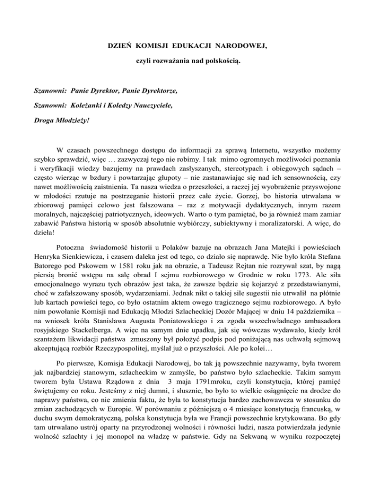DZIEŃ KOMISJI EDUKACJI NARODOWEJ, czyli rozważania nad polskością. Szanowni: Panie Dyrektor, Panie Dyrektorze, Szanowni: Koleżanki i Koledzy Nauczyciele, Droga Młodzieży! W czasach powszechnego dostępu do informacji za sprawą Internetu, wszystko możemy szybko sprawdzić, więc … zazwyczaj tego nie robimy. I tak mimo ogromnych możliwości poznania i weryfikacji wiedzy bazujemy na prawdach zasłyszanych, stereotypach i obiegowych sądach – często wierząc w bzdury i powtarzając głupoty – nie zastanawiając się nad ich sensownością, czy nawet możliwością zaistnienia. Ta nasza wiedza o przeszłości, a raczej jej wyobrażenie przyswojone w młodości rzutuje na postrzeganie historii przez całe życie. Gorzej, bo historia utrwalana w zbiorowej pamięci celowo jest fałszowana – raz z motywacji dydaktycznych, innym razem moralnych, najczęściej patriotycznych, ideowych. Warto o tym pamiętać, bo ja również mam zamiar zabawić Państwa historią w sposób absolutnie wybiórczy, subiektywny i moralizatorski. A więc, do dzieła! Potoczna świadomość historii u Polaków bazuje na obrazach Jana Matejki i powieściach Henryka Sienkiewicza, i czasem daleka jest od tego, co działo się naprawdę. Nie było króla Stefana Batorego pod Pskowem w 1581 roku jak na obrazie, a Tadeusz Rejtan nie rozrywał szat, by nagą piersią bronić wstępu na salę obrad I sejmu rozbiorowego w Grodnie w roku 1773. Ale siła emocjonalnego wyrazu tych obrazów jest taka, że zawsze będzie się kojarzyć z przedstawianymi, choć w zafałszowany sposób, wydarzeniami. Jednak nikt o takiej sile sugestii nie utrwalił na płótnie lub kartach powieści tego, co było ostatnim aktem owego tragicznego sejmu rozbiorowego. A było nim powołanie Komisji nad Edukacją Młodzi Szlacheckiej Dozór Mającej w dniu 14 października – na wniosek króla Stanisława Augusta Poniatowskiego i za zgoda wszechwładnego ambasadora rosyjskiego Stackelberga. A więc na samym dnie upadku, jak się wówczas wydawało, kiedy król szantażem likwidacji państwa zmuszony był położyć podpis pod poniżającą nas uchwałą sejmową akceptującą rozbiór Rzeczypospolitej, myślał już o przyszłości. Ale po kolei… Po pierwsze, Komisja Edukacji Narodowej, bo tak ją powszechnie nazywamy, była tworem jak najbardziej stanowym, szlacheckim w zamyśle, bo państwo było szlacheckie. Takim samym tworem była Ustawa Rządowa z dnia 3 maja 1791mroku, czyli konstytucja, której pamięć świętujemy co roku. Jesteśmy z niej dumni, i słusznie, bo było to wielkie osiągnięcie na drodze do naprawy państwa, co nie zmienia faktu, że była to konstytucja bardzo zachowawcza w stosunku do zmian zachodzących w Europie. W porównaniu z późniejszą o 4 miesiące konstytucją francuską, w duchu swym demokratyczną, polska konstytucja była we Francji powszechnie krytykowana. Bo gdy tam utrwalano ustrój oparty na przyrodzonej wolności i równości ludzi, nasza potwierdzała jedynie wolność szlachty i jej monopol na władzę w państwie. Gdy na Sekwaną w wyniku rozpoczętej rewolucji chłop stał się obywatelem, w Polsce ledwie przestawał być bydlęciem roboczym, które można było wciąż wychłostać, choć prawdopodobnie już nie zabić bezkarnie, bo wszak wzięła go Ustawa Rządowa pod opiekę prawa. I warto o tym pamiętać, aby nie popadać w samouwielbienie, znać faktyczną wartość rzeczy – jak pisał w XIX w. hrabia Aleksander Fredro: „znaj proporcje, Mocium Panie!” Faktyczną wagę i KEN, i Konstytucji 3 Maja wyznaczają nasze, krajowe standardy, ta smutna rzeczywistość upadku jaki był wówczas w Polsce i zdolność do jego przezwyciężenia. Po drugie, proszę, nie piejmy z zachwytu nad pierwszym w Europie ministerstwem oświaty [co, co roku, można usłyszeć i przeczytać w środkach masowego przekazu]. Państwo zajmowało się oświatą już w starożytnych Egipcie i Chinach, wychowanie było immanentną składową greckiej polis, bez której nie mogłaby funkcjonować i tylko obywało się to bez wyodrębnionej w tym celu instytucji. Powszechny obowiązek oświaty Prusy wprowadziły już w 1717 roku [jakże haniebnym dla polskiej niepodległości, którą właśnie straciliśmy, stając się protektoratem rosyjskim] a nie były to pierwsze próby w Europie i na świecie. Osobiście, czuję się zażenowany, kiedy my, Polacy poprawiamy sobie samopoczucie, licytując się, że w czymś byliśmy lub jesteśmy pierwsi. Jakie to ma znaczenie, kto pierwszy wymyślił koło, skoro wszyscy go używają? Ważniejsze jest, aby nie być w rozwoju ostatnim. [Gdybyśmy w odpowiednim czasie podjęli dzieło reformy państwa, do czego nawoływał w XVI wieku Andrzej Frycz Modrzewski w dziele „O naprawie Rzeczypospolitej”, a w XVII w „Kazaniach sejmowych” ks. Piotr Skarga, to byśmy go nie stracili]. To ciągłe podkreślanie, że w czymś nam się udało wyprzedzić innych, to jest leczenie narodowych kompleksów, z których nie potrafimy się wyzwolić. A już dawno powinniśmy, bo mamy znacznie więcej powodów do dumy, niż by się wydawało. Napoleon Bonaparte powiedział w kontekście sprawy polskiej, że „naród, który stracił własne państwo, nie jest godny, aby je posiadać.” Trudno się z nim nie zgodzić. Ale naród, który mimo że stracił państwowość, potrafił ją odbudować, może być z siebie dumny. A tej dumy, prawdziwej, nie tuszującej kompleksy, często Polakom brakuje. Dumy z bycia wolnym, nowoczesnym, otwartym, dobrze wykształconym społeczeństwem, świetnie radzącym sobie poza granicami kraju [fakt, często z konieczności a nie z wyboru, co nie zmienia tego, że całkiem nieźle odnajdujemy się w nowej rzeczywistości]. Powiecie, że to dzisiaj norma, żaden powód do dumy. Pozwolę sobie, nie zgodzić się. To duża wartość, tylko jej nie dostrzegamy, nie cenimy. Ciągle poszukujemy w sobie wyjątkowości, pragniemy potwierdzenia, że jesteśmy