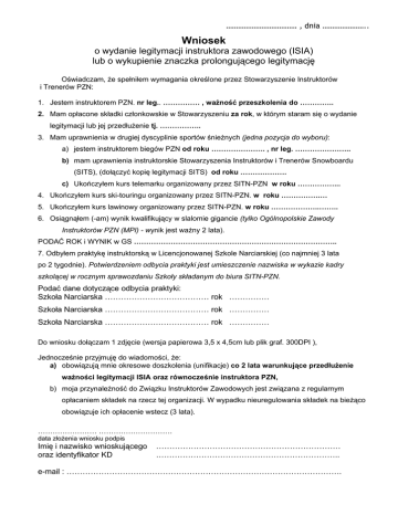 ……………………………… , dnia ………………….. Wniosek o wydanie legitymacji instruktora zawodowego (ISIA) lub o wykupienie znaczka prolongującego legitymację Oświadczam, że spełniłem wymagania określone przez Stowarzyszenie Instruktorów i Trenerów PZN: 1. Jestem instruktorem PZN. nr leg.. …………… , ważność przeszkolenia do ………….. 2. Mam opłacone składki członkowskie w Stowarzyszeniu za rok, w którym staram się o wydanie legitymacji lub jej przedłużenie tj. …………….. 3. Mam uprawnienia w drugiej dyscyplinie sportów śnieżnych (jedna pozycja do wyboru): a) jestem instruktorem biegów PZN od roku …………………. , nr leg. ………………….. b) mam uprawnienia instruktorskie Stowarzyszenia Instruktorów i Trenerów Snowboardu (SITS), (dołączyć kopię legitymacji SITS) od roku ………………. c) Ukończyłem kurs telemarku organizowany przez SITN-PZN w roku ……………... 4. Ukończyłem kurs ski-touringu organizowany przez SITN-PZN. w roku …………….… 5. Ukończyłem kurs lawinowy organizowany przez SITN-PZN. w roku ………………..…….. 6. Osiągnąłem (-am) wynik kwalifikujący w slalomie gigancie (tylko Ogólnopolskie Zawody Instruktorów PZN (MPI) - wynik jest ważny 2 lata). PODAĆ ROK i WYNIK w GS ……………………………………………………………………….. 7. Odbyłem praktykę instruktorską w Licencjonowanej Szkole Narciarskiej (co najmniej 3 lata po 2 tygodnie). Potwierdzeniem odbycia praktyki jest umieszczenie nazwiska w wykazie kadry szkolącej w rocznym sprawozdaniu Szkoły składanym do biura SITN-PZN. Podać dane dotyczące odbycia praktyki: Szkoła Narciarska ………………………………… rok …………… Szkoła Narciarska ………………………………… rok …………… Szkoła Narciarska ………………………………… rok …………… Do wniosku dołączam 1 zdjęcie (wersja papierowa 3,5 x 4,5cm lub plik graf. 300DPI ), Jednocześnie przyjmuję do wiadomości, że: a) obowiązują mnie okresowe doszkolenia (unifikacje) co 2 lata warunkujące przedłużenie ważności legitymacji ISIA oraz równocześnie instruktora PZN, b) moja przynależność do Związku Instruktorów Zawodowych jest związana z regularnym opłacaniem składek na rzecz tej organizacji. W wypadku nieuregulowania składek na bieżąco obowiązuje ich opłacenie wstecz (3 lata). …………………… ………………………… data złożenia wniosku podpis Imię i nazwisko wnioskującego oraz identyfikator KD …………………………………………………………… .………………………………………………………….. e-mail : ………………………………………………………………………………………….