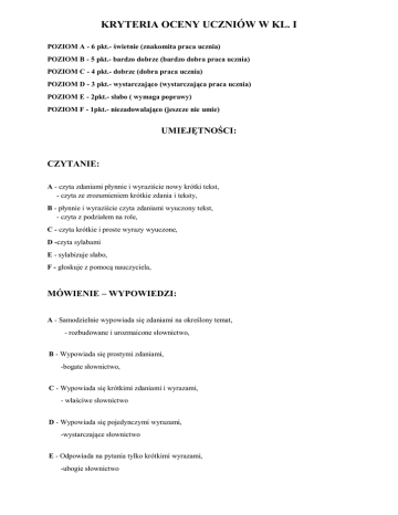 KRYTERIA OCENY UCZNIÓW W KL. I POZIOM A - 6 pkt.- świetnie (znakomita praca ucznia) POZIOM B - 5 pkt.- bardzo dobrze (bardzo dobra praca ucznia) POZIOM C - 4 pkt.- dobrze (dobra praca ucznia) POZIOM D - 3 pkt.- wystarczająco (wystarczająca praca ucznia) POZIOM E - 2pkt.- słabo ( wymaga poprawy) POZIOM F - 1pkt.- niezadowalająco (jeszcze nie umie) UMIEJĘTNOŚCI: CZYTANIE: A - czyta zdaniami płynnie i wyraziście nowy krótki tekst, - czyta ze zrozumieniem krótkie zdania i teksty, B - płynnie i wyraziście czyta zdaniami wyuczony tekst, - czyta z podziałem na role, C - czyta krótkie i proste wyrazy wyuczone, D -czyta sylabami E - sylabizuje słabo, F - głoskuje z pomocą nauczyciela, MÓWIENIE – WYPOWIEDZI: A - Samodzielnie wypowiada się zdaniami na określony temat, - rozbudowane i urozmaicone słownictwo, B - Wypowiada się prostymi zdaniami, -bogate słownictwo, C - Wypowiada się krótkimi zdaniami i wyrazami, - właściwe słownictwo D - Wypowiada się pojedynczymi wyrazami, -wystarczające słownictwo E - Odpowiada na pytania tylko krótkimi wyrazami, -ubogie słownictwo F - Odpowiada tylko na pytania nauczyciela, - bardzo ubogie słownictwo ORTOGRAFIA: A - 6 pkt. 0 błędów B - 5 pkt. 1-2 bledy C - 4 pkt. 2-5 błędów D - 3 pkt. 6-7 błędów E - 2 pkt. 8-9 błędów F - 1 pkt. 10 i więcej błędów 3 haczyki ( ą, ę) – 1 błąd 3 kreski, kropki, przecinki – 1 błąd Brak wielkiej litery – 1 błąd GRAMATYCZNO – STYLISTYCZNE (PISANIE): A - pisze poprawnie z pamięci i ze słuchu w zakresie opracowanego słownictwa, - zachowuje prawidłowo polaczenia i kształt liter, - mieści się zawsze w liniach, - pismo jest zawsze estetyczne, - przepisuje bezbłędnie, - pisze samodzielnie zdania, B - pisze poprawnie z pamięci, - mieści się w liniach, - zachowuje prawidłowy kształt liter, - myli się przy pisaniu ze słuchu, - przepisuje tekst drukowany zawsze poprawnie, C - poprawnie przepisuje tekst, - mieści się w liniach, - zachowuje prawidłowy kształt liter i ich polaczę, D - poprawnie przepisuje z pisma z druku popełnia drobne bledy, - czasami myli litery o podobnych kształtach, - myli linie, - niekiedy nieprawidłowo łączy litery, E - myli się przy przepisywaniu, - nie zachowuje w większości liniatury, - myli kształt niektórych liter, - nie stosuje w większości poprawnych połączeń liter w wyrazach, F - wykonuje zadania i ćwiczenia wyłącznie pod kierunkiem nauczyciela, - myli większość liter i ich połączeń, - nie zachowuje właściwej liniatury – wymaga wskazówek nauczyciela, LICZENIE: A – posiada ukształtowane pojecie liczby, - zna cyfry od 0-9, - zna i rozróżnia figury geometryczne, - dodaje i odejmuje w zakresie 20 w pamięci, - układa i rozwiązuje zadania z treścią, - orientuje się w przestrzeni, - zna dni tygodnia, miesiąca- liczę dni w poszczególnym miesiącu, - zadania wykonuje samodzielnie i jest b. aktywny, B – posiada ukształtowane pojecie liczby, -zna cyfry od 0-9, - zna i rozróżnia poznane figury geometryczne, - dodaje i odejmuje w zakresie 20 w pamięci, - rozwiązuje i układa proste zadania tekstowe, - orientuje się w przestrzeni, - zna dni tygodnia i miesiąca, - zgłasza się i pracuje samodzielnie, C – posiada ukształtowane pojecie liczby, - zna cyfry od 0-9, -zna i rozróżnia poznane figury geometryczne, potrafi je nazwać, - dodaje i odejmuje w zakresie 20 na konkretach, w zakresie 10 samodzielnie w pamięci, - rozwiązuje proste zadania tekstowe, - dość dobrze orientuje się w przestrzeni, - zna dni tygodnia nazwy miesięcy, D – posiada ukształtowane pojecie liczby, - myli cyfry podobnie wyglądające, - rozróżnia 2 figury geometryczne, - dodaje i odejmuje w zakresie 10 samodzielnie, -proste zadania z treścią rozwiązuje często z pomocą nauczyciela, - w miarę dobrze orientuje się w przestrzeni, - zna dni tygodnia, z pomocą nauczyciela wymieni nazwę miesięcy, - jest średnio aktywny, E – słabo zna cyfry – myli je, - rozpoznaje 1 figurę geometryczna, - dodaje, ale słabo odejmuje w zakresie 10, - jest malo aktywny, F – zna 1-3 cyfry, myli je, - nie rozumie zadań z treścią, - pod kierunkiem nauczyciela dodaje w konkretach, nie obejmuje, - nie zna dni tygodnia, - opowiada tylko na pytania nauczyciel- mylnie, - nie jest aktywny, RACHUNEK PAMIĘCIOWY:( odnosi się do 10 przykładów działań matematycznych) A – 100% 10 dobrych odpowiedzi B – 99%- 90% 8-9 C – 89%- 70% 6-7 D - 69%- 50% 5 E - 49%-30% 3-4 F - 29%- 0% 1-2 j.w. SPOŁECZNO PRZYRODNICZE : A – zna zasady i bezpiecznie porusza się w otoczeniu, - zna i szanuje osoby z najbliższego otoczenia, - ma poczucie poszanowania środowiska, - troszczy się o rośliny i zwierzęta, zbiera okazy, hoduje rośliny, zna sposoby ich pielęgnacji, - jest bardzo aktywny, -posiada rozległa wiedze ogólna, B – bezpiecznie porusza się po okolicy, - zna i szanuje osoby z najbliższego otoczenia, -Ma poczucie ochrony środowiska, - troszczy się o rośliny i zwierzęta, zna sposoby ich pielęgnacji, zbiera okazy, - jest aktywny na każdych zajęciach, - wypowiada się sensownie i zawsze na temat, - posiada duża wiedze, C - bezpiecznie porusza się po okolicy, - zna najbliższe osoby i szanuje je, - ma poczucie poszanowania przyrody, - troszczy się o rośliny i zwierzęta i zna niektóre zasady ich pielęgnacji, - jest Malo aktywny na zajęciach, - zapamiętuje wiadomości i umiejętności poznane na lekcji, - posiada wystarczająca wiedze, D – wykazuje dość słaba orientacje w otoczeniu, - ma poczucie poszanowania przyrody, - zna kilka osób z najbliższego otoczenia, -raczej wykazuje troszkę i zainteresowanie środowiskiem, - wykazuje chęć opieki nad roślinami i zwierzętami, - potrafi wykazywać najważniejsze informacje z Bierzycach zajęć, - jest raczej malo aktywny na zajęciach, E – orientuje się w terenie pod kierunkiem nauczyciela, - ma poczucie poszanowania przyrody, - zna kilka osób z najb