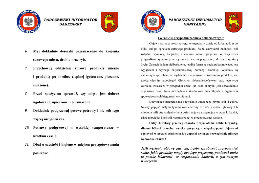 PARCZEWSKI INFORMATOR SANITARNY PARCZEWSKI INFORMATOR SANITARNY Co robić w przypadku zatrucia pokarmowego ? Objawy zatrucia pokarmowego występują w czasie od kilku godzin do 6. Myj dokładnie deseczki przeznaczone do krojenia surowego mięsa, drobiu oraz ryb. kilku dni po spoŜyciu zatrutego produktu. Są to zazwyczaj nudności, ból Ŝołądka, wymioty, biegunka, a czasami nawet gorączka. W większości przypadków symptomy te są prawdziwie nieprzyjemne, ale nie zagraŜają Ŝyciu. Zatrucie jadem kiełbasianym, rzadka forma zatrucia pokarmowego, jest 7. Przechowuj oddzielnie surowe produkty mięsne i produkty po obróbce cieplnej (gotowane, pieczone, wyjątkiem i wymaga natychmiastowej pomocy lekarskiej. Wymioty są naturalnym sposobem na wydalenie z organizmu szkodliwego produktu, nie trzeba więc im zapobiegać. Głównym niebezpieczeństwem przy tego typu smaŜone). 8. Przed spoŜyciem sprawdź, czy mięso jest dobrze ugotowane, upieczone lub usmaŜone. zatruciu, zwłaszcza w przypadku dzieci lub osób chorych, jest odwodnienie organizmu oraz utrata niezbędnych składników mineralnych z organizmu spowodowanych biegunką i wymiotami. Decydujące znaczenie ma odzyskanie utraconego płynu, soli i cukru. NaleŜy popijać małymi łykami rozcieńczony roztwór z cukru, glukozy lub 9. Dokładnie podgrzewaj gotowe potrawy i nie rób tego więcej niŜ jeden raz. miodu, a jeśli utrata płynów była duŜa i objawy utrzymują się przez kilka dni, takŜe niewielką ilość soli rozpuszczonej w przegotowanej wodzie. Ostry, burzliwy przebieg choroby z wymiotami, obfita biegunką, 10. Potrawy podgrzewaj w wysokiej temperaturze w krótkim czasie. silnymi bólami brzucha, wysoka gorączką, z niepokojącymi objawami ogólnymi w postaci osłabienia lub zapaści wymaga bezwzględnie pilnego wezwania lekarza ! 11. Dbaj o czystość i higienę w miejscu przygotowywania posiłków! Jeśli wystąpią objawy zatrucia, trzeba spróbować przypomnieć sobie, jakie produkty mogły być jego przyczyną, poniewaŜ moŜe to pomóc lekarzowi w rozpoznaniu bakterii, a tym samym w leczeniu.