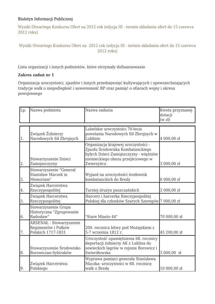 Biuletyn Informacji Publicznej Wyniki Otwartego Konkursu Ofert na 2012 rok (edycja III - termin składania ofert do 15 czerwca 2012 roku) Wyniki Otwartego Konkursu Ofert na 2012 rok (edycja III - termin składania ofert do 15 czerwca 2012 roku) Lista organizacji i innych podmiotów, które otrzymały dofinansowanie Zakres zadań nr 1 Organizacja uroczystości, zjazdów i innych przedsięwzięć kultywujących i upowszechniających tradycje walk o niepodległość i suwerenność RP oraz pamięć o ofiarach wojny i okresu powojennego Lp. Nazwa podmiotu Nazwa zadania Kwota przyznanej dotacji (w zł) Związek Żołnierzy Narodowych Sił Zbrojnych Lubelskie uroczystości 70-lecia powstania Narodowych Sił Zbrojnych w Lublinie 4 000,00 zł 2. Stowarzyszenie Dzieci Zamojszczyzny Organizacja krajowej uroczystości Zjazdu Środowiska Kombatanckiego byłych Dzieci Zamojszczyzny - więźniów niemieckiego obozu przejściowego w Zwierzyńcu 3 000,00 zł 3. Stowarzyszenie "Generał Stanisław Maczek in Memoriam" Wyjazd na uroczystości środowisk kombatanckich do Bredy 6 000,00 zł 4. Związek Harcerstwa Rzeczypospolitej Turniej drużyn puszczańskich 3 000,00 zł 5. Związek Harcerstwa Rzeczypospolitej Harcerz i harcerka Rzeczypospolitej Polskiej dla członków Szarych Szeregów 7 000,00 zł 6. Stowarzyszenie Grupa Historyczna "Zgrupowanie Radosław" "Stare Miasto 44" 70 000,00 zł 7. ARSENAŁ - Stowarzyszenie Regimentów i Pułków Polskich 1717-1831 200. rocznica bitwy pod Możajskiem z 5-7 września 1812 r. 45 200,00 zł 8. Stowarzyszenie Środowisko Borowiczan-Sybiraków Uroczystość upamiętnienia 68. rocznicy deportacji żołnierzy AK z Lublina do sowieckich łagrów w rejonie Borowicz i Swierdłowska 3 000,00 zł 9. Związek Harcerstwa Polskiego Wyprawa pamięci generała Stanisława Maczka- uroczystości w 68. rocznicę walk o Bredę 1. 10 000,00 zł 10. Fundacja Generał Elżbiety Zawackiej. Archiwum i Muzeum Pomorskie Armii Krajowej oraz Wojskowej Służby Polek Konferencja naukowa: "Polska 1939-1945. Obszary inkorporowane do Rzeszy. Generalne Gubernatorstwo oraz ziemie wcielone do Związku Radzieckiego. Podobieństwa i różnice" (tytuł roboczy) 3 000,00 zł Zakres zadań nr 2 Upamiętnianie miejsc historycznych wydarzeń, czynów zbrojnych i innych form działalności niepodległościowej, męczeństwa i represji, a także upamiętnianie osób związanych z tymi wydarzeniami. Lp. Nazwa podmiotu 1. 2. Nazwa zadania Kwota przyznanej dotacji (w zł) Światowy Związek Żołnierzy Armii Krajowej Modernizacja Grobu Nieznanego Żołnierza w miejscowości Uchanie w powiecie hrubieszowskim upamiętnianie bohaterów walki niepodległościowej, ofiar męczeństwa i represji z okresu I i II wojny światowej 15 000,00 zł Społeczny Komitet Opieki nad Grobami Poległych Żołnierzy Batalionu "Zośka" Budowa pomnika - kamienia pamiątkowego - poświęconego pamięci Jana Rodowicza ps. "Anoda" 4 000,00 zł Zakres zadań nr 3 Działalność dokumentacyjna i wydawnicza związana z kultywowaniem i upowszechnianiem tradycji walk o niepodległość i suwerenność RP oraz pamięci o ofiarach wojny i okresu powojennego. Lp. Nazwa podmiotu 1. 2. Nazwa zadania Kwota przyznanej dotacji (w zł) Związek Strzelecki "Strzelec". Organizacja Społeczno-Wychowawcza. Jednostka Strzelecka 1001 im. gen. dyw. Janusza Głuchowskiego Publikacja pracy dr Anny Prokopiak-Lewandowskiej pt. Władysław-Pobóg Malinowski 1899-1962 Związek Strzelecki "Strzelec". Organizacja Społeczno-Wychowawcza. Jednostka Strzelecka 1001 im. gen. dyw. Janusza Głuchowskiego Wydanie pamiętnika Wilhelma Wilczyńskiego pt. Na szlaku bojowym z I Brygadą Legionów Polskich w oprac. prof. Przemysława Waingertnera i dr Agnieszki Jędrzejowskiej 6 000,00 zł 8 000,00 zł Związek Strzelecki "Strzelec". Organizacja Społeczno-Wychowawcza. Jednostka Strzelecka 1001 im. Publikacja pracy prof. Jerzego gen. dyw. Janusza Zalewskiego pt. Bezpieczeństwo Głuchowskiego polityczne Drugiej Rzeczypospolitej 6 000,00 zł 4. Fundacja Filmowa Armii Krajowej Realizacja filmu dokumentalnego Teresa Sułowska-Bojarska 20 000,00 zł 5. V Production Edyta Pierzchanowska Film dokumentalny Trzykrotny wyrok śmierci 30 000,00 zł 6. Stowarzyszenie "Nasz Gdańsk" Publikacja naukowa Policja gdańska na przestrzeni wieków - praca zbiorowa pod red. naukową prof. zw. dr. hab. Andrzeja Gąsiorowskiego 5 000,00 zł 7. Stowarzyszenie "Nasz Gdańsk" Miesięcznik Nasz Gdańsk 3. 8. 3 000,00 zł Publikacja książki Anny Marcinkiewicz-Kaczmarczyk dotyczącej repatriacji żołnierzy PSZ na Zachodzie po zakończeniu II wojny światowej pt. Repatriacja żołnierzy PSZ na Zachodzie Agencja w rozmowach TRJN z władzami Reklamowo-Usługowa "PAT" brytyjskimi (1945-1949). Wybór Anna Ekiert dokumentów 4 000,00 zł Produkcja historycznego filmu dokumentalnego pod roboczym tytułem Węgierskie serce 100 000,00 zł 9. Telewizja Religia Sp. z o.o. 10. ACCESS GRAM TV Sp. z o.o. Film dokumentalny Perskie ocalenie 11. Fundacja Generał Elżbiety Zawackiej. Archiwum i Muzeum Pomorskie Armii Krajowej oraz Wojskowej Służby Polek Wydanie publikacji Pomorzanie w Wehrmachcie. Zbiór studiów, pod red. Jana Szilinga 3 000,00 zł 12. NORBERTINUM Wydawnictwo -Drukarnia-Księgarnia Opublikowanie książki: Daniel Chraniuk, Ignacy Czuma. Uczony i polityk 4 000,00 zł 13. Fundacja Kresy-Syberia Wirtualna ściana pamięci Armii Andersa - indeks żołnierzy 8 000,00 zł 14. Muzeum Historii Polski Londyńczycy. Oczekiwanie na wolną Polskę. Losy polskiej emigracji w Londynie w latach 1945-1989 92 000,00 zł 15. PADO STUDIO FILM Dorota Przyłubska Film dokumentalny pt. Czesław Cywiński 15 000,00 zł 145 000,00 zł