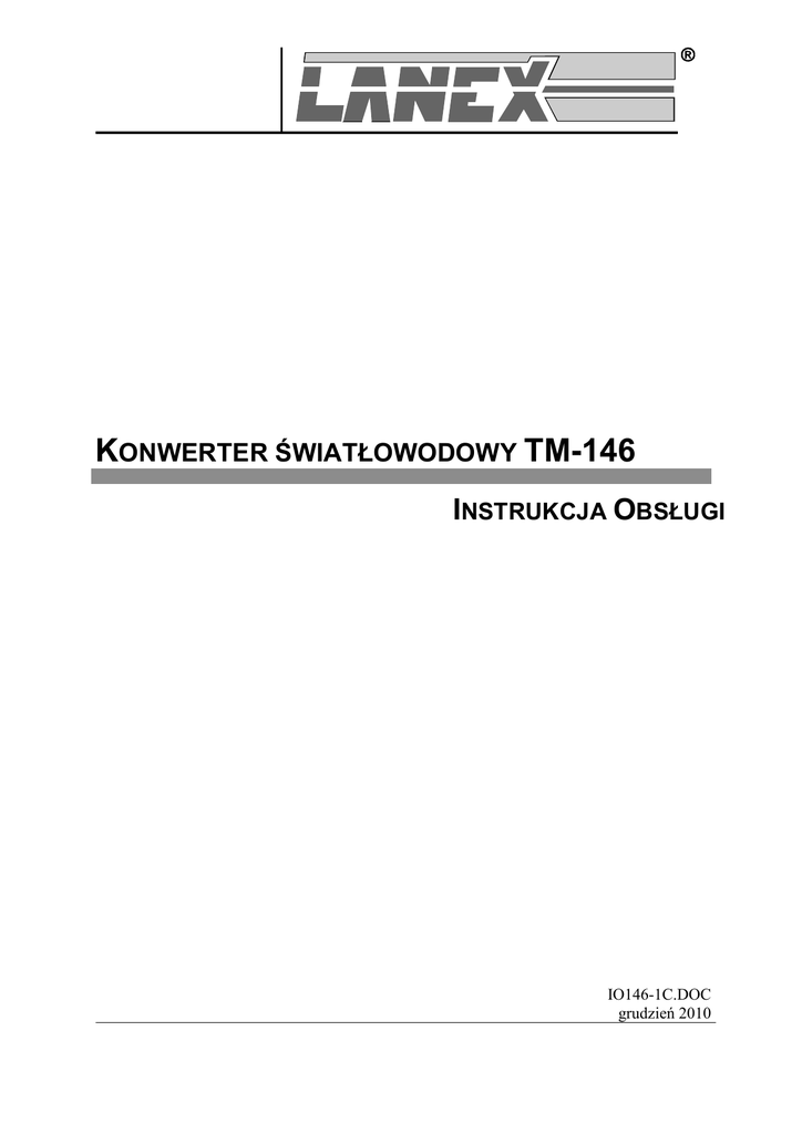 KONWERTER ŚWIATŁOWODOWY TM-146 INSTRUKCJA OBSŁUGI IO146-1C.DOC grudzień 2010 KONWERTER ŚWIATŁOWODOWY Instrukcja Obsługi Spis treści 1. 2. 3. 4. 5. Charakterystyka ogólna................................................................................................. 5 1.1. Widok urządzenia..................................................................................................... 5 1.2. Przeznaczenie urządzenia ......................................................................................... 5 1.3. Oznaczanie: .............................................................................................................. 6 1.4. Przykładowe sposoby wykorzystania konwertera.................................................... 7 Złącza i elementy sygnalizacyjne ................................................................................. 7 2.1. Złącza ....................................................................................................................... 8 2.1.1. złącze zasilania ............................................................................................... 8 2.2. Sygnalizacja ............................................................................................................. 8 Opis funkcjonalny ......................................................................................................... 9 Instalacja i obsługa ........................................................................................................ 9 4.1. Warunki pracy .......................................................................................................... 9 4.2. Instalacja................................................................................................................... 9 4.3. Zasięg transmisji .................................................................................................... 10 4.4. Zasady posługiwania się złączami światłowodowymi ........................................... 11 4.5. Zasilanie ................................................................................................................. 11 Dane techniczne .......................................................................................................... 12 5.1. Parametry optyczne ................................................................................................ 12 5.2. Parametry mechaniczne.......................................................................................... 12 5.3. Wymagania środowiskowe .................................................................................... 12 5.3.1. Eksploatacja ................................................................................................. 12 5.3.2. Transport ...................................................................................................... 12 5.4. Kompatybilność elektromagnetyczna .................................................................... 12 5.5. Zasilanie ................................................................................................................. 13 5.6. Kompletacja wyrobu .............................................................................................. 14 Spis rysunków Rysunek 1.1. Widok urządzenia ................................................................................................. 5 Rysunek 2.1. Złącze zasilania .................................................................................................... 8 Rysunek 2.2. Elementy sygnalizacyjne konwertera TM-146 .................................................... 8 IO146-1C.DOC 3 grudzień 2010 KONWERTER ŚWIATŁOWODOWY Instrukcja Obsługi Bezpieczeństwo użytkowania Urządzenia TM-146 zostało zaprojektowane w zakresie bezpieczeństwa użytkowania, zgodnie z III klasą normy PN-EN 60950. Urządzenie nie posiada wmontowanego układu rozłączającego. Układ taki powinien znajdować się na zewnątrz urządzenia. W przypadku, kiedy urządzenie jest zasilane ze źródła prądu stałego, łatwo dostępny układ rozłączający powinien być wmontowany w stałe okablowanie na zewnątrz urządzenia. Promieniowanie emitowane przez nadajnik laserowy jest szkodliwe dla wzroku! Pod żadnym pozorem nie należy patrzeć na nieosłonięte gniazdo, do którego nie jest dołączone złącze światłowodowe. Producent nie odpowiada za stosowanie urządzenia niezgodnie z instrukcją obsługi. Instrukcja obsługi jest integralną częścią urządzenia i wraz z nim jest przekazywana użytkownikom. IO146-1C.DOC 4 grudzień 2010 KONWERTER ŚWIATŁOWODOWY Instrukcja Obsługi 1. Charakterystyka ogólna. 1.1. Widok urządzenia Rysunek 1.1. Widok urządzenia 1.2. Przeznaczenie urządzenia TM-146 jest urządzeniem służącym do realizacji połączeń w topologii punkt-punkt w sieciach optycznych, w których zachodzi konieczność konwersji cyfrowej transmisji światłowodowej dwuwłóknowej na jednowłóknową lub transmisji ze światłowodu wielomodowego na jednomodowy jak również zmiany długości fali świetlnej w oknach 850 nm, 1310 nm, 1550 nm lub CWDM (opcjonalnie). Poszczególne wersje urządzenia umożliwiają realizację połączenia z wykorzystaniem dwóch włókien światłowodu jednomodowego lub wielomodowego albo jednego włókna światłowodu jednomodowego w technice WDM. Dodatkowo TM-146 może zostać użyte do regeneracji parametrów amplitudowych transmitowanego sygnału cyfrowego. Transmisja jest realizowana transparentnie, bez wnikania w strukturę przesyłanego sygnału, którego przepływność powinna zawierać się w przedziale od 10 do 200 Mbit/s lub od 500 do 1300 Mb/s. IO146-1C.DOC 5 grudzień 2010 KONWERTER ŚWIATŁOWODOWY Instrukcja Obsługi 1.3. Oznaczanie: TM – 146 – W – X – Y Z (T) T - oznacza wersję konwertera przystosowaną do pracy w rozszerzonym zakresie temperaturowym: -40C ... +75C – dotyczy tylko wersji 10-200 Mb/s Zasięg: S – krótki (Short) 