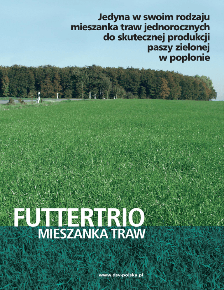 Jedyna w swoim rodzaju mieszanka traw jednorocznych do skutecznej produkcji paszy zielonej w poplonie FUTTERTRIO MIESZANKA TRAW www.dsv-polska.pl Mieszanka Futtertrio Profil mieszanki Zalecenia uprawy Mieszanka Futtertrio do uprawy poplonowej sk∏ada si´ z trzech wysokoplonujàcych odmian ˝ycicy westerwoldz- Wysiew: kiej. Spe∏nia ona najwy˝sze wymagania dostarczajàc bardzo P∏ytko na gleb´ wtórnie ubità; dobrej paszy o wyÊmienitej jakoÊci. Termin wysiewu: do 15 sierpnia. Mieszanka Futtertrio Umo˝liwia wczesne wypasanie lub produkcj´ dobrej jakoÊci kiszonki. Dostarcza kiszonk´ o odpowiedniej strukturze, zgodnej z wymaganiami prze˝uwaczy, z du˝à zawartoÊcià suchej masy przy jednoczeÊnie wysokiej strawnoÊci. Wyró˝nia si´ wyrównanà proporcjà bia∏ka do energii. Gwarantuje wysokie pobranie paszy, podwy˝szajàc tym samym produkcj´ mleka lub mi´sa z paszy podstawowej. Mieszanka Futtertrio sk∏ada si´ z dwóch odmian diploidalnych i jednej tetraploidalnej Ponadprzeci´tne w∏aÊciwoÊci plonowania, jakoÊci i odpornoÊci na choroby tych odmian uzupe∏niajà si´ wyÊmienicie. Wszystkie odmiany wchodzàce w sk∏ad mieszanki zosta∏y wyhodowane w celu, aby mo˝na je by∏o stosowaç na poplony. Wszystkie rosnà w bardzo szybkim tempie dajàc wysokie plony masy. Kombinacja odmian jest bardzo udanym zwiàzkiem: odmiany diploidalne cechujà si´ wysokà zawartoÊcià suchej masy i dobrà strukturà paszy, oraz wysokà zawartoÊcià cukrów, a tetraploidalne wyró˝niajà si´ wysokà strawnoÊcià i smakowitoÊcià. G´stoÊç wysiewu 45 kg/ha. Nawo˝enie N: 100-120 kg N/ha (gnojowica/nawóz mineralny). U˝ytkowanie KoÊne: Dojrza∏oÊç kiszonkowà Mieszanka Futtertrio osiàga po 8 tygodniach. U˝ytkowanie koÊne w fazie k∏oszenia pozwala na uzyskanie najwy˝szej jakoÊci paszy, oraz uzyskanie szybkiego ponownego odrostu dla dalszego pastwiskowania do koƒca okresu wegetacji. Pastwiskowanie: Dojrza∏oÊç pastwiskowa Mieszanki Futtertrio rozpoczyna si´ po zwarciu ∏anu (wysokoÊç porostu ok. 15 cm). Ten termin nast´puje ju˝ po 6 tygodniach od zasiewu. Podzia∏ na kwatery powinien byç tak wymierzony, aby ruƒ nie zdà˝y∏a przerosnàç i przejrzeç. W takim przypadku iloÊç niedojadów b´dzie niska. Mieszanka wykazuje wysoki poziom odpornoÊci na choroby. Na uwag´ zwraca szczególnie niska podatnoÊç na rdze i màczniaki. DSV Polska Sp. z o.o. ul. Straszewska 70 62-100 Wàgrowiec tel.067/ 26 80 750 fax 067/ 26 80 755 e-mail: [email protected] www.dsv-polska.pl
