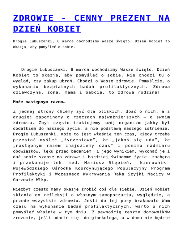 ZDROWIE - CENNY PREZENT NA DZIEŃ KOBIET Drogie Lubuszanki, 8 marca obchodzimy Wasze święto. Dzień Kobiet to okazja, aby pomyśleć o sobie. Drogie Lubuszanki, 8 marca obchodzimy Wasze święto. Dzień Kobiet to okazja, aby pomyśleć o sobie. Nie chodzi tu o wygląd, czy zakup ubrań. Chodzi o Wasze zdrowie. Pomyślcie, o wykonaniu bezpłatnych badań profilaktycznych. Zdrowa dziewczyna, żona, mama i babcia, to zdrowa rodzina! Może następnym razem… Z jednej strony chcemy żyć dla bliskich, dbać o nich, a z drugiej zapominamy o rzeczach najważniejszych – o swoim zdrowiu. Zbyt często traktujemy swój organizm jakby był dodatkiem do naszego życia, a nie podstawą naszego istnienia. Drogie Lubuszanki, może to jest właśnie ten czas, kiedy trzeba przestać myśleć „życzeniowo”, że „jakoś się uda”, że „następnym razem znajdziemy czas” i pomimo nadmiaru obowiązków, lęku przed badaniem i jego wynikiem, wykonać je i dać sobie szansę na zdrowe i bardziej świadome życie- zachęca i przekonuje lek. med. Mariusz Stępień, kierownik Wojewódzkiego Ośrodka Koordynującego Populacyjny Program Profilaktyki i Wczesnego Wykrywania Raka Szyjki Macicy w Gorzowie Wlkp. Niezbyt często mamy okazję zrobić coś dla siebie. Dzień Kobiet skłania do refleksji o własnym samopoczuciu, wyglądzie, a przede wszystkim zdrowiu. Jeśli do tej pory brakowało Wam czasu na wykonanie badań profilaktycznych, warto o nich pomyśleć właśnie w tym dniu. Z pewnością reszta domowników zrozumie, jeśli udacie się do ginekologa, a w domu nie będzie ciepłego obiadu. Może wybierzecie się za to na rodzinny posiłek do restauracji. Zdrowie jest przecież ważniejsze, niż cała lista domowych obowiązków. Co nieco o programie Populacyjny Program Profilaktyki i Wczesnego Wykrywania Raka Szyjki Macicy skierowany jest do kobiet w wieku 25-59 lat, aktualnie objętych powszechnym ubezpieczeniem zdrowotnym w NFZ. To one otrzymują raz na 3 lata imienne zaproszenie do gabinetu ginekologicznego (etap podstawowy Programu) w celu wykonania badania cytologicznego. Każda kobieta uczestnicząca w Programie ma zapewnioną kompleksową i wieloetapową opiekę medyczną: • w przypadku podejrzenia nieprawidłowego wyniku badania cytologicznego w etapie diagnostycznym pacjentka jest kierowana na powtórne badanie cytologiczne lub do placówki etapu pogłębionego na badanie kolposkopowe wraz z biopsją, czyli pobraniem celowanych wycinków z tarczy szyjki macicy oraz wyłyżeczkowaniem kanału szyjki i ewentualnie jamy macicy; • w przypadku potwierdzenia diagnozy pacjentka kierowana jest do leczenia na oddział onkologiczny. Bez obaw! Nie ma się czego bać! Badanie trwa kilka minut, jest bezbolesne. – Gdy kobieta zgłosi się za późno, z zaawansowanymi powikłaniami, nie możemy zrobić nic poza uśmierzaniem bólu. Pacjentki wtedy żałują, że nie pomyślały o profilaktyce wcześniej. Zawsze było coś na głowie, coś innego do zrobienia, często krył się za tym lęk. Niepotrzebnie – podkreśla specjalista ginekolog Mariusz Stępień. Adresy gabinetów wykonujących bezpłatną cytologię znajdziecie tutaj: http://wok-lubuski.pl/news/view/50.html Specjaliści z Wojewódzkiego Ośrodka Koordynującego Populacyjny Program Profilaktyki i Wczesnego Wykrywania Raka Szyjki Macicy w Gorzowie Wlkp. będą udzielać porad i przekazywać materiały informacyjne także podczas jubileuszowej konferencji kobiet pod hasłem ,,Ewa i Adam – to nie ja byłam Ewą…”, która odbędzie się 7 marca w Filharmonii Gorzowskiej. W jej ramach organizatorzy zaplanowali m.in. wystawy, koncerty, pokazy mody, wykłady. Poza tym przewidziano stoiska promocyjne takich instytucji i podmiotów, jak np. Urząd Marszałkowski Województwa Lubuskiego, Wojewódzki Ośrodek Koordynujący Populacyjny Program Profilaktyki i Wczesnego Wykrywania Raka Szyjki Macicy, Wojewódzka Poradnia Onkologiczna – Program Nowotworów, Lubuskie Stowarzyszenie Na Recz Kobiet „Baba” w Zielonej Górze, Powiatowy Urząd Pracy w Gorzowie. Organizatorem konferencji jest Fundacja Czysta Woda: www.fundacjaczystawoda.pl Czekamy na Was Drogie Panie! Z życzeniami zdrowego, radosnego i spokojnego Wojewódzki Ośrodek Koordynujący Populacyjny życia – Program Profilaktyki i Wczesnego Wykrywania Raka Szyjki Macicy w Gorzowie Wlkp. beztytuu beztytuu1