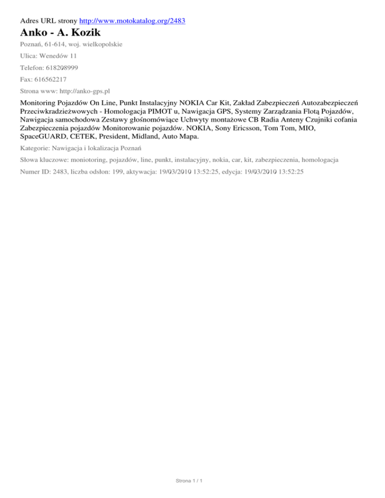 Adres URL strony http://www.motokatalog.org/2483 Anko - A. Kozik Poznań, 61-614, woj. wielkopolskie Ulica: Wenedów 11 Telefon: 618208999 Fax: 616562217 Strona www: http://anko-gps.pl Monitoring Pojazdów On Line, Punkt Instalacyjny NOKIA Car Kit, Zakład Zabezpieczeń Autozabezpieczeń Przeciwkradzieżwowych - Homologacja PIMOT u, Nawigacja GPS, Systemy Zarządzania Flotą Pojazdów, Nawigacja samochodowa Zestawy głośnomówiące Uchwyty montażowe CB Radia Anteny Czujniki cofania Zabezpieczenia pojazdów Monitorowanie pojazdów. NOKIA, Sony Ericsson, Tom Tom, MIO, SpaceGUARD, CETEK, President, Midland, Auto Mapa. Kategorie: Nawigacja i lokalizacja Poznań Słowa kluczowe: moniotoring, pojazdów, line, punkt, instalacyjny, nokia, car, kit, zabezpieczenia, homologacja Numer ID: 2483, liczba odsłon: 199, aktywacja: 19/03/2010 13:52:25, edycja: 19/03/2010 13:52:25 Strona 1 / 1