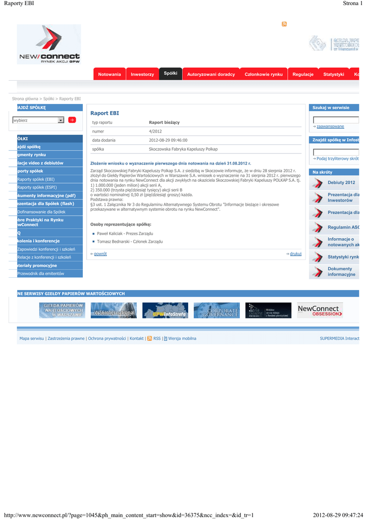 Raporty EBI Strona 1 RSS | Notowania Inwestorzy Spółki Autoryzowani doradcy Członkowie rynku Wersja mobilna | English | Русский Regulacje Statystyki Kontak Strona główna > Spółki > Raporty EBI ZNAJDŹ SPÓŁKĘ Szukaj w serwisie Raport EBI wybierz SPÓŁKI Znajdź spółkę typ raportu Raport bieŜący numer 4/2012 data dodania 2012-08-29 09:46:00 spółka Skoczowska Fabryka Kapeluszy Polkap zaawansowane Znajdź spółkę w Infostrefie Segmenty rynku Podaj trzyliterowy skrót Relacje video z debiutów ZłoŜenie wniosku o wyznaczenie pierwszego dnia notowania na dzień 31.08.2012 r. Raporty spółek Zarząd Skoczowskiej Fabryki Kapeluszy Polkap S.A. z siedzibą w Skoczowie informuje, Ŝe w dniu 28 sierpnia 2012 r. złoŜył do Giełdy Papierów Wartościowych w Warszawie S.A. wniosek o wyznaczenie na 31 sierpnia 2012 r. pierwszego dnia notowania na rynku NewConnect dla akcji zwykłych na okaziciela Skoczowskiej Fabryki Kapeluszy POLKAP S.A. tj. 1) 1.000.000 (jeden milion) akcji serii A, 2) 350.000 (trzysta pięćdziesiąt tysięcy) akcji serii B o wartości nominalnej 0,50 zł (pięćdziesiąt groszy) kaŜda. Podstawa prawna: §3 ust. 1 Załącznika Nr 3 do Regulaminu Alternatywnego Systemu Obrotu "Informacje bieŜące i okresowe przekazywane w alternatywnym systemie obrotu na rynku NewConnect". Raporty spółek (EBI) Raporty spółek (ESPI) Dokumenty informacyjne (pdf) Prezentacja dla Spółek (flash) Dofinansowanie dla Spółek Dobre Praktyki na Rynku NewConnect Osoby reprezentujące spółkę: Na skróty Debiuty 2012 Prezentacja dla Inwestorów Prezentacja dla Regulamin ASO FAQ Paweł Kaliciak - Prezes Zarządu Szkolenia i konferencje Tomasz Bednarski - Członek Zarządu Informacje o notowanych akcjac Zapowiedzi konferencji i szkoleń Relacje z konferencji i szkoleń powrót drukuj Materiały promocyjne Statystyki rynku Dokumenty informacyjne Przewodnik dla emitentów INNE SERWISY GIEŁDY PAPIERÓW WARTOŚCIOWYCH Mapa serwisu | ZastrzeŜenia prawne | Ochrona prywatności | Kontakt | RSS | Wersja mobilna http://www.newconnect.pl/?page=1045&ph_main_content_start=show&id=36375&ncc_index=&id_tr=1 SUPERMEDIA Interactive 2012-08-29 09:47:24