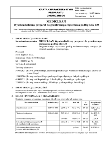 Data sporządzenia: KARTA CHARAKTERYSTYKI 10.08.2004 r. PREPARATU Data aktualizacji: 28.03.2008 r. CHEMICZNEGO Strona/stron: 1z5 MEDICLEAN Wysokoalkaliczny preparat do gruntownego czyszczenia podłóg MG 130 Karta Charakterystyki Preparatu Niebezpiecznego jest zgodna z rozporządzeniem Ministra Zdrowia z dnia 13.11.2007 r. w sprawie kart charakterystyki (Dz. U. z 2007, Nr 215, poz. 1588) oraz Rozporządzeniem WE 1907/2006 z 18.12.2006 - REACH 1. IDENTYFIKACJA PREPARATU Nazwa handlowa produktu: MEDICLEAN Wysokoalkaliczny preparat do gruntownego czyszczenia podłóg MG 130 Zastosowanie: Do gruntownego czyszczenia podłóg zarówno maszyną szorującą jak również ręcznie za pomocą mopa. Producent: Medi-Sept Sp. z o.o. Konopnica 159C, 21-030 Motycz tel. (+81) 503 23 77 www.medi-sept.com.pl Telefony alarmowe: 583492831 (dla woj. pomorskiego, zachodniopomorskiego, warmińsko-mazurskiego, kujaws-kopomorskiego) 126468706 (dla woj. małopolskiego, podkarpackiego, śląskiego, świętokrzyskiego) 618481011 (dla woj. wielkopolskiego, dolnośląskiego, lubuskiego, opolskiego) 226196654 (dla woj. mazowieckiego, łódzkiego, podkarpackiego, lubelskiego) 2. IDENTYFIKACJA ZAGROŻEŃ Preparat sklasyfikowany jako żrący. Powoduje oparzenia, działa szkodliwie po połknięciu. Powoduje uszkodzenie oczu i podrażnienie skóry. Działa korodująco na metale. 3. SKŁAD I INFORMACJA O SKŁADNIKACH Składniki preparatu stwarzające zagrożenie dla zdrowia człowieka lub środowiska: Nazwa składnika Nr indeksowy Nr WE Nr CAS % m/m Klasyfikacja składnika Metakrzemian disodu 014-010-00-8 229-912-9 10213-79-3 1,0-2,0 C; R34, Xi; R37 Wodorotlenek potasu 019-002-00-8 215-181-3 1310-58-3 3,5-4,5 Xn; R22, C; R35 Pirofosforan czteropotasu 230-785-7 7320-43-5 1,0-2,0 Xi; R36 Sól sodowa N-(2-karboksyetylo)-N(2-etyloheksylo)-β-alaninianu 305-318-6 94441-92-6 1,0-3,0 Xi, R38, R41 polimer 2,0-4,0 Xi,R38 R41, Mieszanina oksyetylenowanych kwasów alkilokarboksylowych Dodatkowe informacje: Treść zwrotów R wskazujących rodzaj zagrożenia surowca znajduje się w punkcie 16. Data sporządzenia: KARTA CHARAKTERYSTYKI 10.08.2004 r. PREPARATU Data aktualizacji: 28.03.2008 r. CHEMICZNEGO Strona/stron: 2z5 MEDICLEAN Wysokoalkaliczny preparat do gruntownego czyszczenia podłóg MG 130 Karta Charakterystyki Preparatu Niebezpiecznego jest zgodna z rozporządzeniem Ministra Zdrowia z dnia 13.11.2007 r. w sprawie kart charakterystyki (Dz. U. z 2007, Nr 215, poz. 1588) oraz Rozporządzeniem WE 1907/2006 z 18.12.2006 - REACH 4. PIERWSZA POMOC Uwagi ogólne: Należy przestrzegać uwag dotyczących bezpieczeństwa i użytkowania zamieszczonych na etykiecie. Przy wystąpieniu symptomów lub w wypadkach wątpliwych zasięgnąć porady lekarza. Kontakt z oczami: W razie kontaktu z oczami natychmiast przemyć dużą ilością wody przez co najmniej 15 min. Koniecznie skonsultować się z okulistą. Kontakt ze skórą: W razie kontaktu ze skórą/odzieżą, natychmiast zdjąć zanieczyszczone ubranie, skażoną skórę przemyć dużą ilością wody. Jeżeli wystąpiły oparzenia, nie stosować mydła. Nie stosować środków zobojętniających (kwaśnych). Założyć jałowy opatrunek na oparzenia. Zapewnić pomoc medyczną. Zatrucie inhalacyjne: W zatruciach inhalacyjnych wyprowadzić poszkodowanego na świeże powietrze. Połknięcie: W razie spożycia nie wywoływać wymiotów. Natychmiast wezwać lekarza. 5. POSTĘPOWANIE W PRZYPADKU POŻARU Zagrożenie pożarowe: Środki gaśnicze: 6. Produkt niepalny. W przypadku pożaru stosować podręczny sprzęt gaśniczy. POSTĘPOWANIE W PRZYPADKU NIEZAMIERZONEGO UWOLNIENIA DO ŚRODOWISKA W przypadku dużego wycieku posypać rozlany produkt materiałem chłonnym (piasek, trociny), zebrać do odpowiednio oznakowanego, zamykanego pojemnika i przekazać do utylizacji. Rozlaną, małą ilość preparatu rozcieńczyć dużą ilością wody i spłukać do kanalizacji. 7. POSTĘPOWANIE Z PREPARATEM I JEGO MAGAZYNOWANIE Postępowanie z preparatem – środki ostrożności: Przechowywanie: 8. Zachować ostrożność i staranność w dozowaniu preparatu. Unikać wdychania par, kontaktu ze skórą i oczami. Produkt przechowywać w szczelnie zamkniętych i oznakowanych pojemnikach. Z dala od kwasów. Nie wystawiać na bezpośrednie działanie promieni słonecznych. Nie przechowywać razem z żywnością. KONTROLA NARAŻENIA I ŚRODKI OCHRONY INDYWIDUALNEJ Parametry kontrolne: Dla składników preparatu nie ustalono wartości najwyższych dopuszczalnych stężeń czynników szkodliwych w środowisku pracy. Środki ochrony indywidualnej: Układ oddechowy: W przypadku właściwej wentylacji ochrona dróg oddechowych nie jest wymagana, w przeciwnym przypadku stosować maski ochronne. Ręce: Przy długotrwałym lub częstym używaniu stosować gumowe rękawice ochronne. Oczy: Stosować okulary ochronne odporne na działanie alkaliów. Najwyższe dopuszczalne stężenia: Nr indeksowy NDS(mg/m3) NDSCh (mg/m3) 019-002-00-8 0,5 1 (wg Rozporządzenia MPiPS z dn. 29 listopada 2002; Dz. U. Nr 217, poz.1833) Data sporządzenia: KARTA CHARAKTERYSTYKI 10.08.2004 r. PREPARATU Data aktualizacji: 28.03.2008 r. CHEMICZNEGO Strona/stron: 3z5 MEDICLEAN Wysokoalkaliczny preparat do gruntownego czyszczenia podłóg MG 130 Karta Charakterystyki Preparatu Niebezpiecznego jest zgodna z rozporządzeniem Ministra Zdrowia z dnia 13.11.2007 r. w sprawie kart charakterystyki (Dz. U. z 2007, Nr 215, poz. 1588) oraz Rozporządzeniem WE 1907/2006 z 18.12.2006 - REACH 9. WŁAŚCIWOŚCI FIZYCZNE I CHEMICZNE Postać: Barwa: Zapach: pH: Temperatura wrzenia: Temperatura topnienia: Prężność par: Gęstość: Rozpuszczalność w wodzie: 10. ciecz fioletowo-czerwona charakterystyczny 14 ok.97 0C brak danych brak danych 1,06 g/cm3 pełna STABILNOŚĆ I REAKTYWNOŚĆ Materiały powodujące niebezpieczne reakcje: Niebezpieczne produkty rozpadu: 11. Kwasy, silne utleniacze. Preparat stabilny w warunkach normalnych. INFORMACJA TOKSYKOLOGICZNA Sk