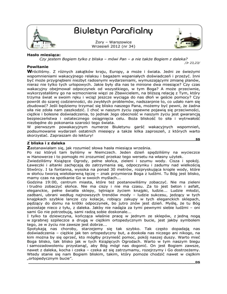 Biuletyn Parafialny Żory – Warszowice Wrzesień 2012 (nr 34) Hasło miesiąca: Czy jestem Bogiem tylko z bliska – mówi Pan – a nie także Bogiem z daleka? /Jr 23,23/ Powitanie Wróciliśmy. Z różnych zakątków kraju, Europy, a może i świata. Jedni ze świeżymi wspomnieniami wakacyjnego relaksu i bagażem wspaniałych doświadczeń i przeżyć. Inni być może przygnębieni niezbyt radosnymi wydarzeniami, wymuszającymi zmianę planów, nieraz nie tylko tych urlopowych. Jakie były dla nas te minione dwa miesiące? Czy czas wakacyjny obejmował odpoczynek od wszystkiego, w tym Boga? A może przeciwnie, wykorzystaliśmy go na wzmocnienie więzi ze Zbawicielem, na bliższą relację z Tym, który trzyma świat w swoim ręku i wciąż jeszcze wyciąga do nas dłoń w geście pomocy? Czy powrót do szarej codzienności, do zwykłych problemów, nadszarpnie to, co udało nam się zbudować? Jeśli będziemy trzymać się blisko naszego Pana, możemy być pewni, że żadna siła nie zdoła nam zaszkodzić. I choć w naszym życiu zapewne pojawią się przeciwności, ciężkie i bolesne doświadczenia, to jednak Jego obecność w naszym życiu jest gwarancją bezpieczeństwa i ostatecznego osiągnięcia celu. Boża bliskość to siła i wytrwałość niezbędne do pokonania szarości tego świata. W pierwszym powakacyjnym numerze Biuletynu garść wakacyjnych wspomnień, podsumowanie wydarzeń ostatnich miesięcy a także kilka zaproszeń, z których warto skorzystać. Zapraszam do lektury! _____________________________________________________________________________SS Z bliska i z daleka Zastanawiałam się, jak rozumieć słowa hasła miesiąca września. Po raz któryś tam byliśmy w Niemczech. Jeden dzień spędziliśmy na wycieczce w Hanowerze i to pomogło mi zrozumieć przekaz tego wersetu na własny użytek. Zwiedziliśmy Książęce Ogrody, pełne słońca, zieleni i szumu wody. Cisza i spokój. Ławeczki i altanki zachęcają do zatrzymania się, odpoczynku i zadumy nad wielkością Stwórcy. I ta fontanna, wysoka na ponad 30 metrów, rozpryskująca krople wody, które w słońcu tworzą wielobarwną tęczę – znak przymierza Boga z ludźmi. Tu Bóg jest blisko, mamy czas na spotkanie Go w swoich myślach... Godzina 19:00, centrum miasta, które też postanowiliśmy zobaczyć. Nie ma zieleni i trudno zobaczyć słońce. Nie ma ciszy i nie ma czasu. Za to jest beton i asfalt, eleganckie, pełne światła sklepy, tętniące życiem knajpki, ludzie... Ludzie młodzi, zadbani, ubrani według najnowszych trendów mody – ludzie sukcesu, jedzący w tych knajpkach szybkie lancze czy kolacje, robiący zakupy w tych eleganckich sklepach, pędzący do domu na krótki odpoczynek, bo jutro znów jest dzień. Myślę, że tu Bóg pozostaje nieco z tyłu, z daleka. Jakby nie nadąża za tymi pewnymi siebie ludźmi – oni sami Go nie potrzebują, sami radzą sobie doskonale... I tylko ta dziewczyna, kończąca właśnie pracę w jednym ze sklepów, z jedną nogą w zgrabnej szpileczce a drugą w ciężkim ortopedycznym bucie, jest jakby symbolem tego, ze w życiu nie zawsze jest dobrze... Spotykają nas choroby, starzejemy się tak szybko. Tak często dopadają nas doświadczenia – ciężkie jak ten ortopedyczny but, a dookoła nas niczego ani nikogo, na kim można by się oprzeć, kto mógłby przynieść pomoc, pokój naszej duszy. Warto mieć Boga blisko, tak blisko jak w tych Książęcych Ogrodach. Warto w tym naszym biegu i samozadowoleniu przystanąć, aby Bóg mógł nas dogonić. On jest Bogiem zawsze, nawet z daleka, kocha i czeka – czeka aż się zatrzymamy, rozejrzymy i Go dostrzeżemy. Wtedy stanie się nam Bogiem bliskim, takim, który pomoże chodzić nawet w ciężkim „ortopedycznym bucie”. _____________________________________________________________________________DS Kalendarium 23. września 1911 p. Kuhlmann, rządowy architekt z Opola wydał orzeczenie stwierdzające, że stary kościół ewangelicki w Żorach pod względem technicznym bez poważnych nakładów finansowych nie będzie mógł być używany dłużej niż 10 lat. 12. września 1929 w obecności przedstawicieli władz miejskich i kościelnych wmurowano kamień węgielny pod budowę kościoła Zbawiciela w Żorach. Budowa zajęła ok. 1,5 roku. 19. września 1981 po ponad roku od wmurowania kamienia węgielnego ukończona została budowa i poświęcony został kościół ap. Piotra i Pawła w Warszowicach. Stanął on w miejscu poprzedniego budynku zniszczonego w czasie II wojny światowej. Wydarzenia 10. czerwca parafia w Warszowicach obchodziła pamiątkę poświęcenia kościoła. W czasie uroczystego nabożeństwa Słowem Bożym służył ks. Grzegorz Brudny z Cieszyna. W piątek, 10. sierpnia w żorskim kościele odbył się koncert w ramach VI Festiwalu Twórczości Religijnej „Fide et Amore”. W koncercie zatytułowanym „Chwała Boża w Naturze. Ody i pieśni pana profesora Gellerta z melodiami przez Karola Filipa Emanuela Bacha ułożone” usłyszeliśmy takie pieśni jak: „Die Ehre Gottes aus der Natur/ Chwała Boża w Naturze”, „Der Schutz der Kirche/ Chrystus obroną Kościoła” czy Pieśń Wielkanocna „Jezus żyje, z nim i ja!” w wykonaniu Karoliny Brachman i Alexandra Puliaeva. Był to drugi z ośmiu wieczorów festiwalowych. Przed nami jeszcze 4 koncerty w ramach tegorocznego Festiwalu. Szczegóły na ulotkach wyłożonych w kościele. W lipcu i sierpniu w naszych parafiach w związek małżeński wstąpili: Adrian Biela i Małgorzata Zając oraz Łukasz Szymczyk i Małgorzata Cieślar. Młodym Parom życzymy Bożej opieki na wspólnej drodze życia. W tym samym czasie Chrzest Święty przyjęli: Miriam Jashkowitz (Warszowice), Jan Białoń, Dorian Woźniak i Paweł Lipus (Żory). Im oraz ich rodzinom życzymy obfitości łask od naszego Pana. Z dniem 31. sierpnia służbę wikariusza parafii w Żorach i Warszowicach zakończył ks. Marcin Liberacki. Pracę w n