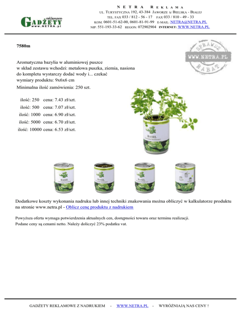 N E T R A R E K L A M A T 192, 43-384 JAWORZE k/ BIELSKA - BIAŁEJ UL. URYSTYCZNA TEL. FAX 033 / 812 - 56 - 17 FAX 033 / 810 - 49 - 33 KOM. 0601-51-62-00, 0601-81-91-99 E-MAIL: [email protected] NIP: 551-193-33-62 REGON: 072902904 INTERNET: WWW.NETRA.PL 7580m Aromatyczna bazylia w aluminiowej puszce w skład zestawu wchodzi: metalowa puszka, ziemia, nasiona do kompletu wystarczy dodać wody i... czekać wymiary produktu: 9x6x6 cm Minimalna ilość zamówienia: 250 szt. ilość: 250 cena: 7.43 zł/szt. ilość: 500 cena: 7.07 zł/szt. ilość: 1000 cena: 6.90 zł/szt. ilość: 5000 cena: 6.70 zł/szt. ilość: 10000 cena: 6.53 zł/szt. Dodatkowe koszty wykonania nadruku lub innej techniki znakowania można obliczyć w kalkulatorze produktu na stronie www.netra.pl - Oblicz cenę produktu z nadrukiem Powyższa oferta wymaga potwierdzenia aktualnych cen, dostępności towaru oraz terminu realizacji. Podane ceny są cenami netto. Należy doliczyć 23% podatku vat. GADŻETY REKLAMOWE Z NADRUKIEM - WWW.NETRA.PL - WYRÓŻNIAJĄ NAS CENY !