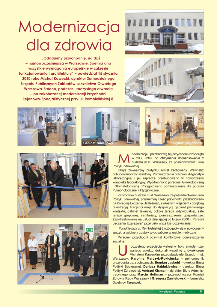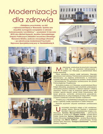 Modernizacja dla zdrowia „Oddajemy przychodnię, na dziś – najnowocześniejszą w Warszawie. Spełnia ona wszystkie wymagania europejskie w zakresie funkcjonowania i architektury” – powiedział 15 stycznia 2010 roku Michał Kawecki, dyrektor Samodzielnego Zespołu Publicznych Zakładów Lecznictwa Otwartego Warszawa-Bródno, podczas uroczystego otwarcia – po zakończonej modernizacji Przychodni Rejonowo-Specjalistycznej przy ul. Rembielińskiej 8. Rejestracja Korytarz przychodni Gabinet zabiegowy odernizację i przebudowę tej przychodni rozpoczęto w 2008 roku, po otrzymaniu dofinansowania z budżetu m.st. Warszawy, za pośrednictwem Biura Polityki Zdrowotnej. Obrys zewnętrzny budynku został zachowany. Wewnątrz dobudowano trzon windowy. Pomieszczenia pracowni diagnostyki laboratoryjnej i jej zaplecza przebudowano w nowoczesny kompleks laboratoryjny. Wyodrębniono poradnie: Ginekologiczną i Stomatologiczną. Przygotowano pomieszczenia dla poradni Pulmonologicznej i Ftyzjatrycznej. M Ze środków budżetu m.st. Warszawy, za pośrednictwem Biura Polityki Zdrowotnej, przyziemną część przychodni przebudowano na Poradnię Leczenia Uzależnień, z własnym wejściem i odrębną rejestracją. Pacjenci mają do dyspozycji gabinet pierwszego kontaktu, gabinet lekarski, pokoje terapii indywidualnej, sale terapii grupowej, sanitariaty, pomieszczenia gospodarcze. Zapotrzebowanie na usługi działającej od lutego 2006 r. Poradni Leczenia Uzależnień przerosło wszelkie oczekiwania. Poradnie przy ul. Rembielińskiej 8 wzbogaciły się w nowoczesny sprzęt, a gabinety zostały wyposażone w meble medyczne. Personel przychodni otrzymał komfortowe pomieszczenia socjalne. roczystego przecięcia wstęgi w holu zmodernizawanego obiektu dokonali wspólnie z dyrektorem Michałem Kaweckim przedstawiciele Urzędu m.st. Warszawy: Karolina Marczyk-Rokicińska – pełnomocnik prezydenta ds. społecznych, Bogdan Jaskołd – dyrektor Biura Polityki Społecznej, Dariusz Hajdukiewicz – dyrektor Biura Polityki Zdrowotnej, Andrzej Kicman – dyrektor Biura Administracyjnego oraz Marcin Hoffman – przewodniczący Komisji Zdrowia Rady Warszawy i Grzegorz Zawistowski – burmistrz Dzielnicy Targówek. U Kwartalnik Pacjenta 9 Karolina Marczyk-Rokicińska i Dariusz Hajdukiewicz Grzegorz Zawistowski, Marek Balicki i ks. Marcin Wójtowicz siądz prałat Marcin Wójtowicz z Dekanatu Targówka poświęcił i pobłogosławił przychodnię, a potem poszczególne poradnie. Wcześniej był tu pacjentem; na tej podstawie wyraził opinię, że w przychodni czuje się bezpośrednią, ciepłą relację między lekarzami i pacjentami. „Jesteśmy nastawieni szczególnie na ludzi starszych, chcemy zająć się ich problemami” zapewniał dyrektor Michał Kawecki. Wśród osiągnięć ubiegłego roku wymienił uruchomienie Poradni Geriatrycznej przy ul. Poborzańskiej 6. W poniedziałki przyjmuje pacjentów lekarz geriatra – jeden z pięciu w Warszawie lekarzy tej specjalności. W 2009 roku nawiązana została współpraca z grupą kobiet po mastektomii, które zorganizowały Koło Amazonek. W każdy poniedziałek w godz. 17-19 w sali konferencyjnej Przychodni Rejonowo-Specjalistycznej przy ul. Poborzańskiej 6 Koło Amazonek zaprasza kobiety z rozpoznanym nowotworem piersi – przed, w trakcie i po leczeniu. Kontakt telefoniczny: 22 519 85 88. rzy okazji otwarcia zmodernizowanej przychodni, kierownictwo i pracownicy SZPZLO zachęcają mieszkańców, by w 2010 roku częściej zaglądali tu – profilaktycznie. Realizowane będą zadania z zakresu promocji zdrowia dla młodzieży i dorosłych (w tym szczególnie dla kobiet w ciąży), m.in. „Zdrowie, Mama i Ja” oraz „Szkoła Rodzenia dla Mamy i Taty”. Szczegółowe informacje można uzyskać pod numerem 22 811 42 91 wewn. 105. a modernizację i przebudowę czekają Przychodnie przy ul. Łojewskiej 6, Tykocińskiej 32/34 oraz Majowej 4. Dyrektor Michał Kawecki poinformował, że Rada Społeczna SZPZLO Warszawa-Bródno podjęła uchwałę obligującą do podjęcia intensywnych działań, związanych z uruchomieniem Centrum Seniora. Wiąże się to z wykupem nieruchomości przy ul. Świdnickiej 6 A. Doceniając działania na rzecz seniorów, Oddział Rejonowy Warszawa–Targówek Polskiego Związku Emerytów, Rencistów i Inwalidów wystąpił do Zarządu Głównego PZER i I o nadanie Złotej Odznaki Honorowej Samodzielnemu Zespołowi Publicznych Zakłądów Lecznictwa Otwartego Warszawa–Bródno. Funkcjonowanie przychodni, zmodernizowanej kosztem 8,5 mln zł ze środków Urzędu Miasta i ZOZ Bródno, od pierwszego dnia utrudnia brak miejsc parkingowych. Do wejścia nie może podjechać nawet karetka pogotowia ratuknowego. K. K Gratulacje składa Grażyna Napierska – Dyrektor SZPZLO Warszawa-Ursynów Od lewej: Halina Bandrowska – Kierownik Przychodni przy ul. Rembielińskiej 8, Elżbieta Szkopek – Z-ca Kierownika ds. Pielęgniarstwa. 10 Kwartalnik Pacjenta P N Nowa Gazeta Praska, nr 2 (421), z 20 stycznia 2010 r Remigiusz Sikora – Przewodniczący PZER i I WarszawaTargówek przypina Złotą Odznakę Honorową Michałowi Kaweckiemu – Dyrektorowi SZPZLO Warszawa-Bródno.