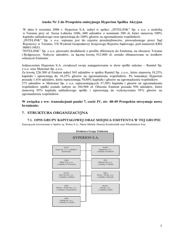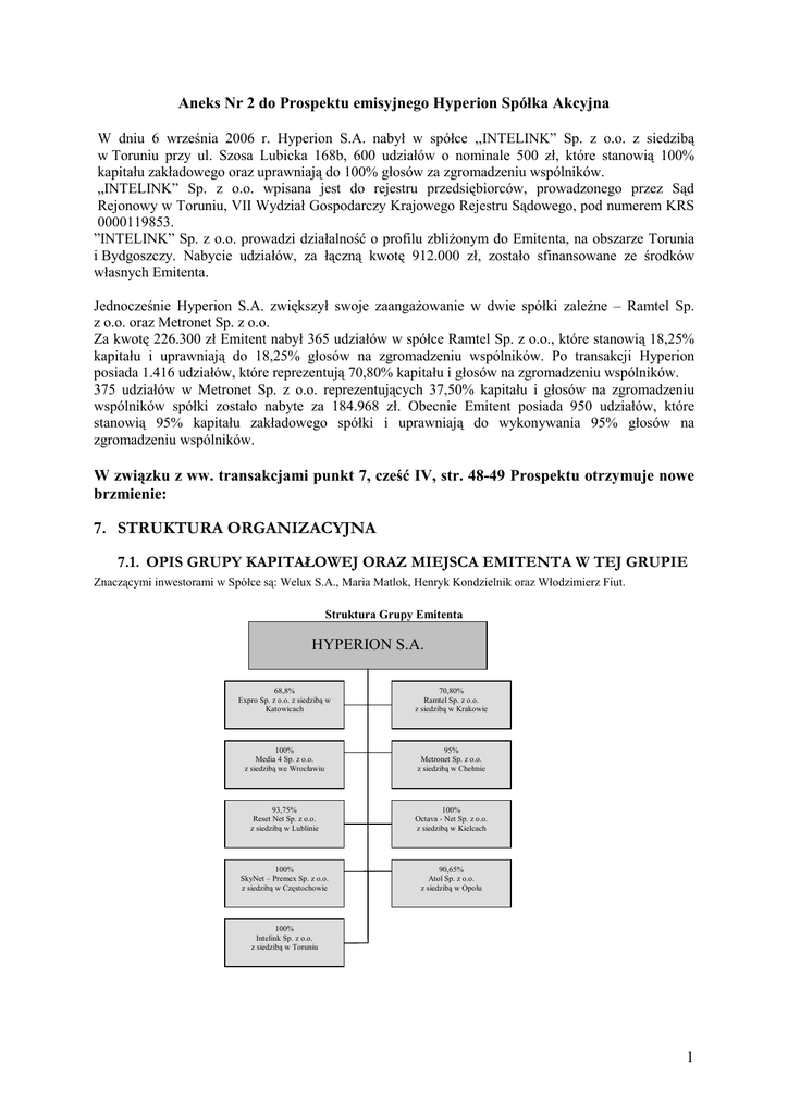 Aneks Nr 2 do Prospektu emisyjnego Hyperion Spółka Akcyjna W dniu 6 września 2006 r. Hyperion S.A. nabył w spółce ,,INTELINK” Sp. z o.o. z siedzibą w Toruniu przy ul. Szosa Lubicka 168b, 600 udziałów o nominale 500 zł, które stanowią 100% kapitału zakładowego oraz uprawniają do 100% głosów za zgromadzeniu wspólników. „INTELINK” Sp. z o.o. wpisana jest do rejestru przedsiębiorców, prowadzonego przez Sąd Rejonowy w Toruniu, VII Wydział Gospodarczy Krajowego Rejestru Sądowego, pod numerem KRS 0000119853. ”INTELINK” Sp. z o.o. prowadzi działalność o profilu zbliżonym do Emitenta, na obszarze Torunia i Bydgoszczy. Nabycie udziałów, za łączną kwotę 912.000 zł, zostało sfinansowane ze środków własnych Emitenta. Jednocześnie Hyperion S.A. zwiększył swoje zaangażowanie w dwie spółki zależne – Ramtel Sp. z o.o. oraz Metronet Sp. z o.o. Za kwotę 226.300 zł Emitent nabył 365 udziałów w spółce Ramtel Sp. z o.o., które stanowią 18,25% kapitału i uprawniają do 18,25% głosów na zgromadzeniu wspólników. Po transakcji Hyperion posiada 1.416 udziałów, które reprezentują 70,80% kapitału i głosów na zgromadzeniu wspólników. 375 udziałów w Metronet Sp. z o.o. reprezentujących 37,50% kapitału i głosów na zgromadzeniu wspólników spółki zostało nabyte za 184.968 zł. Obecnie Emitent posiada 950 udziałów, które stanowią 95% kapitału zakładowego spółki i uprawniają do wykonywania 95% głosów na zgromadzeniu wspólników. W związku z ww. transakcjami punkt 7, cześć IV, str. 48-49 Prospektu otrzymuje nowe brzmienie: 7. STRUKTURA ORGANIZACYJNA 7.1. OPIS GRUPY KAPITAŁOWEJ ORAZ MIEJSCA EMITENTA W TEJ GRUPIE Znaczącymi inwestorami w Spółce są: Welux S.A., Maria Matlok, Henryk Kondzielnik oraz Włodzimierz Fiut. Struktura Grupy Emitenta HYPERION S.A. 68,8% Expro Sp. z o.o. z siedzibą w Katowicach 70,80% Ramtel Sp. z o.o. z siedzibą w Krakowie 100% Media 4 Sp. z o.o. z siedzibą we Wrocławiu 95% Metronet Sp. z o.o. z siedzibą w Chełmie 93,75% Reset Net Sp. z o.o. z siedzibą w Lublinie 100% Octava - Net Sp. z o.o. z siedzibą w Kielcach 100% SkyNet – Premex Sp. z o.o. z siedzibą w Częstochowie 90,65% Atol Sp. z o.o. z siedzibą w Opolu 100% Intelink Sp. z o.o. z siedzibą w Toruniu 1 7.2. WYKAZ ISTOTNYCH PODMIOTÓW ZALEŻNYCH EMITENTA Emitent jest podmiotem dominującym wobec następujących spółek zależnych: • Expro sp. z o.o. z siedzibą w Katowicach ul. Kolista 25, • Ramtel sp. z o.o. z siedzibą w Krakowie ul. Zachodnia 7/5a, • Media 4 sp. z o.o. z siedzibą we Wrocławiu ul. Gubińska 10, • Metronet sp. z o.o. z siedzibą w Chełmie ul. Zachodnia 19, • Reset Net sp. z o.o. z siedzibą w Lublinie al. Spółdzielczości Pracy nr 34 lok. 18, • SkyNet – Premex sp. z o.o. z siedzibą w Częstochowie ul. Racławicka 2, • Octava – Net sp. z o.o. z siedzibą w Kielcach ul. Warszawska nr 155 lok. 11, • Atol sp. z o.o. z siedzibą w Opolu ul. Plebiscytowa 18, • Intelink sp. z o.o. z siedzibą w Toruniu, ul. Szosa Lubicka 168b. Zmianie uległ również punkt 25, część IV Prospektu: Str. 175 Było: Emitent posiada następujące udziały w innych przedsiębiorstwach: Ilość Wartość Nazwa spółki Adres posiadanych nominalna udziałów udziału 20-147 Lublin, Reset Net sp. z o.o. 500 Al. Spółdzielczości 1 125 z siedzibą w Lublinie pracy 34, lok. 18 Ramtel sp. z o.o. z siedzibą 30-350 Kraków, 1 051 500 w Krakowie ul. Zachodnia 7/5a Skynet Premex sp. z o.o. 42-200 Częstochowa, 200 500 z siedzibą w Częstochowie ul. Racławicka 2 25-147 Kielce, Octava-Net sp. z o.o. z ul. Warszawska 155, 100 4 000 siedzibą w Kielcach lok 11 Expro sp. z o.o. z siedzibą 40-486 Katowice, 530 1 000 w Katowicach ul. Kolista 25 Metronet sp. z o.o. 22-100 Chełm, 575 50 z siedzibą w Chełmie ul. Zachodnia 19 Atol sp. z o.o. z siedzibą 45-361 Opole, 291 500 w Opolu ul. Plebiscytowa 18 Media 4 sp. z o.o. 53-434 Wrocław, 1 250 133 z siedzibą we Wrocławiu ul. Gubińska 10 Łączna wartość Łączny kapitał Udział procentowy w kapitale 562 500 600 000 93,75% 525 500 1 000 000 52,55% 100 000 100 000 100,00% 400 000 400 000 100,00% 530 000 770 000 68,83% 28 750 25.000 51,00% 145 500 160 500 90,65% 166 250 166 250 100,00% Jest: Emitent posiada następujące udziały w innych przedsiębiorstwach: Ilość Wartość Nazwa spółki Adres posiadanych nominalna udziałów udziału 20-147 Lublin, Reset Net sp. z o.o. Al. Spółdzielczości 1 125 500 z siedzibą w Lublinie pracy 34, lok. 18 Ramtel sp. z o.o. z siedzibą 30-350 Kraków, 1 416 500 w Krakowie ul. Zachodnia 7/5a Skynet Premex sp. z o.o. 42-200 Częstochowa, 200 500 z siedzibą w Częstochowie ul. Racławicka 2 25-147 Kielce, Octava-Net sp. z o.o. z 4 000 100 ul. Warszawska 155, siedzibą w Kielcach lok 11 Expro sp. z o.o. z siedzibą 40-486 Katowice, 530 1 000 w Katowicach ul. Kolista 25 Metronet sp. z o.o. 22-100 Chełm, 950 50 z siedzibą w Chełmie ul. Zachodnia 19 Atol sp. z o.o. z siedzibą 45-361 Opole, 291 500 w Opolu ul. Plebiscytowa 18 Media 4 sp. z o.o. 53-434 Wrocław, 133 1 250 z siedzibą we Wrocławiu ul. Gubińska 10 87-100 Toruń, Intelink sp. z o.o. z siedzibą ul. Szosa Lubicka 600 500 w Toruniu 168b Łączna wartość Łączny kapitał Udział procentowy w kapitale 562 500 600 000 93,75% 708 000 1 000 000 70,80% 100 000 100 000 100,00% 400 000 400 000 100,00% 530 000 770 000 68,83% 47 500 50.000 95,00% 145 500 160 500 90,65% 166 250 166 250 100,00% 300 000 300 000 100,00% 2 Str. 176 Było: Ramtel spółka z o.o. z siedzibą w Krakowie - Emitent posiada 52,55% w kapitale zakładowym Spółki i 69% głosów na Zgromadzeniu Wspólników Spółki. Jest: Ramtel spółka z o.o. z siedzibą w Krakowie - Emitent posiada 70,80% w kapitale zakładowym Spółki i 70,80% głosów na Zgromadzeniu Wspólników Spółki. Str. 177 Było: Metronet spółka z o.o. z siedzibą w Chełmie - Emitent posiada 51,00% w kapitale zakładowym Spółki 
