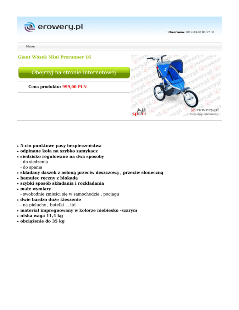 Utworzono: 2017-03-08 00:57:00 Menu: Giant Wózek Mini Prerunner 16 Obejrzyj na stronie internetowej Cena produktu: 999,00 PLN ● ● ● ● ● ● ● ● ● ● ● 5-cio punktowe pasy bezpieczeństwa odpinane koła na szybko zamykacz siedzisko regulowane na dwa sposoby - do siedzenia - do spania składany daszek z osłoną przeciw deszczową , przeciw słoneczną hamulec ręczny z blokadą szybki sposób składania i rozkładania małe wymiary - swobodnie zmieści się w samochodzie , pociagu dwie bardzo duże kieszenie - na pieluchy , butelki ... itd materiał impregnowany w kolorze niebiesko -szarym niska waga 11,4 kg obciążenie do 35 kg Waga 11,4 kg stelaż aluminiowy hamulec ręczny z blokadą rozmiar kół 16" pasy bezpieczeństwa TAK Mimo dołożenia wszelkich starań nie gwarantujemy, że publikowane opisy i specyfikacje techniczne niezawierają uchybień lub błędów, które nie mogą jednak być podstawą do roszczeń. W przypadku jakichkolwiek wątpliwości, przed podjęciem decyzji prosimy o kontakt. Adres: www.erowery.pl Telefon: 605 515 185, 34 361 16 71 Email: [email protected]